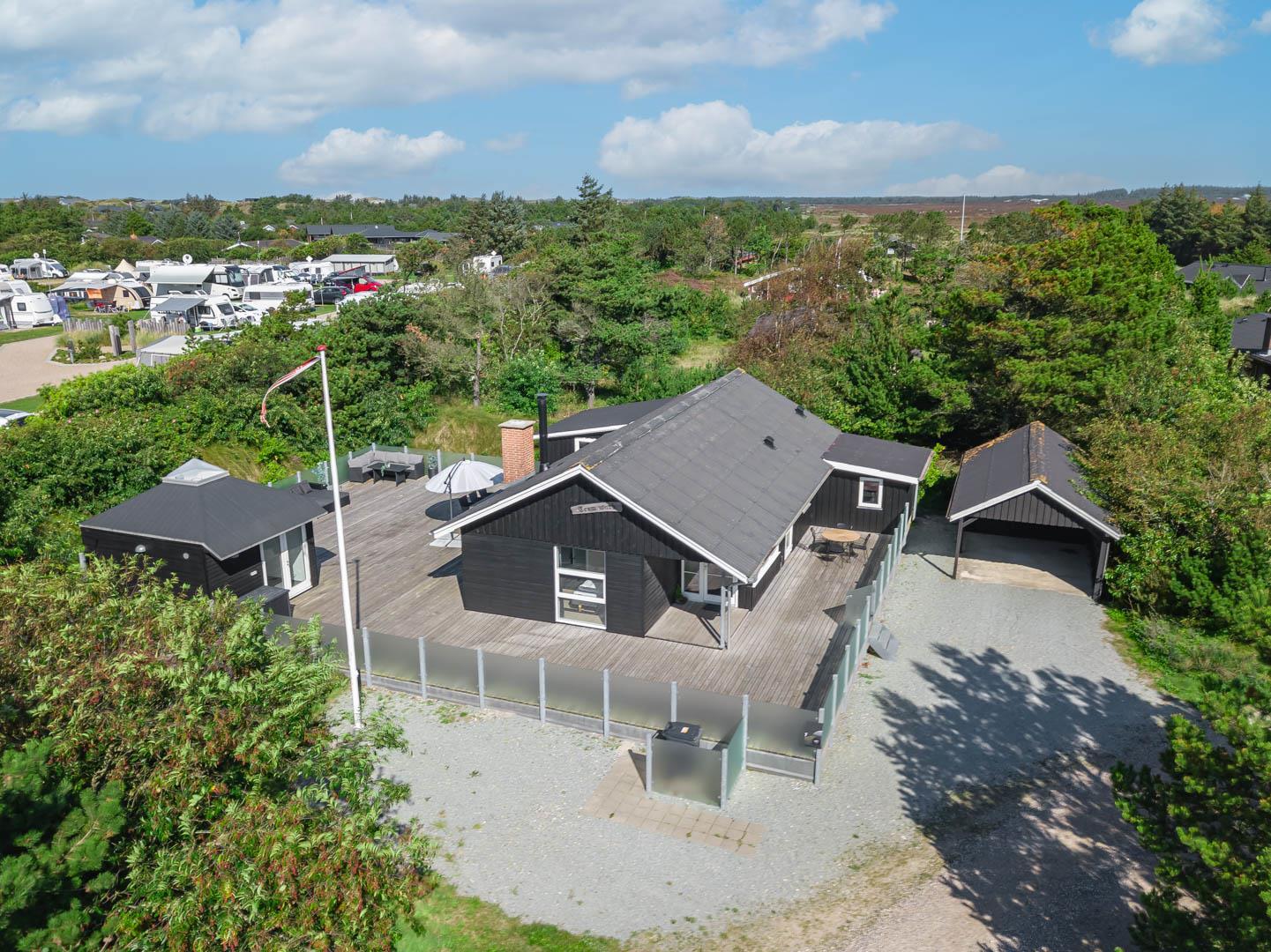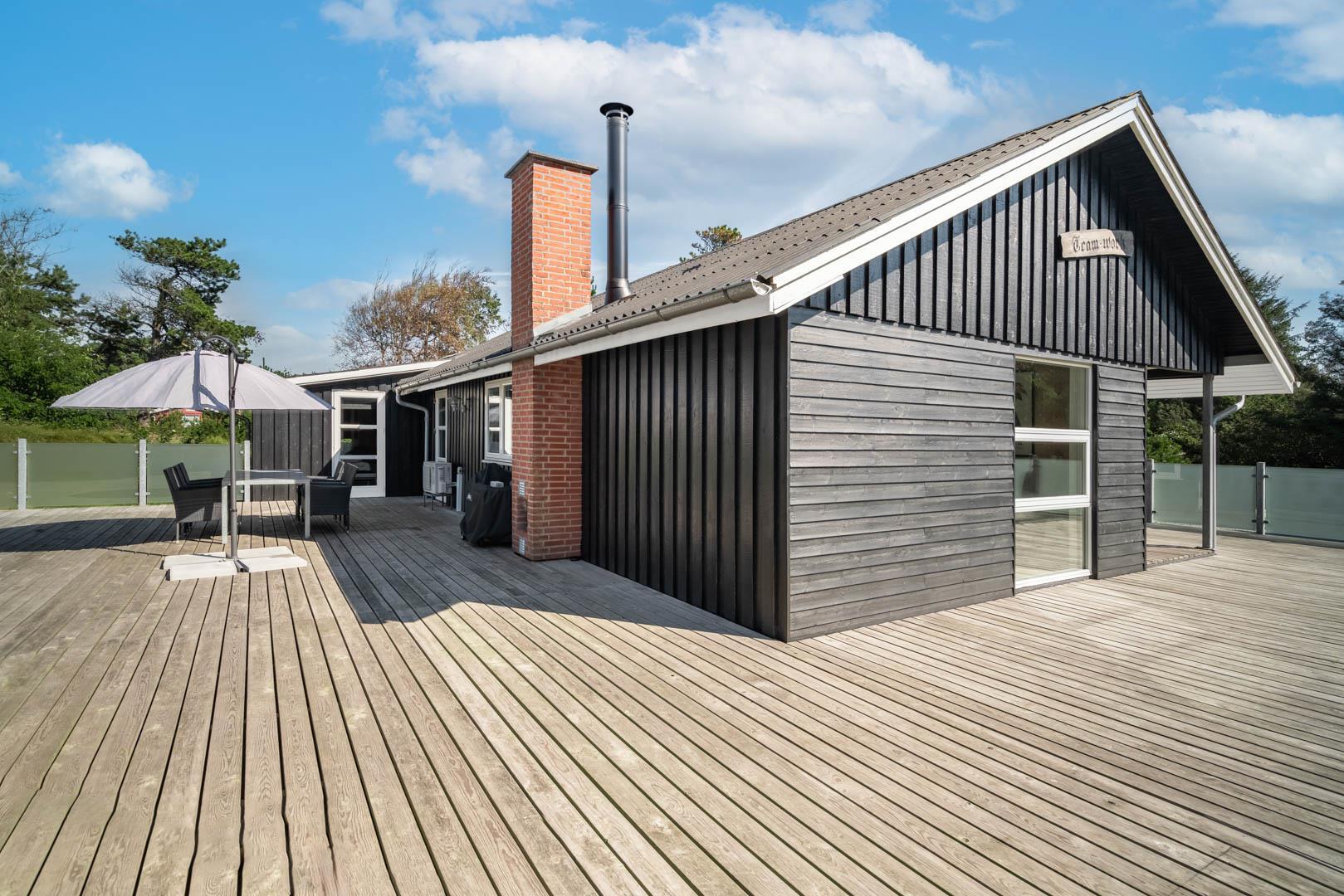 Hyggeligt feriehus med sauna, brændeovn og stor lukket terrasse nær Vesterhavet og Henne Strand.