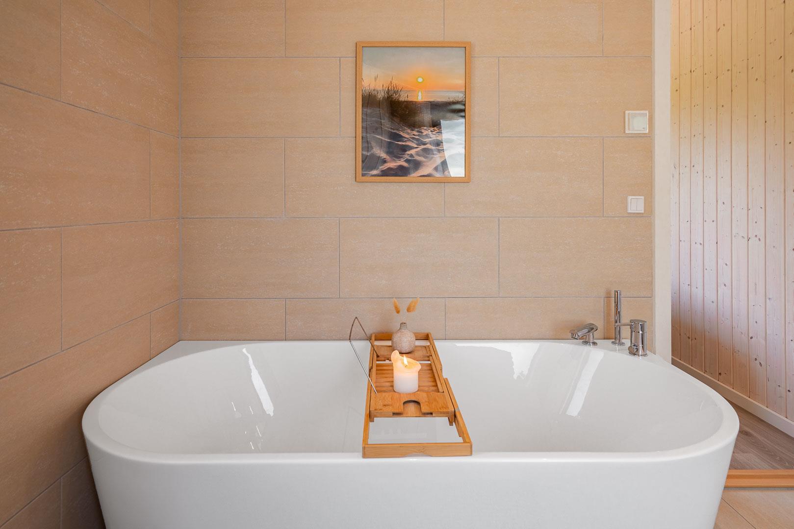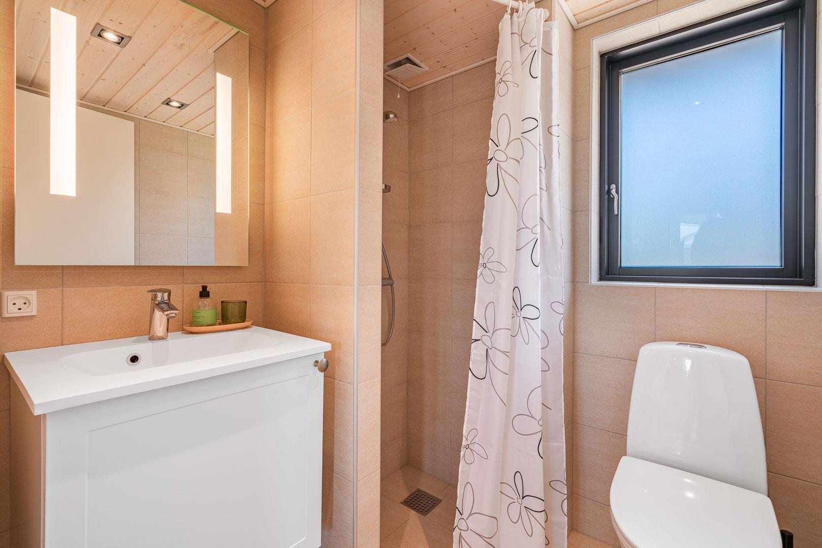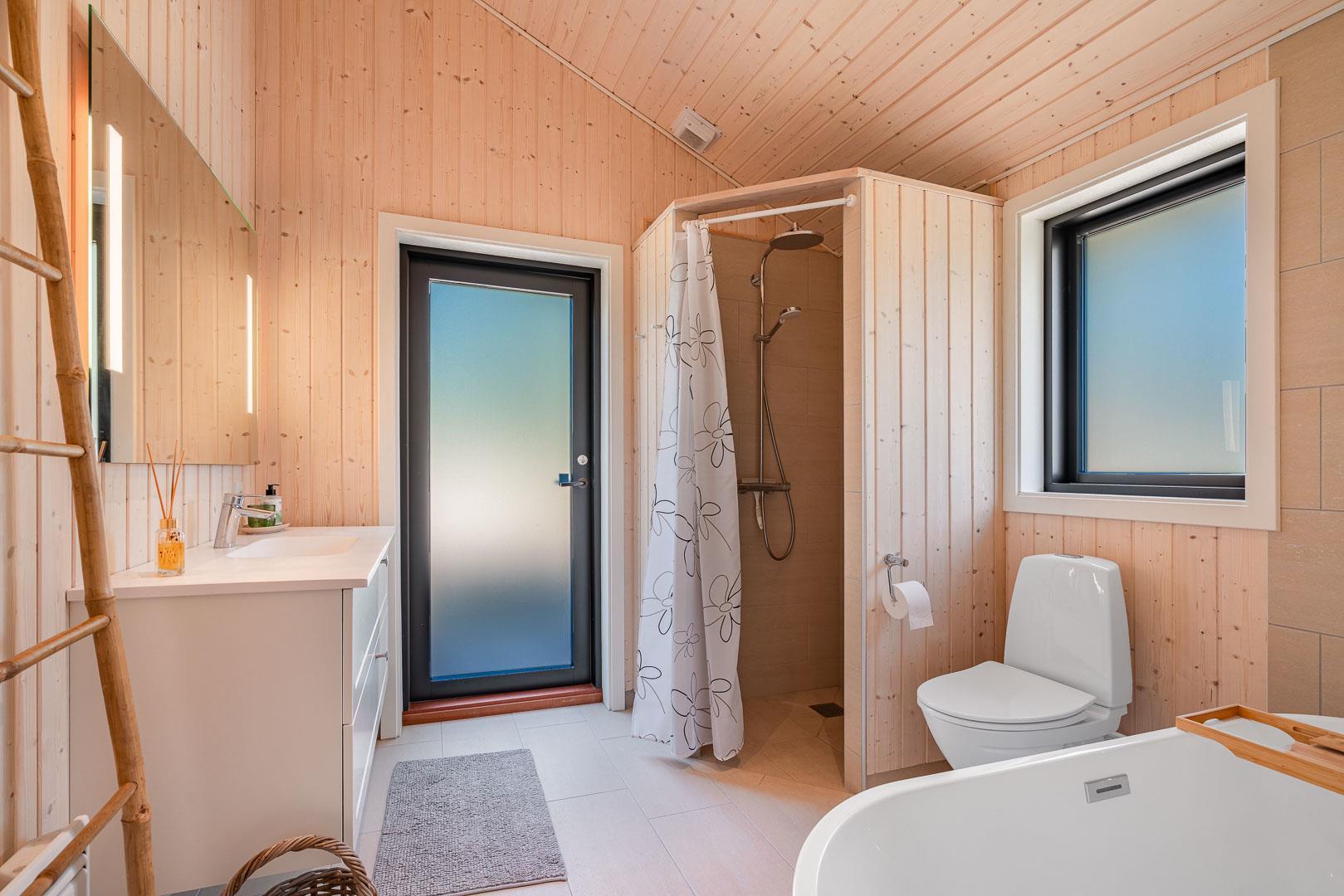 2 flotte badeværelser med gulvvarme. Badekar. Der er også udebruser.