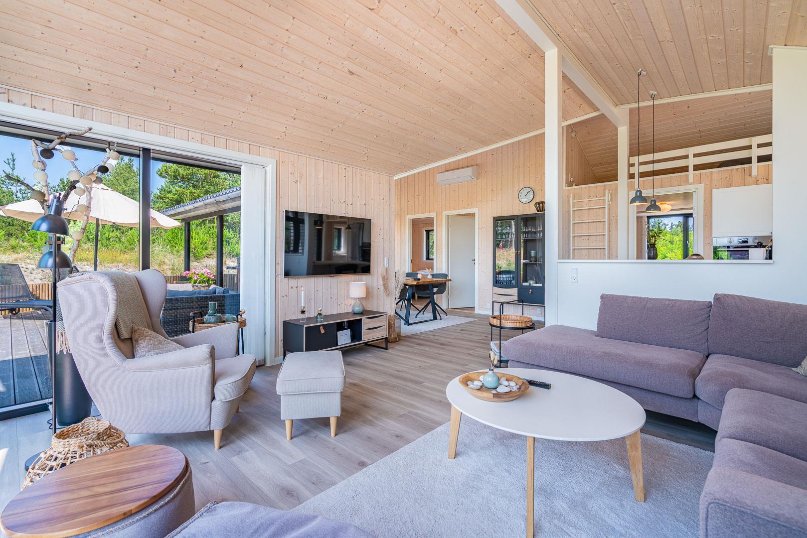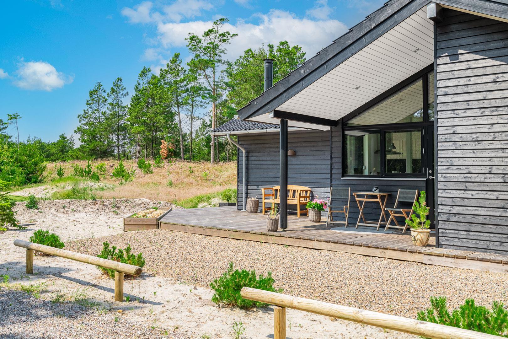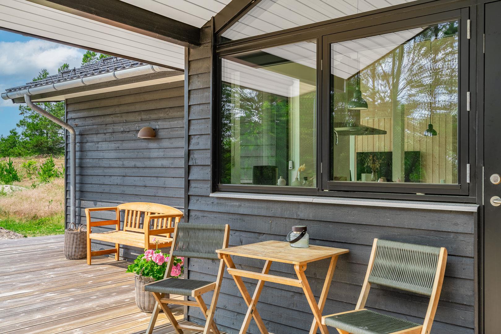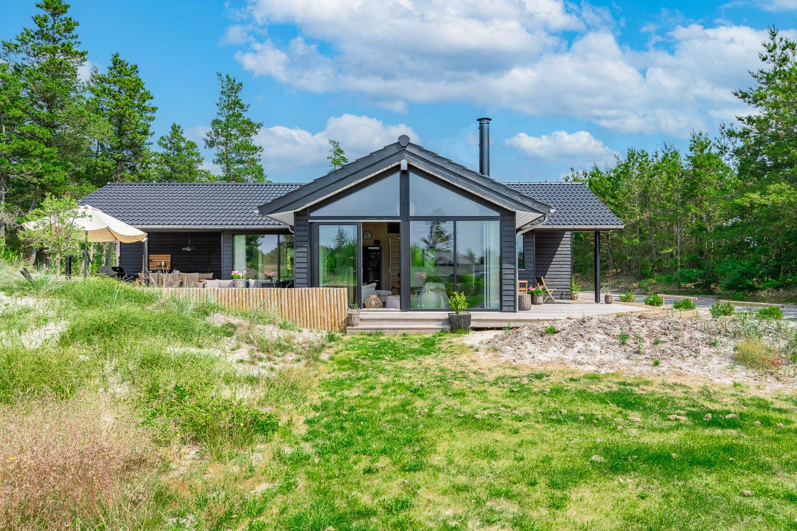 Sommerhuset er opført i 2022 og har en komfortabel og praktisk planløsning med større køkken/alrum med store panoramavinduer med udsigt over naturgrunden. Herfra er der direkte udgang til delvis overdækket sydvendt træbelagt terrasse.