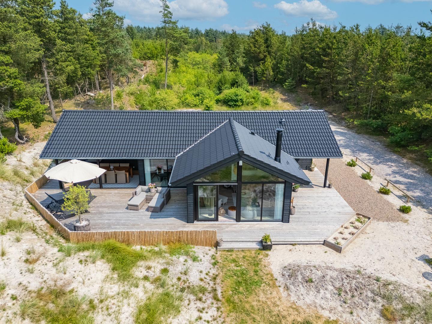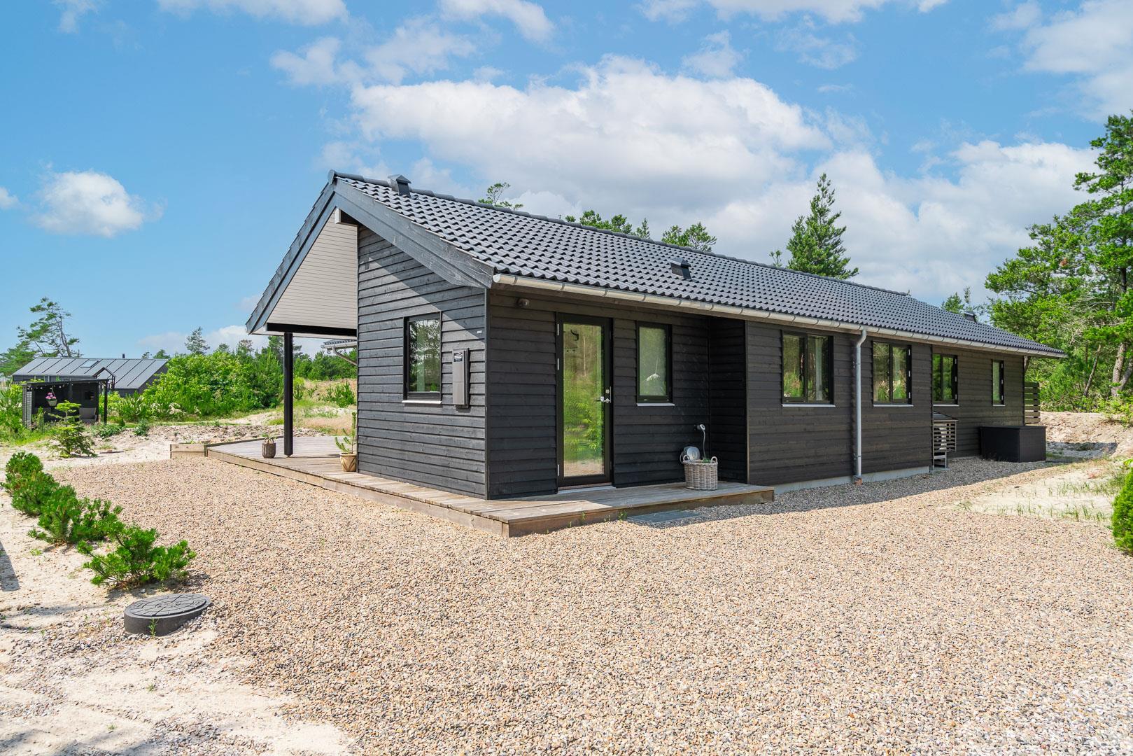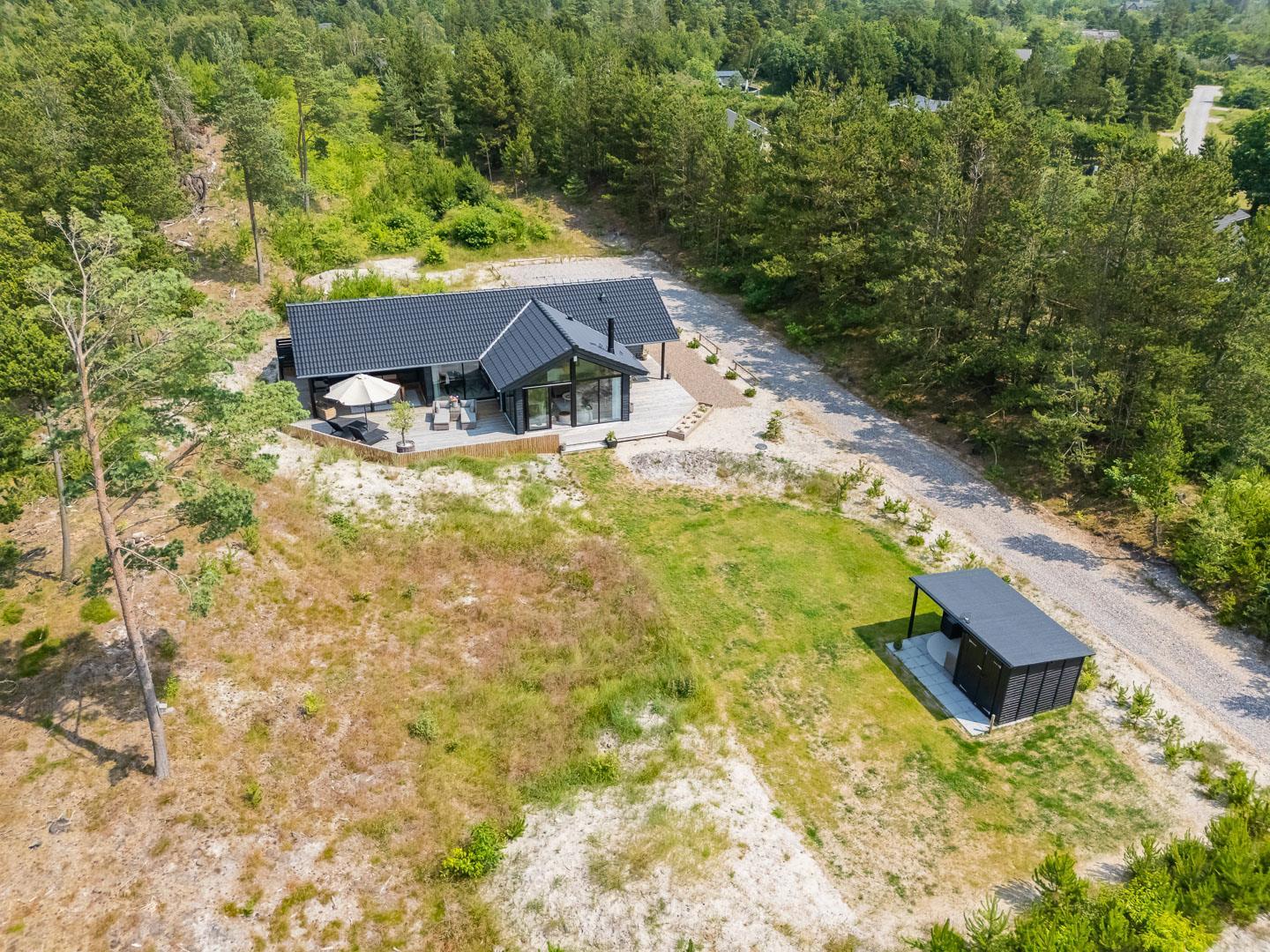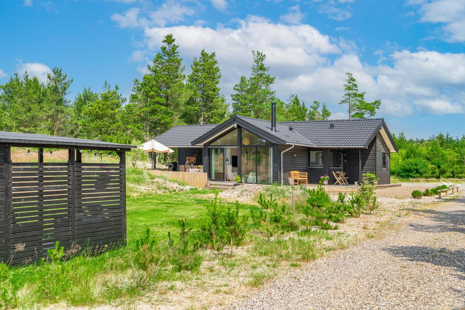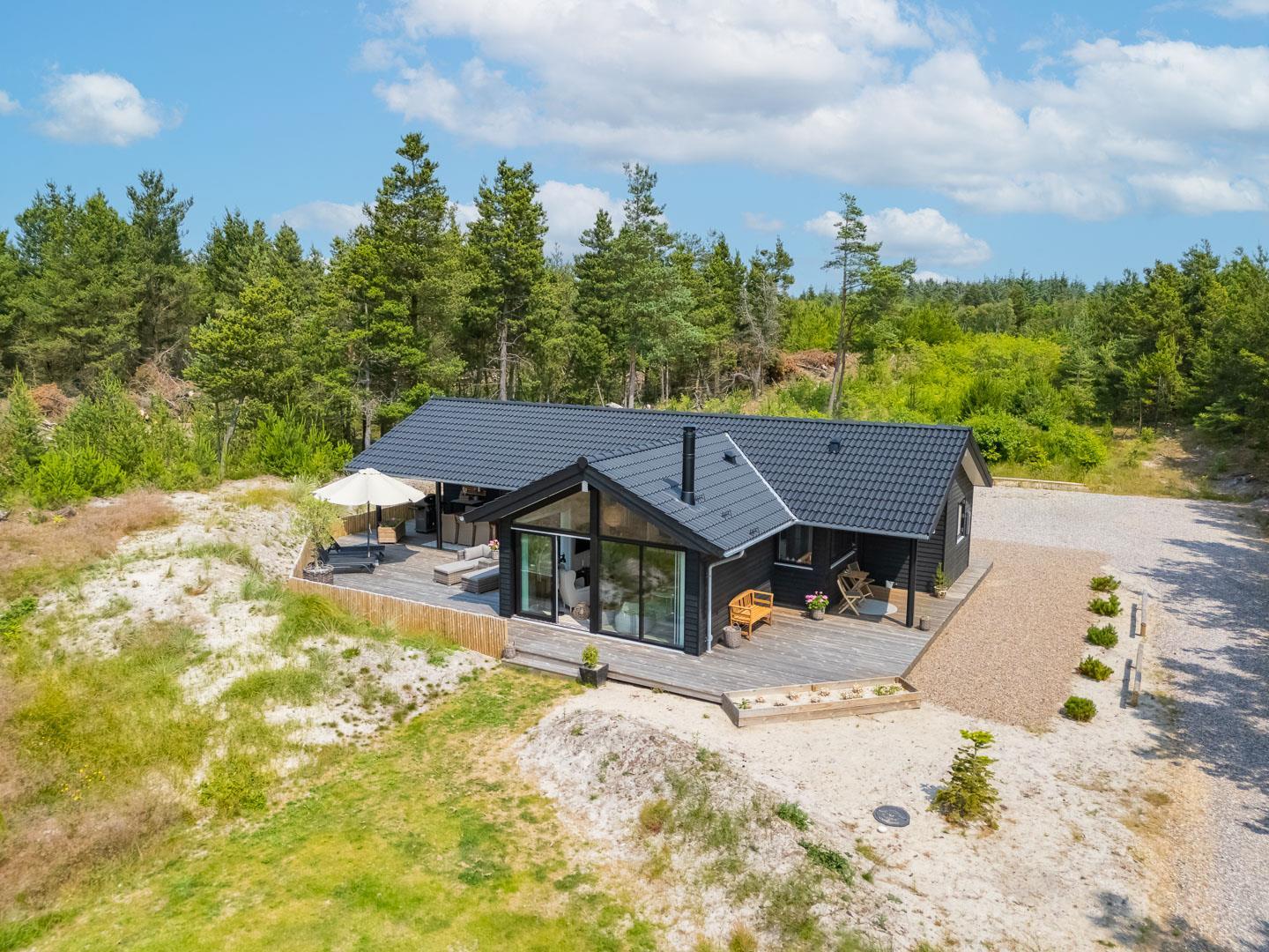 Nyere sommerhus med en unik planløsning, beliggende for enden af grusbelagt vej, med Lyngbos Hede som nærmeste nabo.