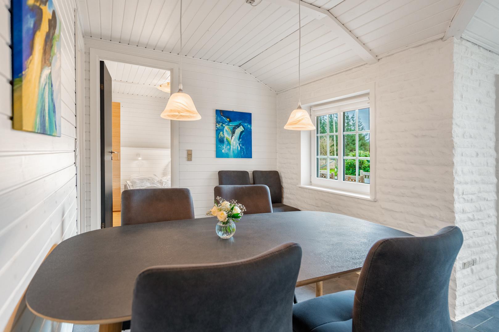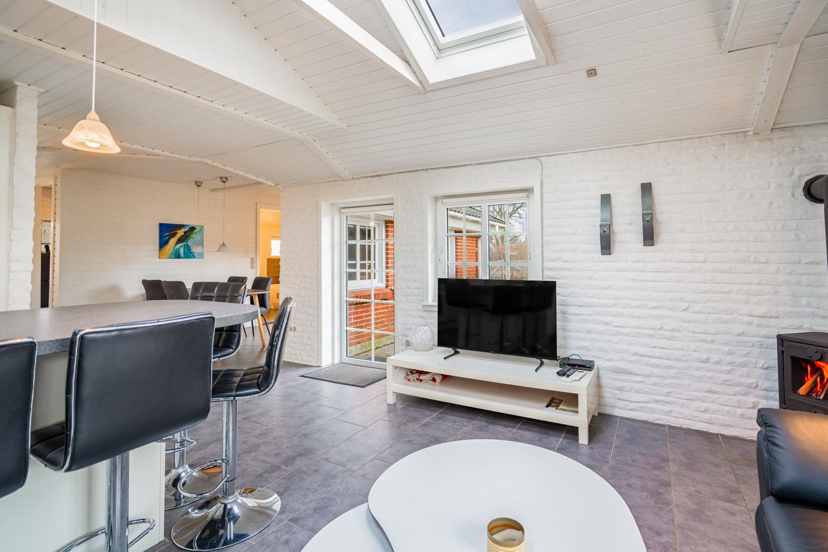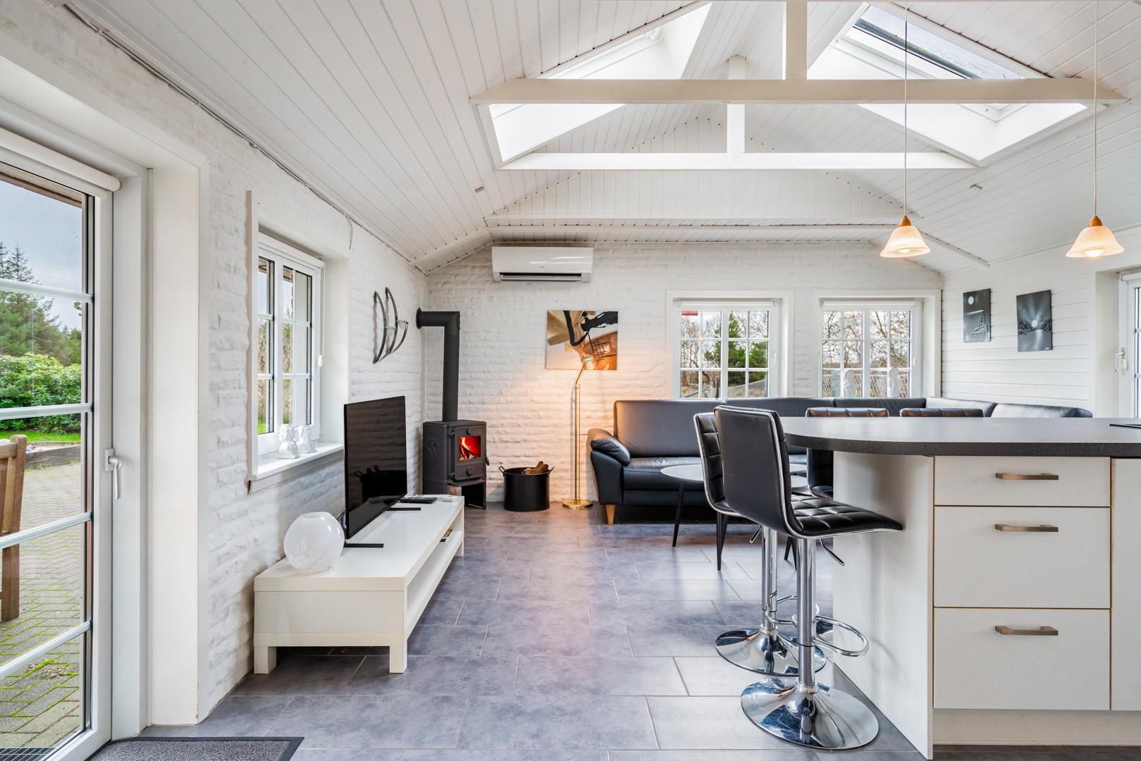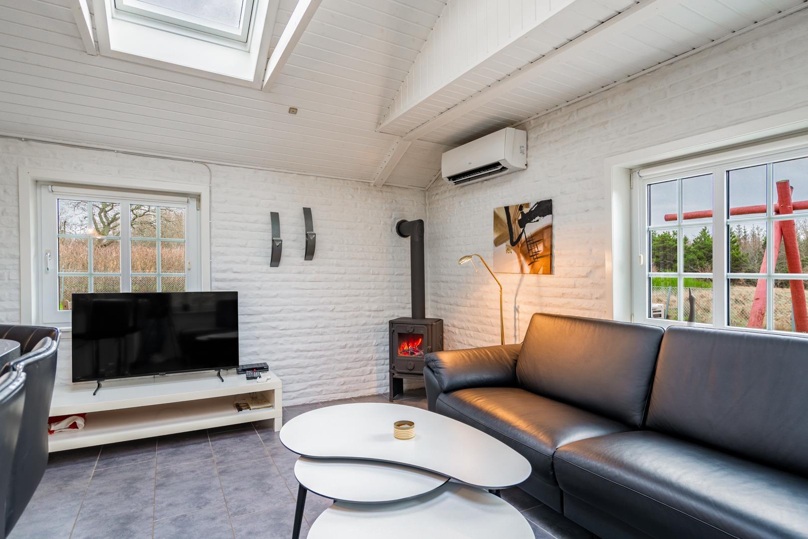 Den lyse opholdsstue med brændeovn skaber ægte sommerhusstemning året rundt. På køligere dage er der intet bedre end at nyde varmen fra ilden. Sommerhuset er desuden udstyret med en energivenlige varmepumpe.