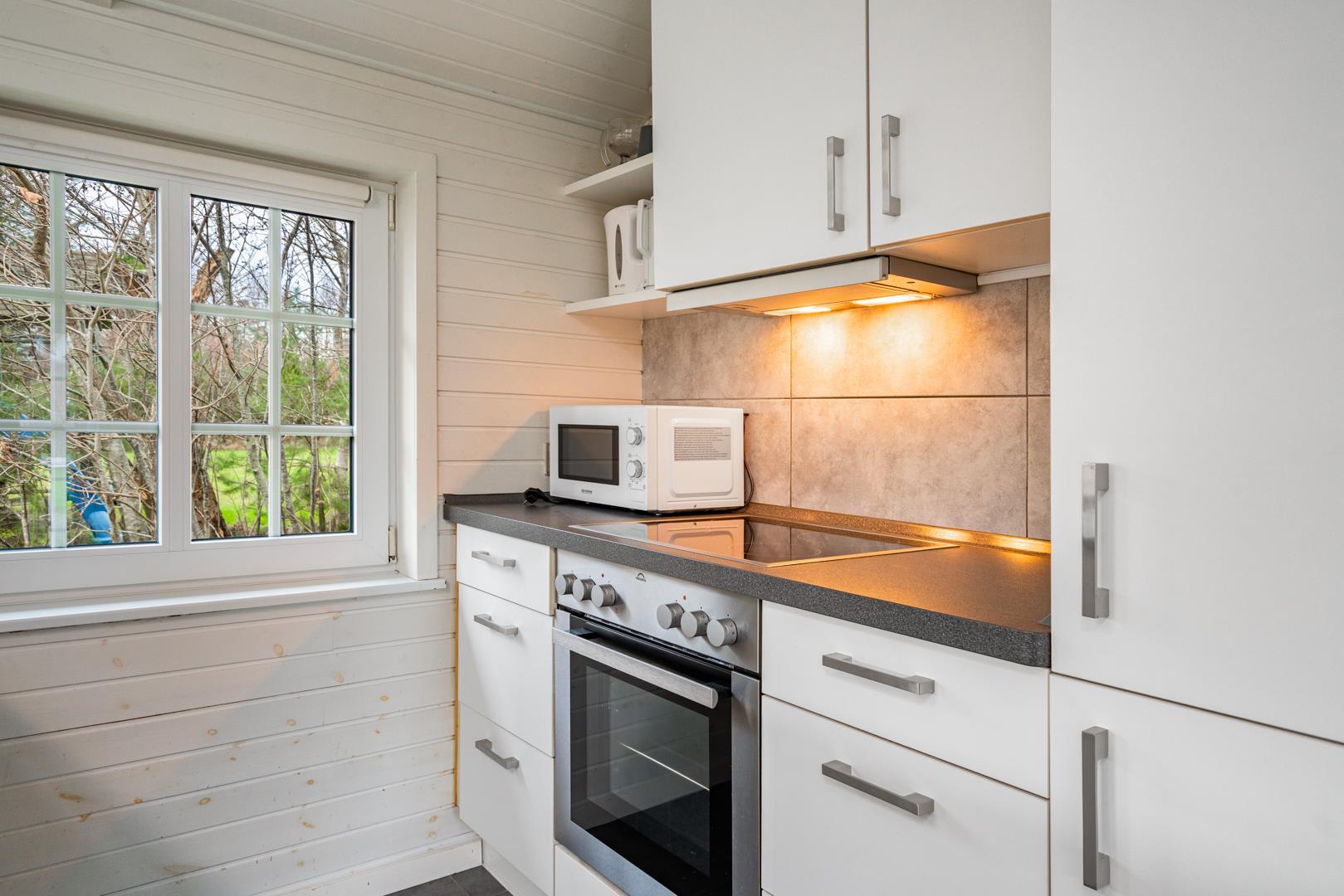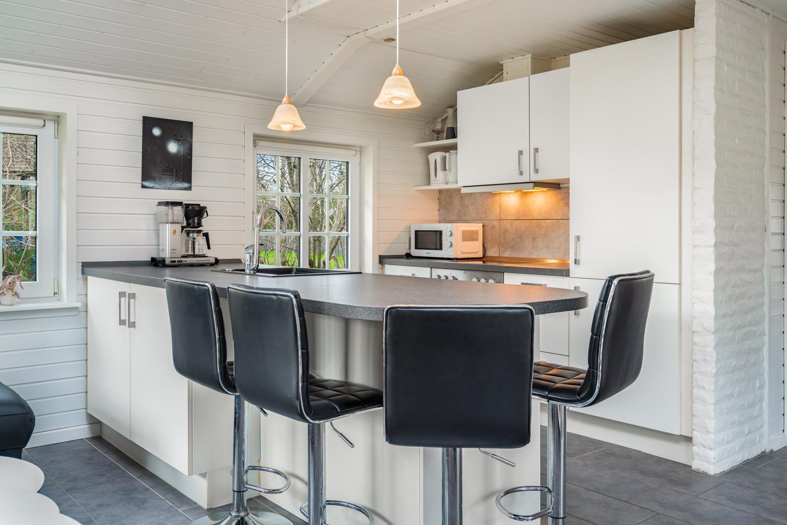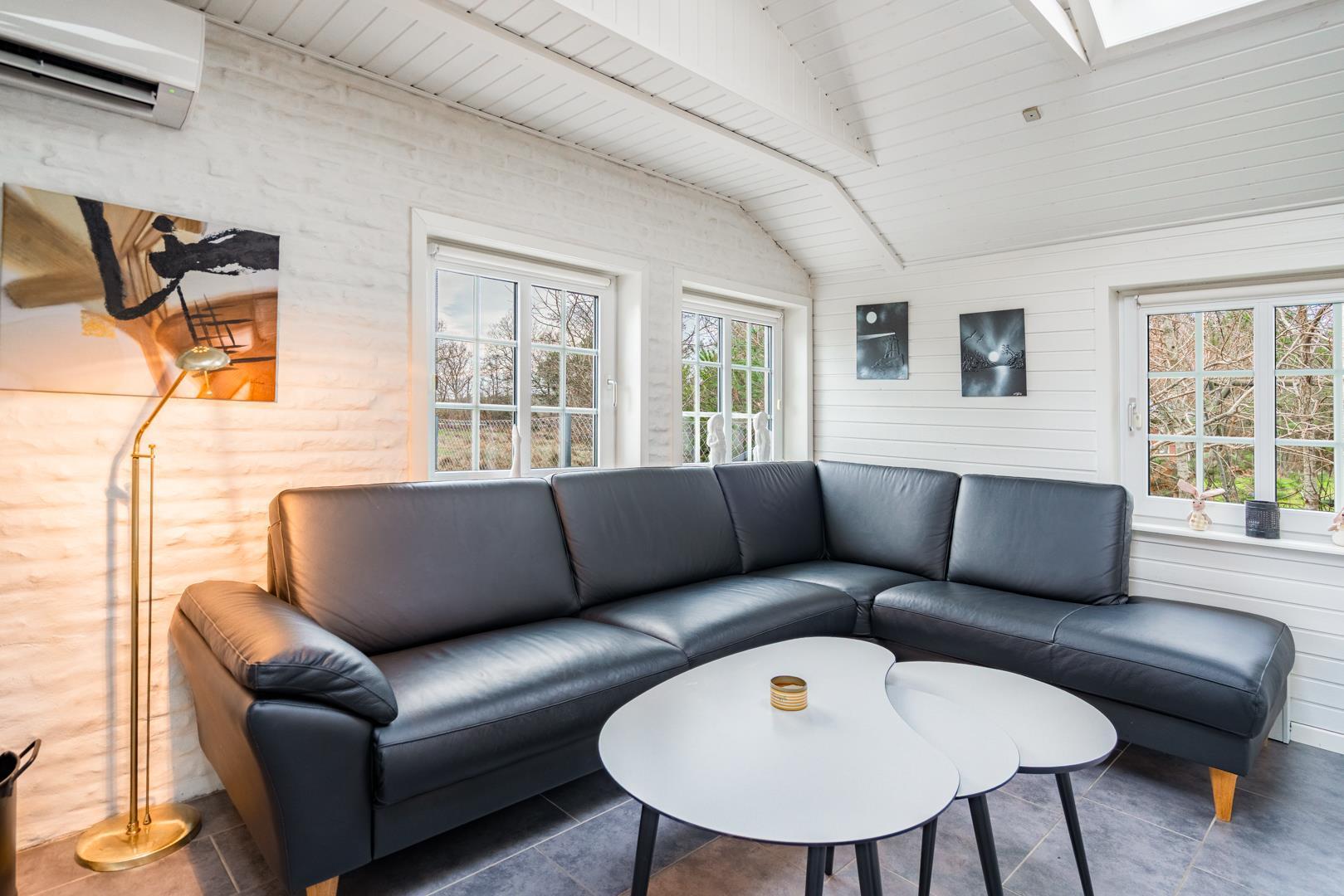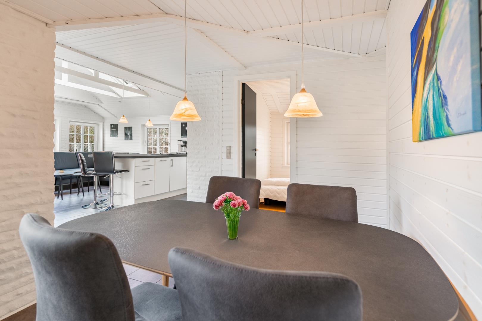 Den lyse opholdsstue med brændeovn skaber ægte sommerhusstemning året rundt. På køligere dage er der intet bedre end at nyde varmen fra ilden. Sommerhuset er desuden udstyret med en energivenlige varmepumpe.