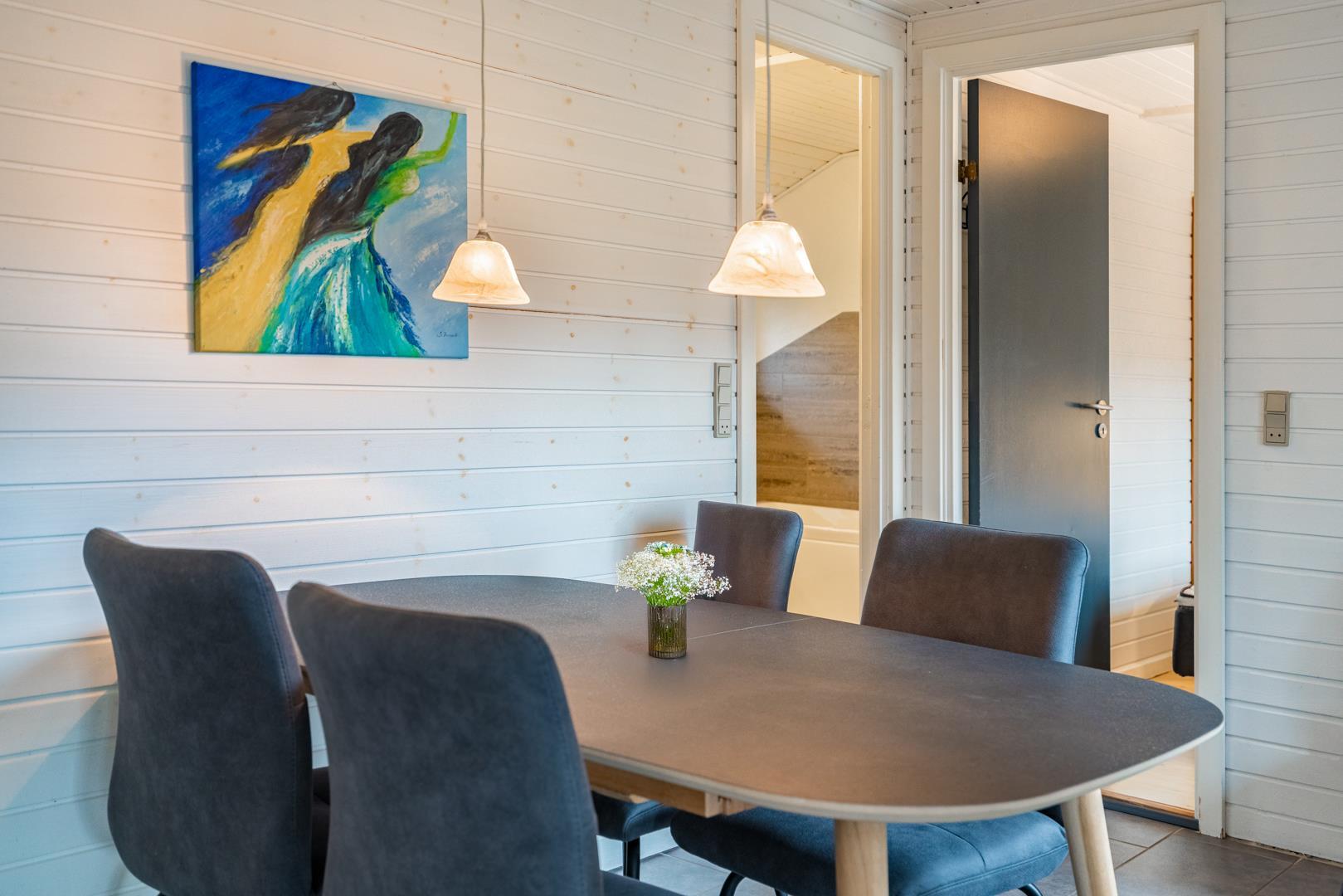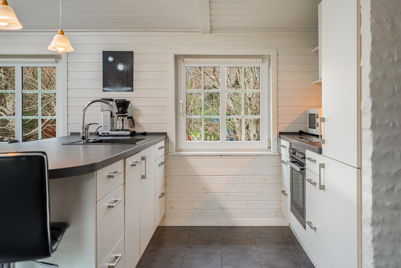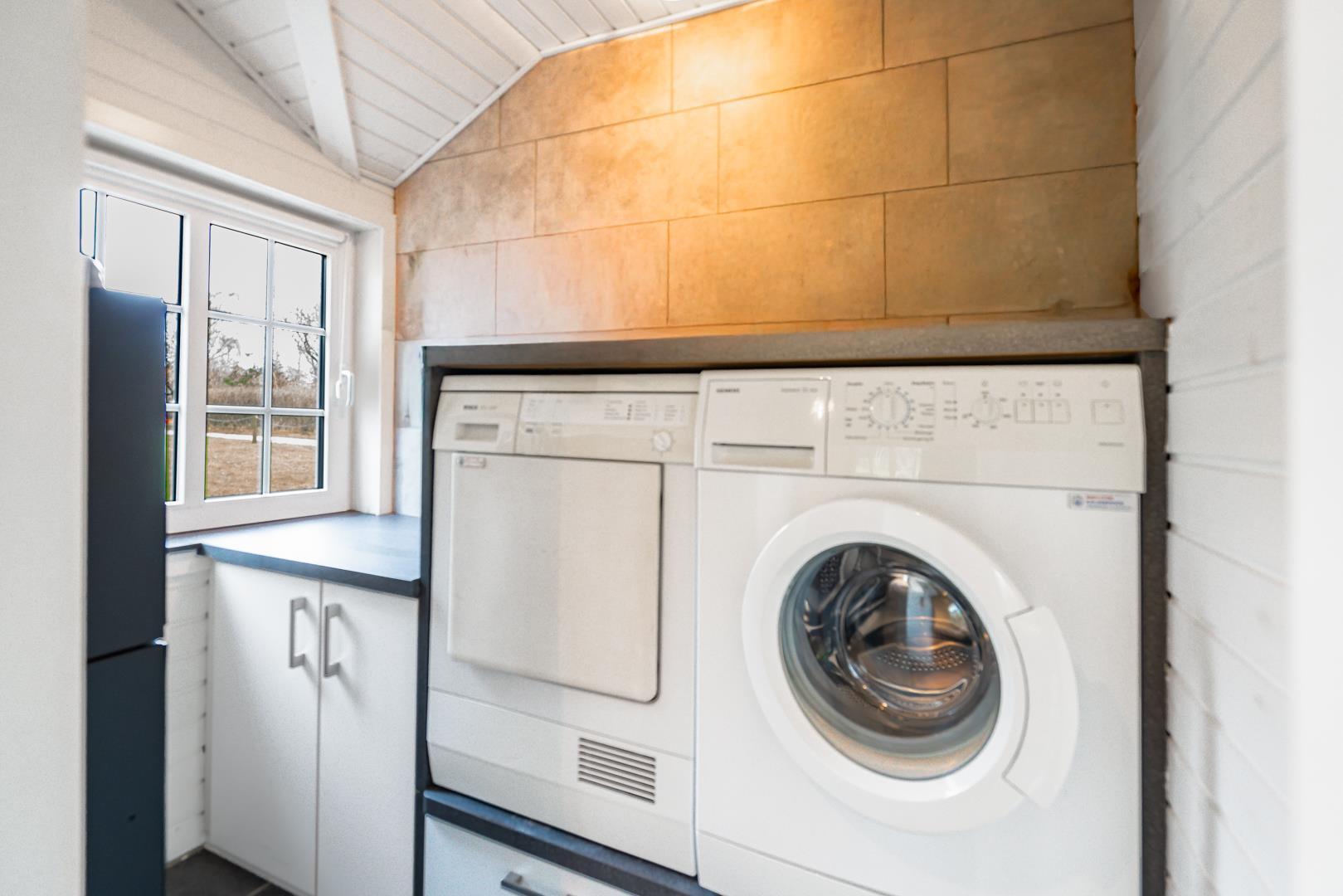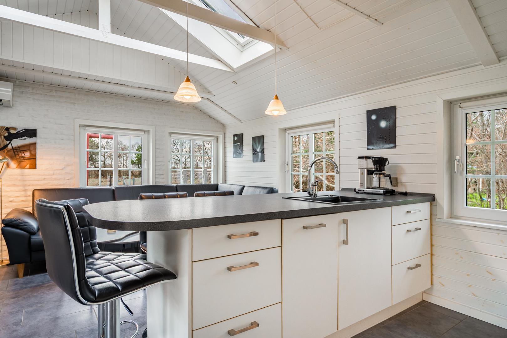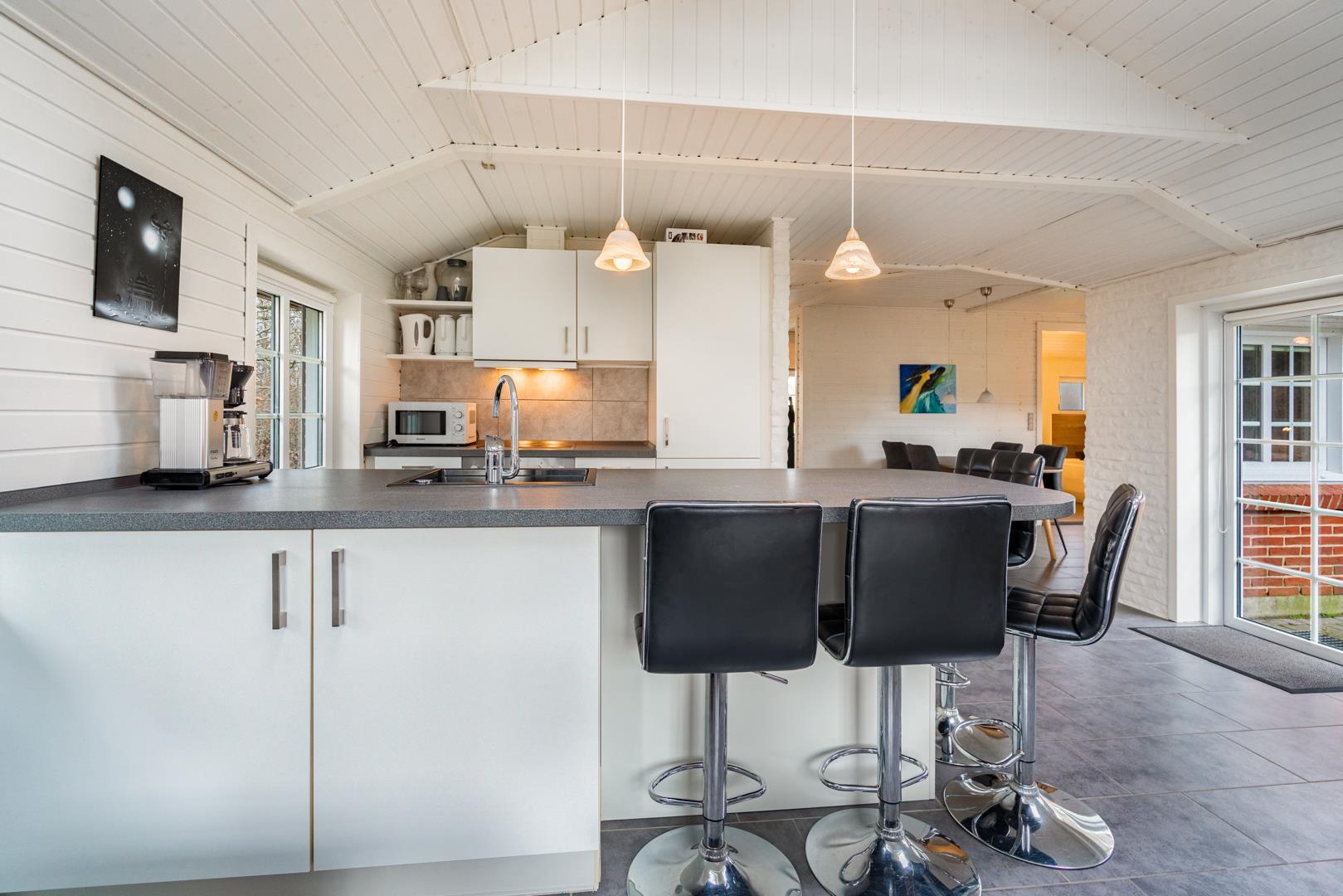 Det åbne køkken er moderne indrettet med opvaskemaskine og alt, hvad du har brug for til en afslappet ferie i Henne Strand. Til længere ophold er der også vaskemaskine og tørretumbler – særligt praktisk for familier.