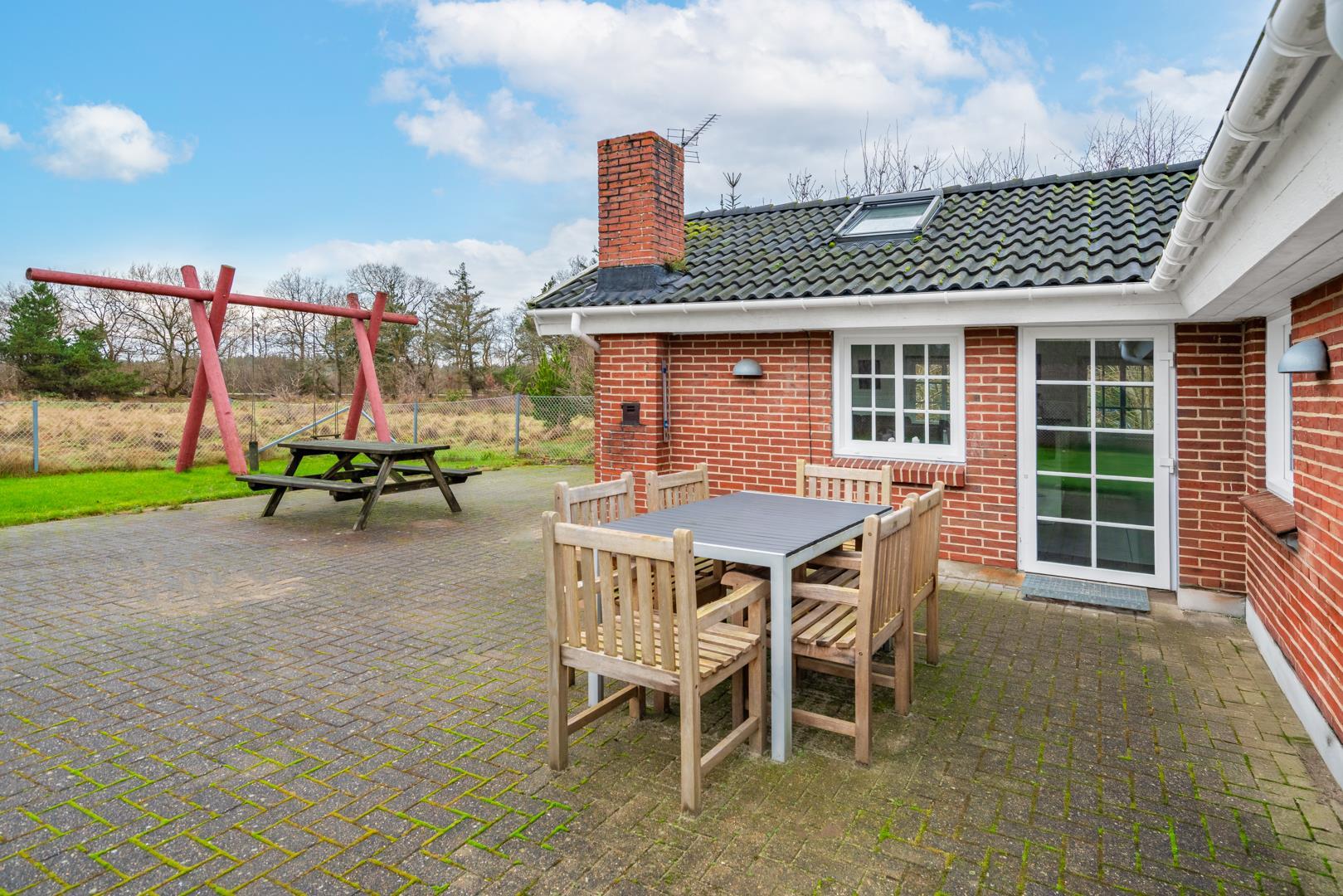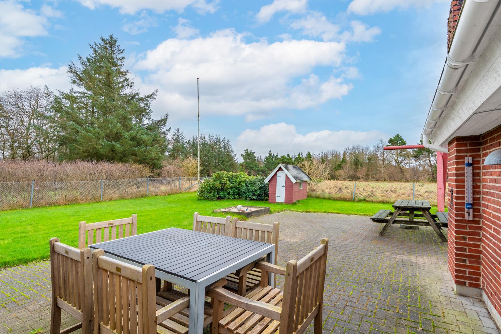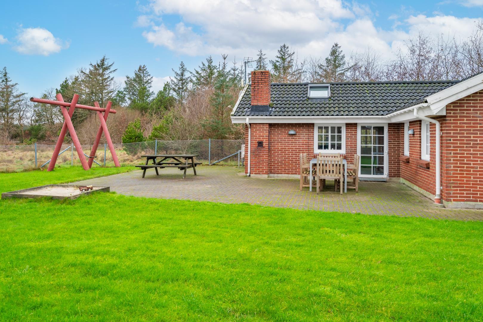 Den indhegnede have er et stort plus. Hunden kan bevæge sig frit, mens børnene leger på gyngen og i sandkassen. Her kan hele familien nyde ferien i trygge og rolige omgivelser.