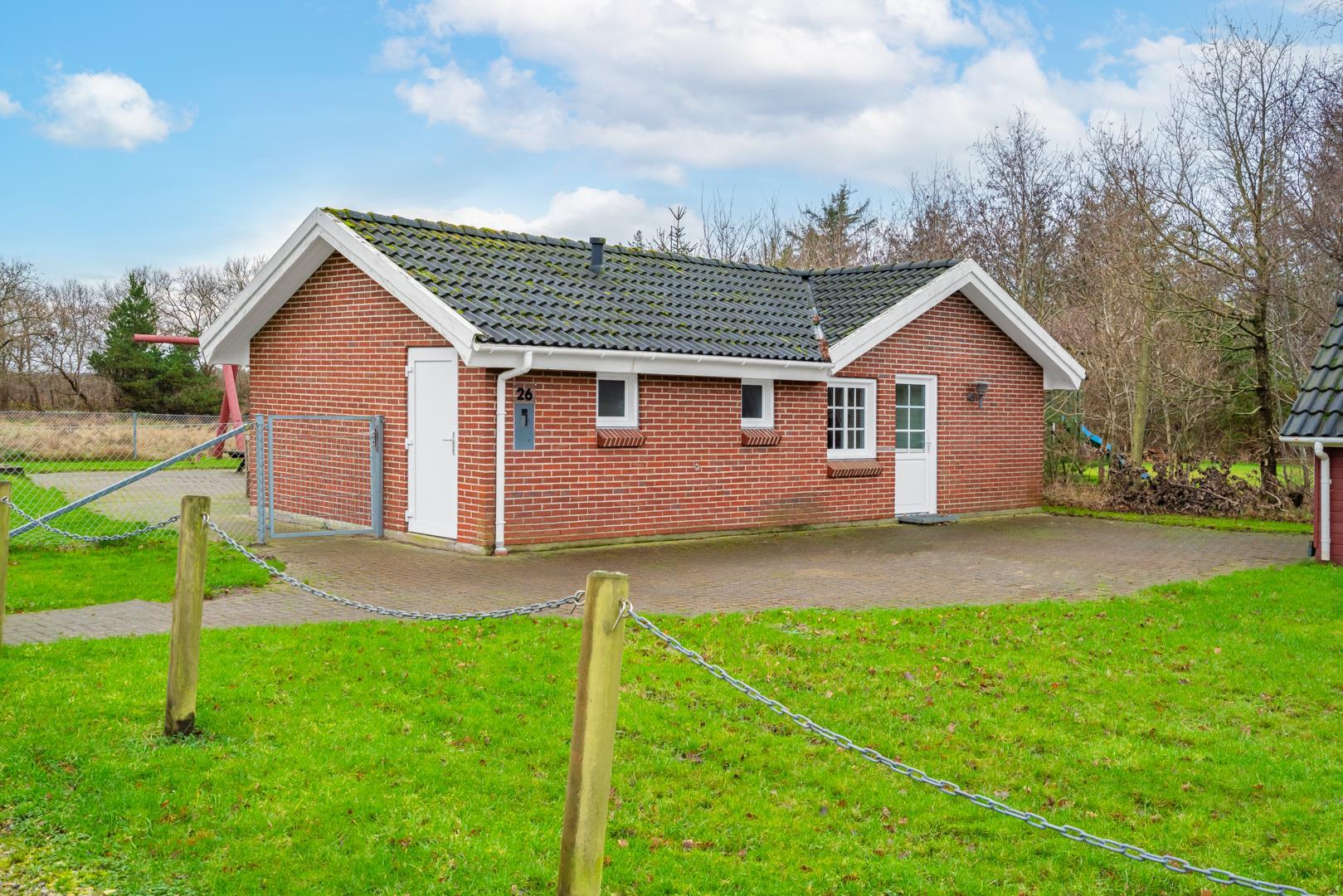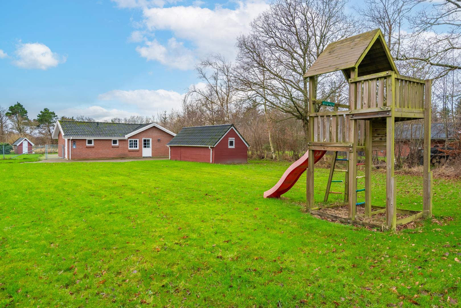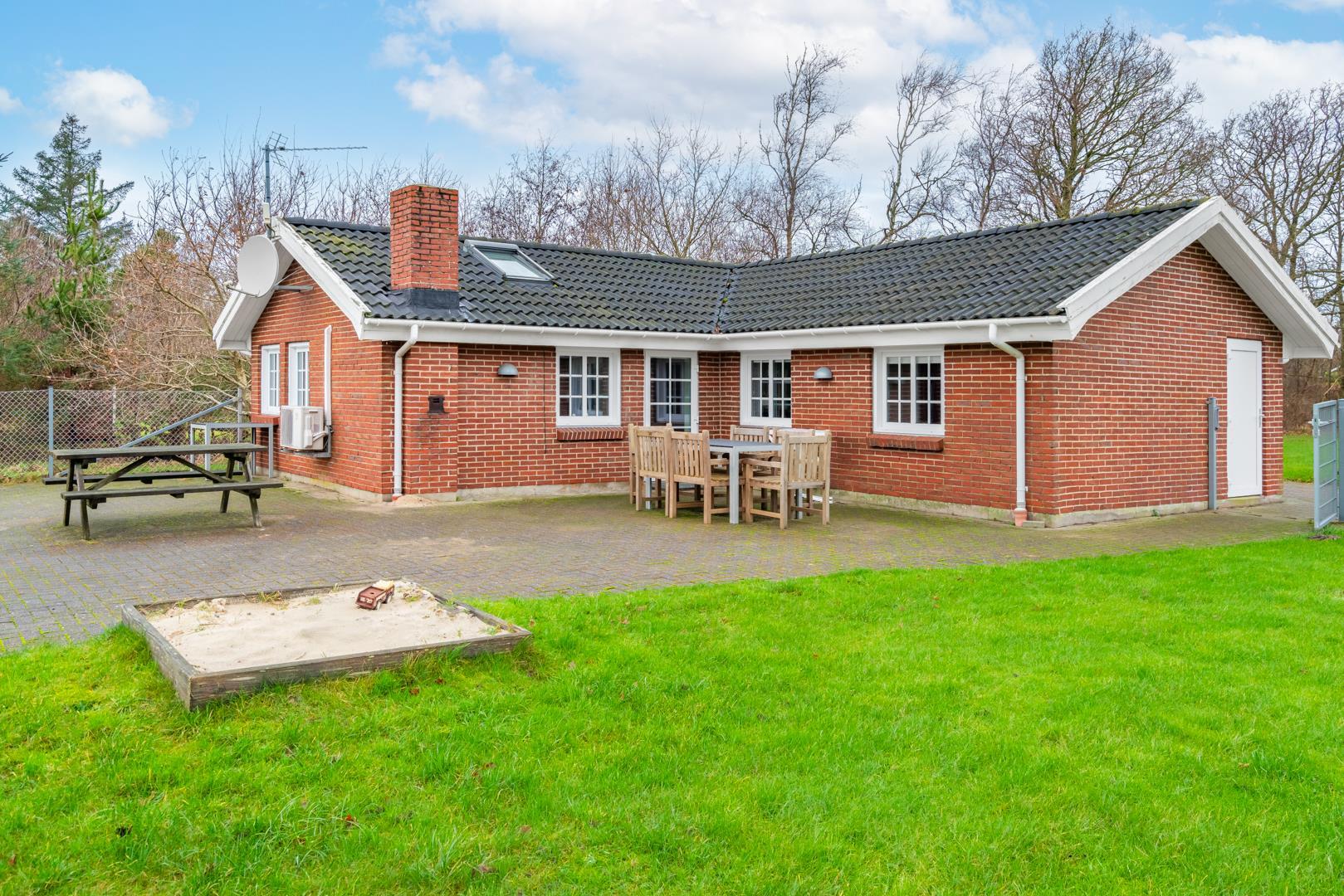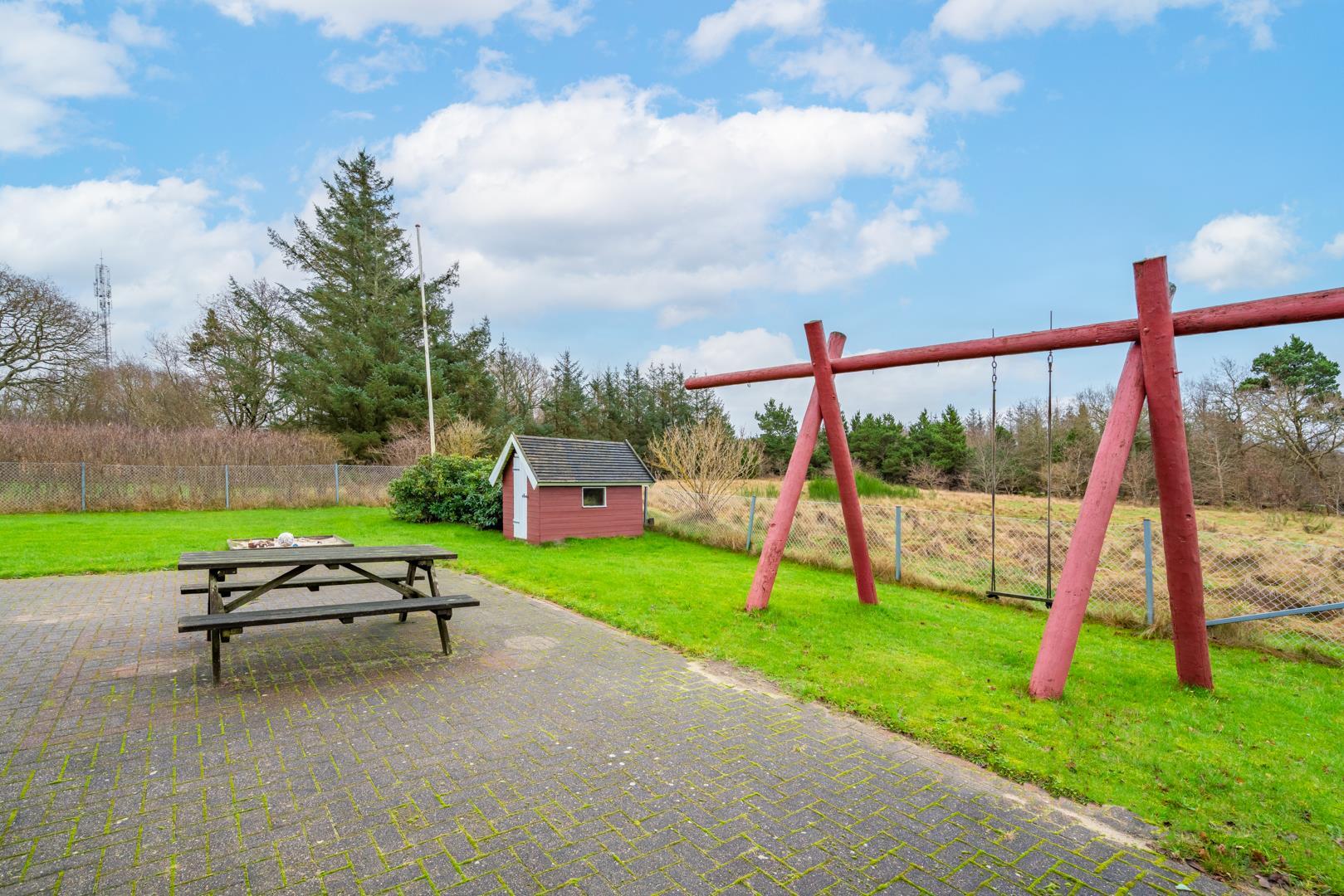 Den indhegnede have er et stort plus. Hunden kan bevæge sig frit, mens børnene leger på gyngen og i sandkassen. Her kan hele familien nyde ferien i trygge og rolige omgivelser.
