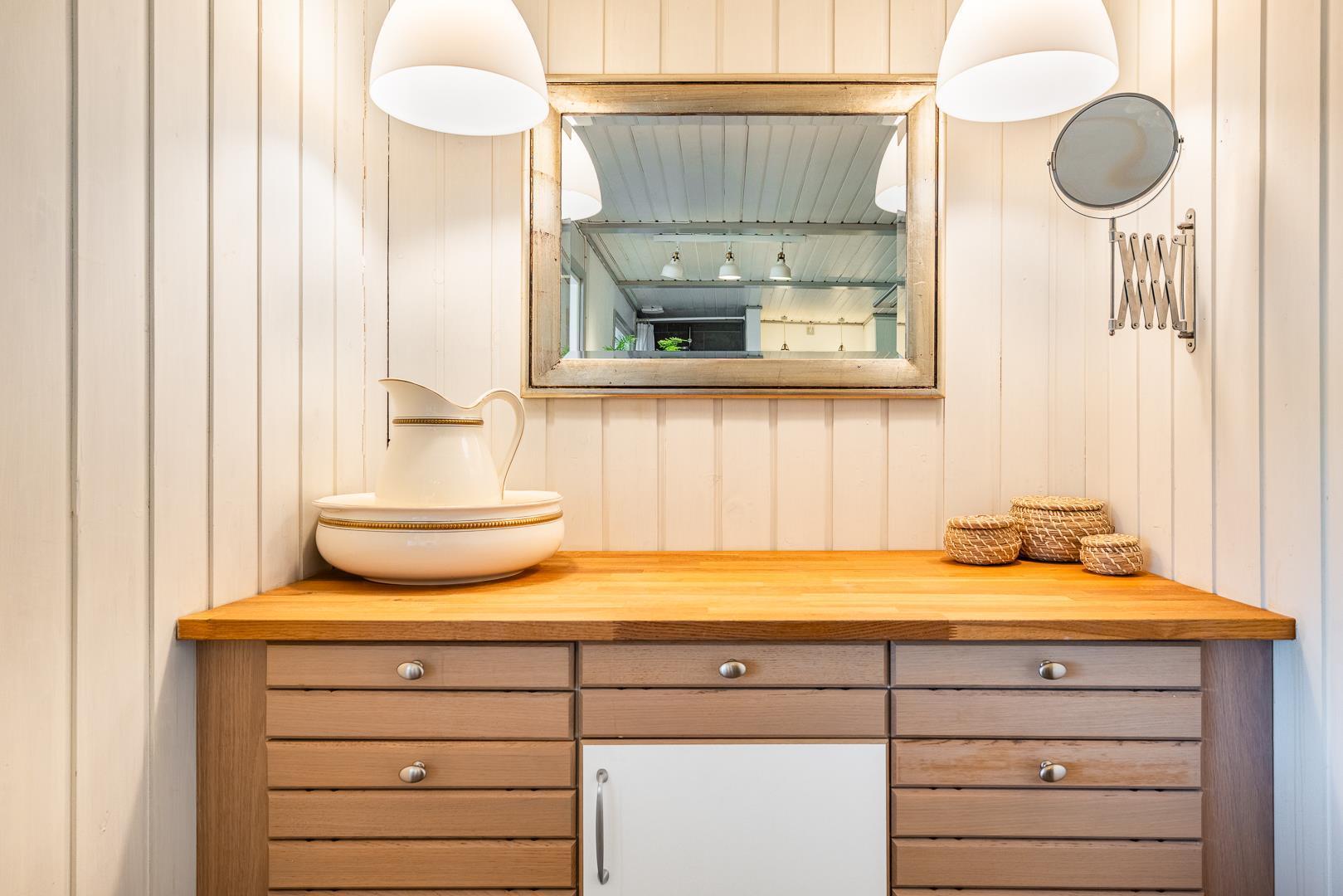 Husets køkken er i åben forbindelse med huset store stue som er indrettet med komfortable møbler. Der er udgang til husets terrasse fra stuen. I stuen er der flere hyggekroge, hvor man kan trække sig tilbage med en god bog eller nyde varmen fra husets brændeovn.