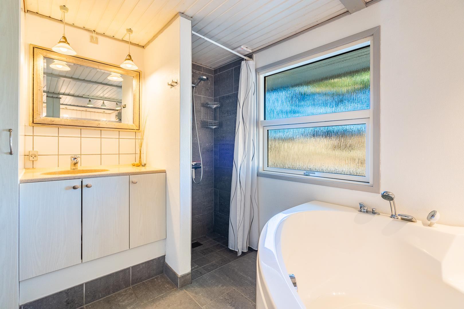 Stort badeværelse med badekar og sauna.