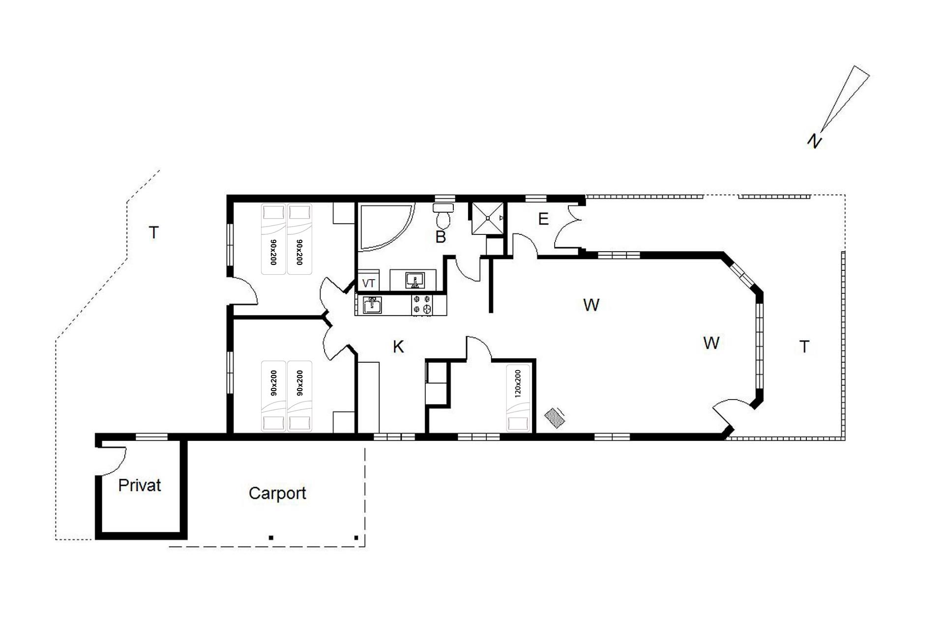 Sengestørrelse: 2 dobbeltsenge med 2 madrasser 90 x 200 cm + 1 enkeltseng 120 x 200cm.