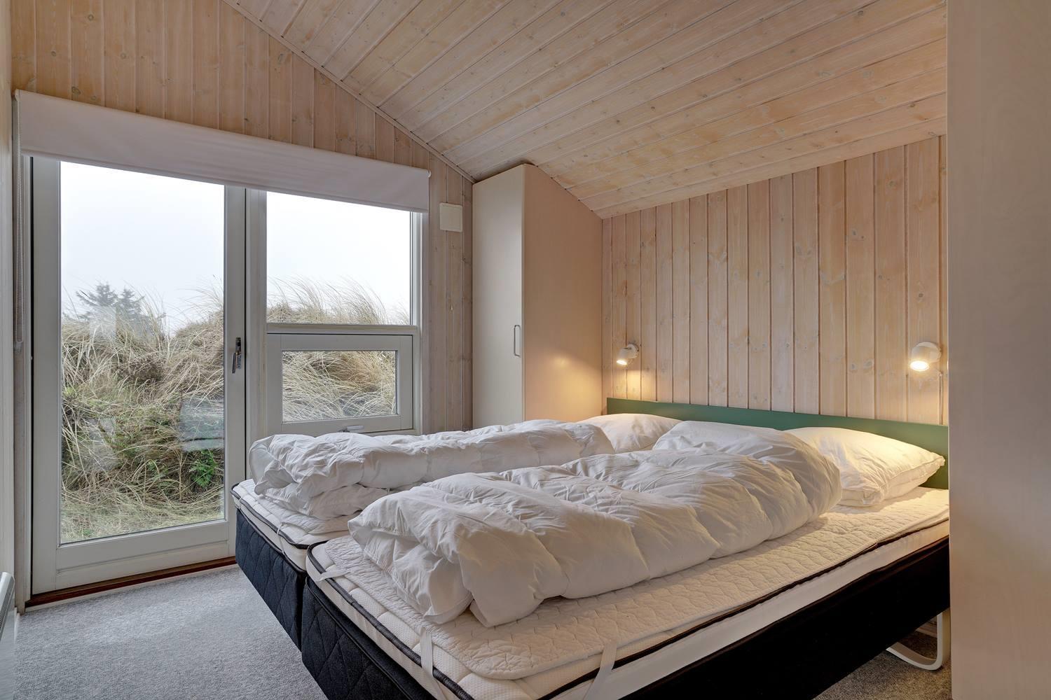 På en klittop med pragtfuld udsigt over byen og Lyngbo's Hede mod Blåbjerg plantage ligger dette dejlige feriehus. Ligemeget om man sidder på terrassen eller i stuen kan den fantastiske udsigt nydes. Huset har en stor stue, som ligger i åben forbindelse med køkkenet. Huset er indrettet med gode møbler dejligt badeværelse med spa og sauna. Sengestørrelser: dobbeltseng 180x190 cm. (2 madrasser), dobbeltseng 180x190 cm. (2 madrasser), dobbeltseng 180x190 cm. (2 madrasser)