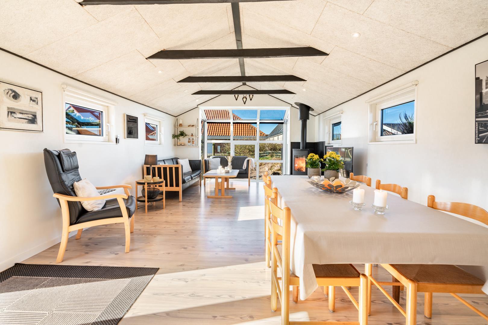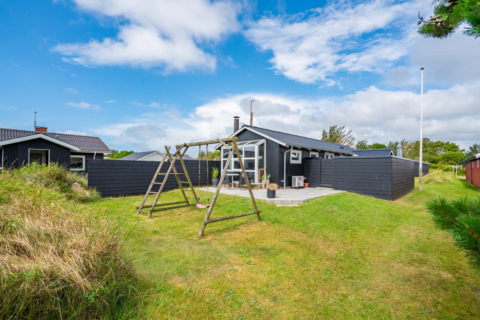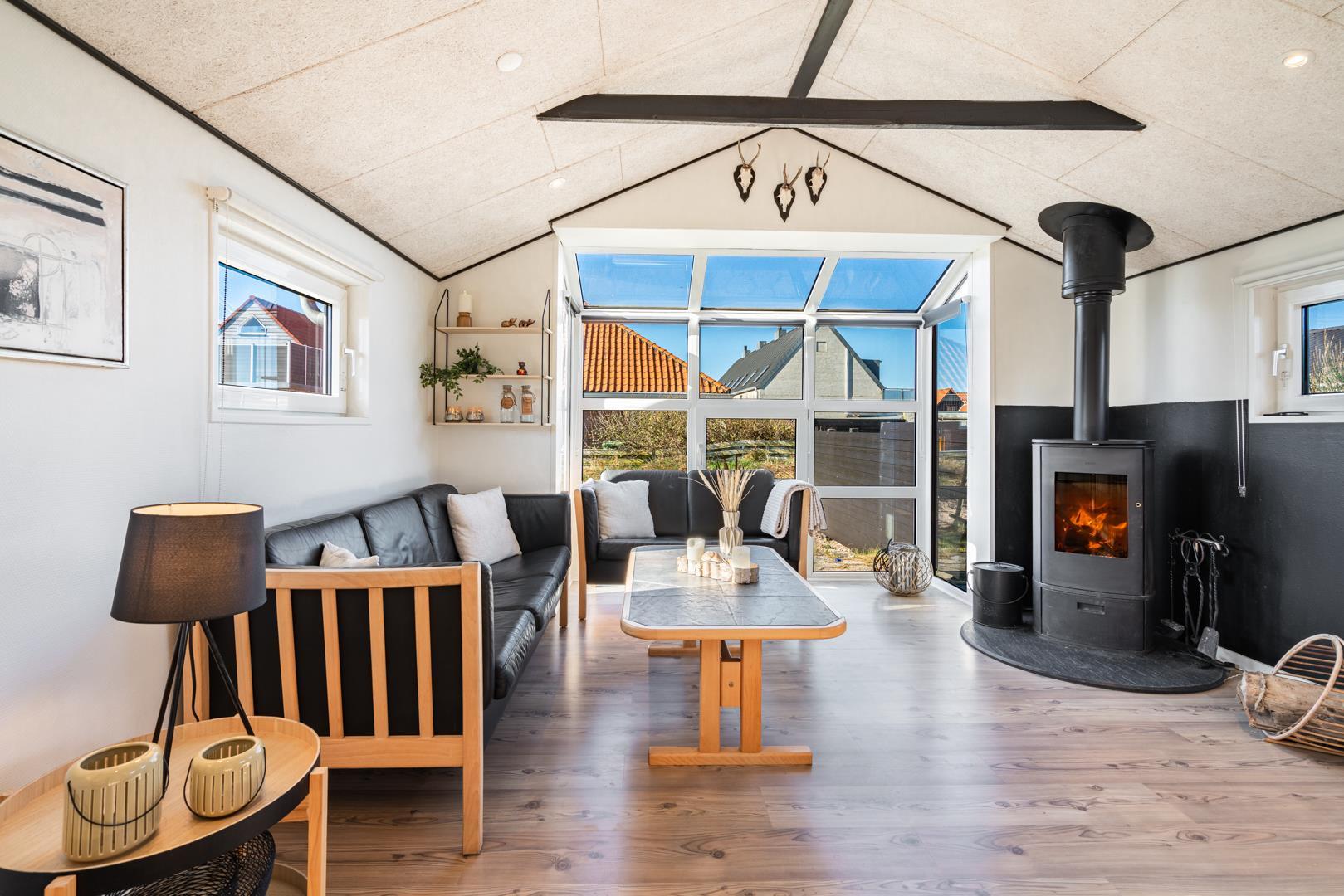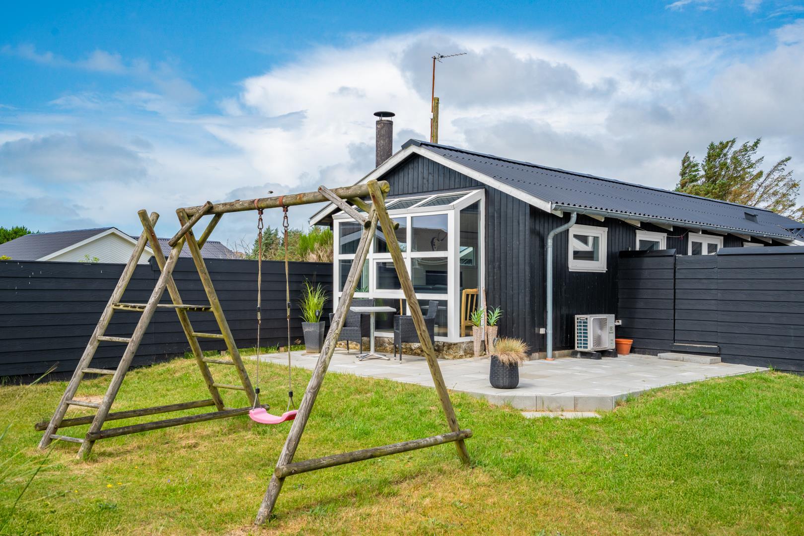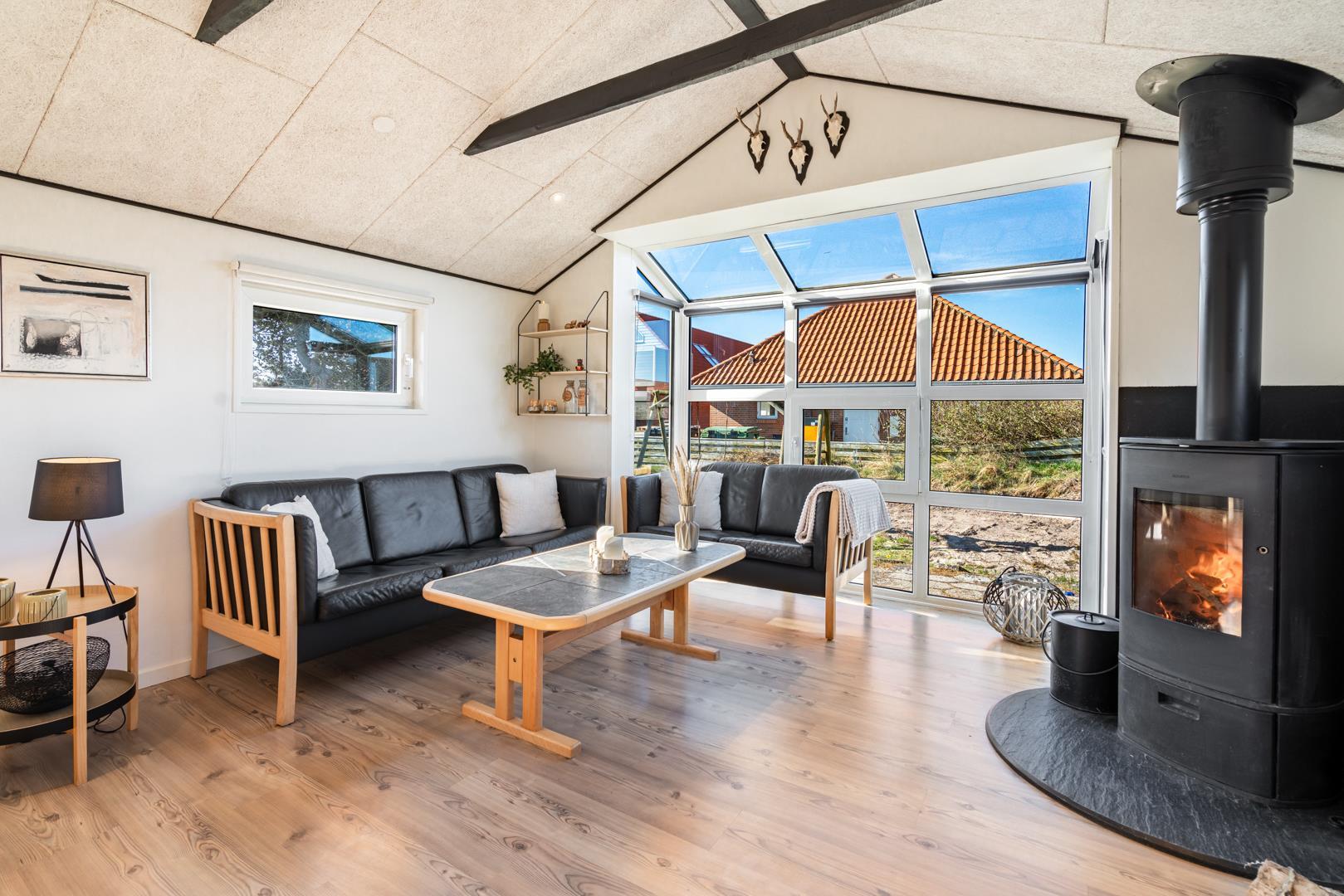 Køkkenet ligger i forbindelse med den fine stue – her finder du bl.a. brændeovnen der skaber ekstra hygge på de kolde dage. Den energibesparende varmepumpe sikrer til gengæld optimal komfort året rundt. For enden af stuen er her et dejligt vinduesparti med kig ud til haven med både sandkasse og gyngestativ. Fra stuen er der også udgang til den dejlige lukkede træterrasse, hvor du kan ligge i fred og ro og nyde de dejlige soltimer, sidde og slappe af med en god kop kaffe eller grille med resten af familien. Et skønt sommerhus til den lille familie der ønsker at bo centralt i Henne Strand.