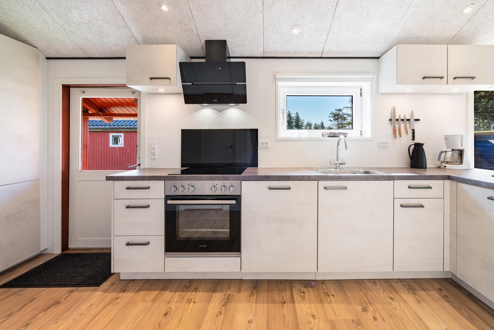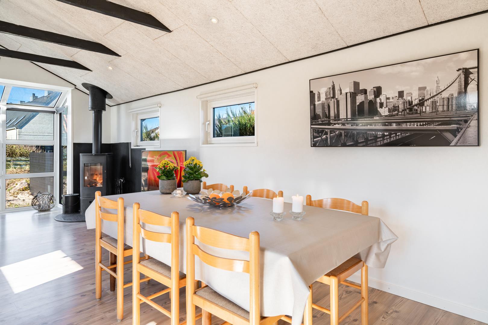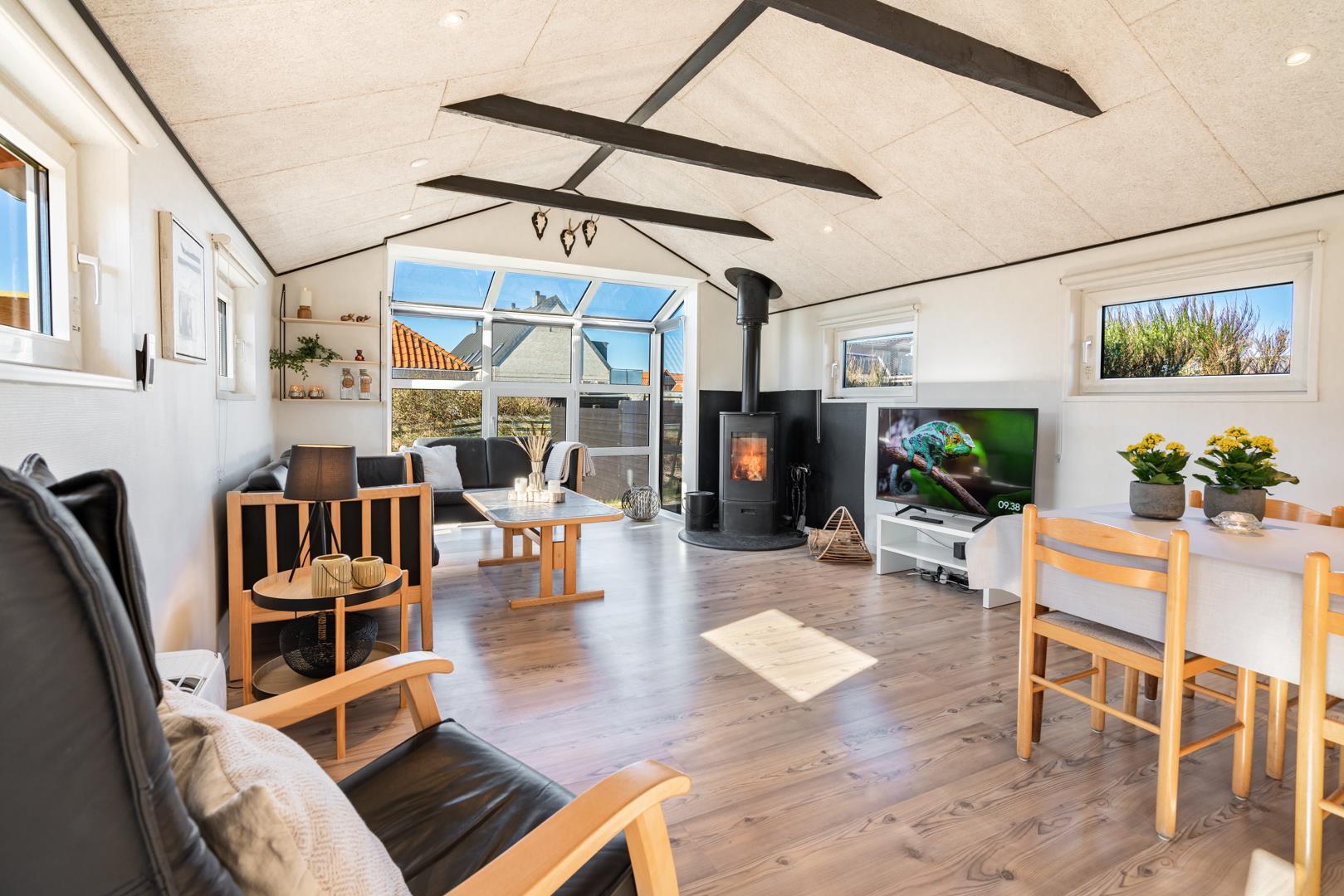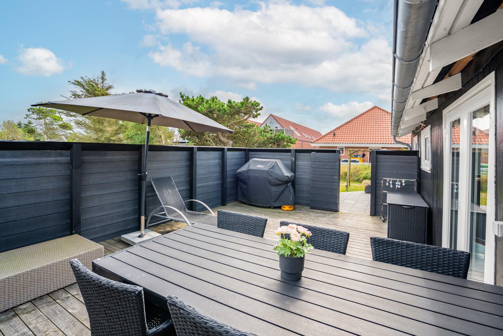 Køkkenet ligger i forbindelse med den fine stue – her finder du bl.a. brændeovnen der skaber ekstra hygge på de kolde dage. Den energibesparende varmepumpe sikrer til gengæld optimal komfort året rundt. For enden af stuen er her et dejligt vinduesparti med kig ud til haven med både sandkasse og gyngestativ. Fra stuen er der også udgang til den dejlige lukkede træterrasse, hvor du kan ligge i fred og ro og nyde de dejlige soltimer, sidde og slappe af med en god kop kaffe eller grille med resten af familien. Et skønt sommerhus til den lille familie der ønsker at bo centralt i Henne Strand.