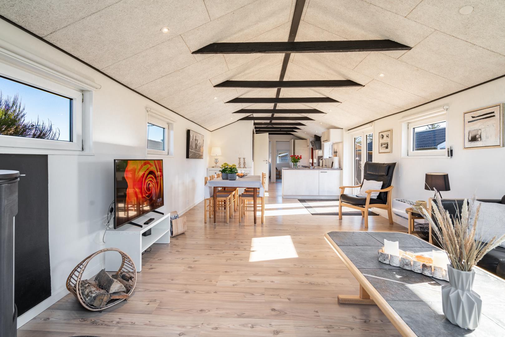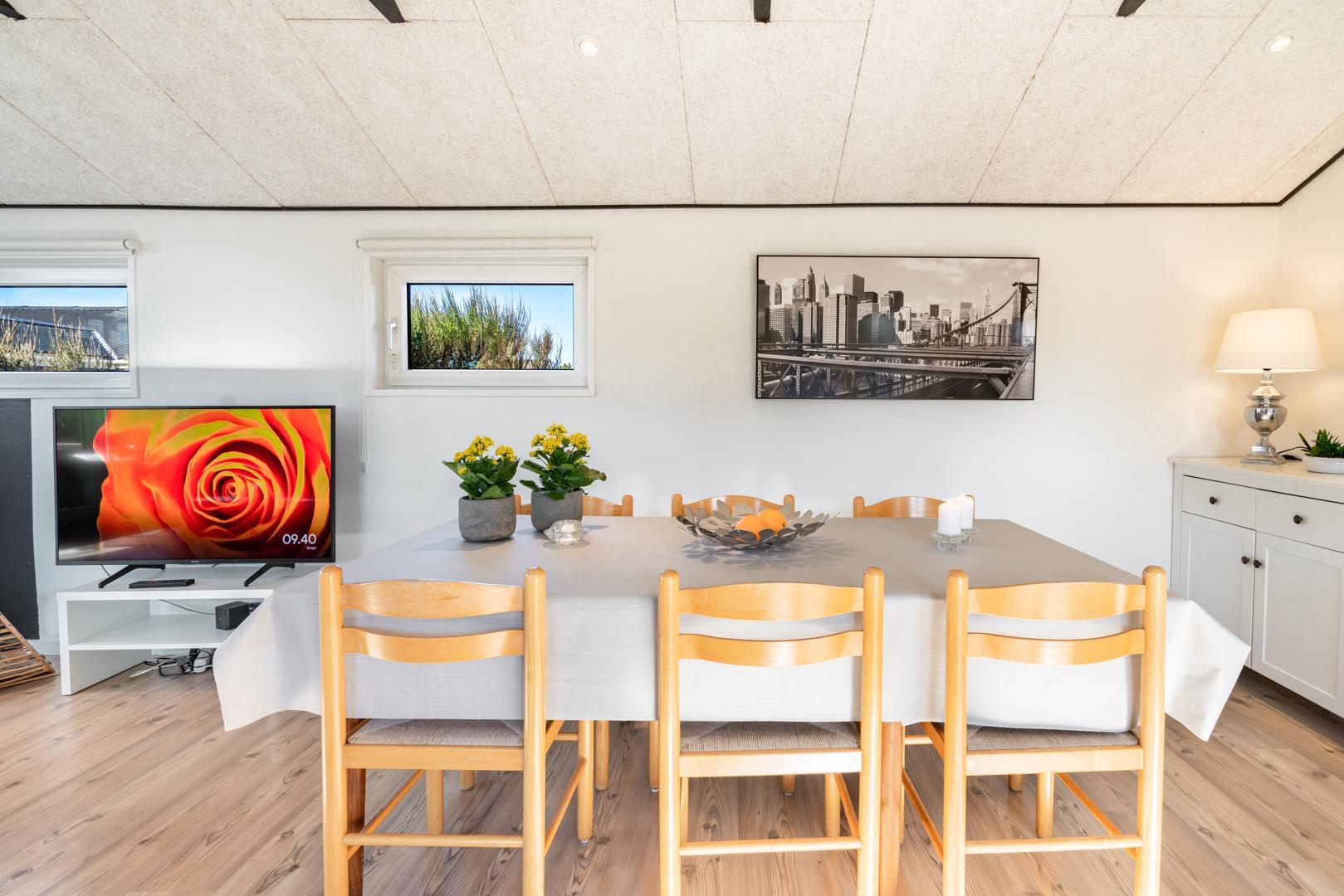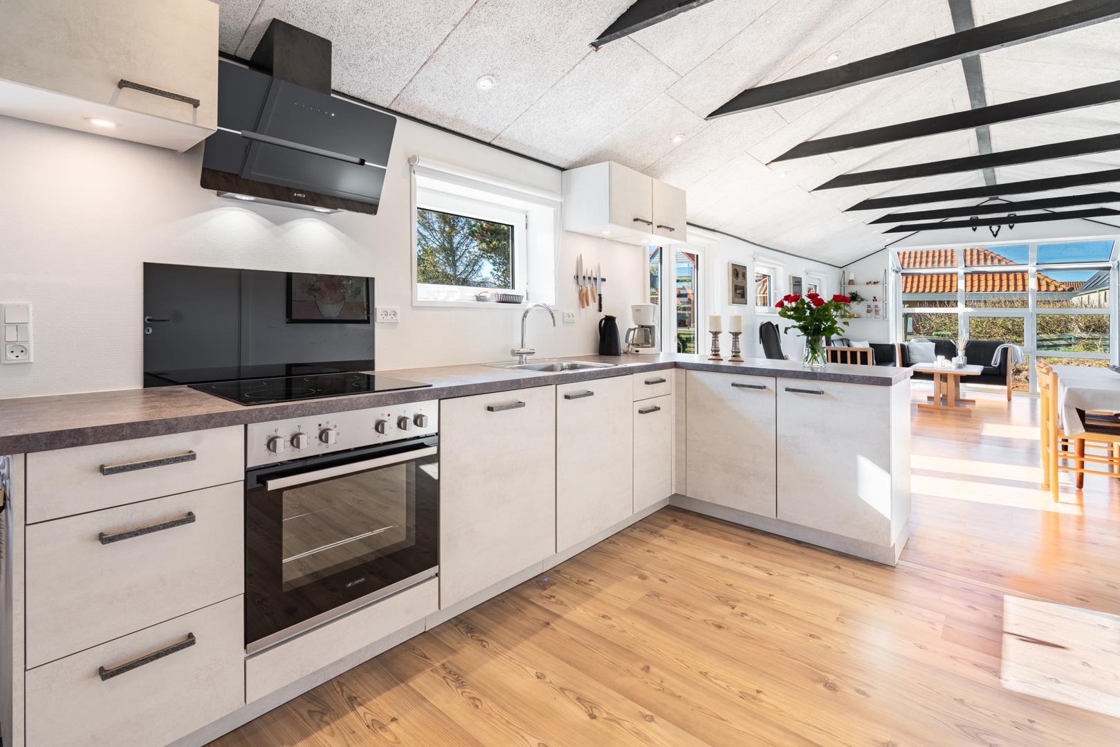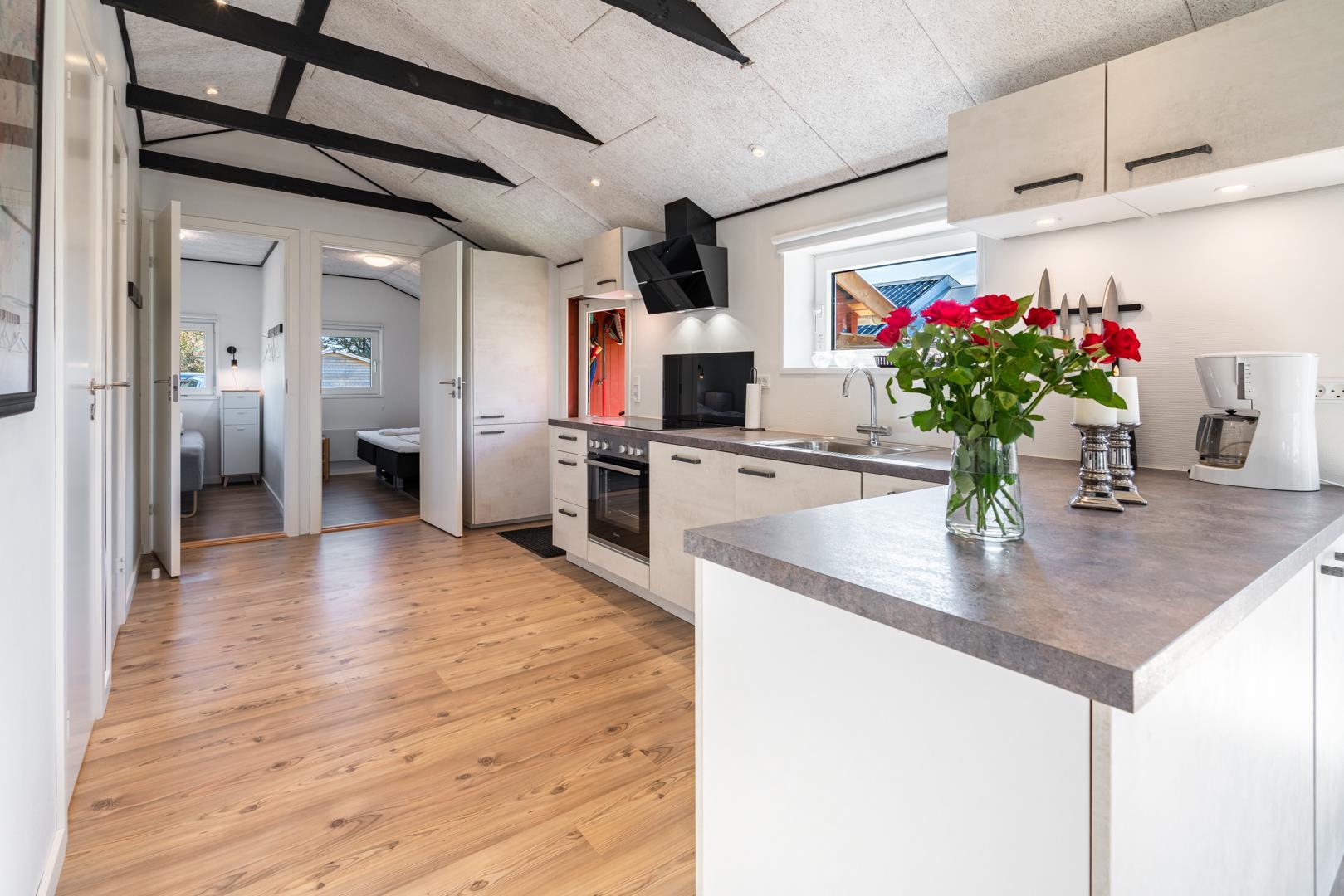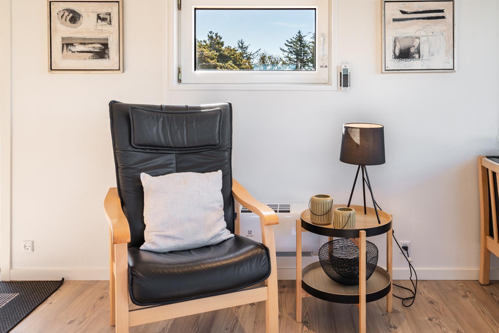Køkkenet ligger i forbindelse med den fine stue – her finder du bl.a. brændeovnen der skaber ekstra hygge på de kolde dage. Den energibesparende varmepumpe sikrer til gengæld optimal komfort året rundt. For enden af stuen er her et dejligt vinduesparti med kig ud til haven med både sandkasse og gyngestativ. Fra stuen er der også udgang til den dejlige lukkede træterrasse, hvor du kan ligge i fred og ro og nyde de dejlige soltimer, sidde og slappe af med en god kop kaffe eller grille med resten af familien. Et skønt sommerhus til den lille familie der ønsker at bo centralt i Henne Strand.
