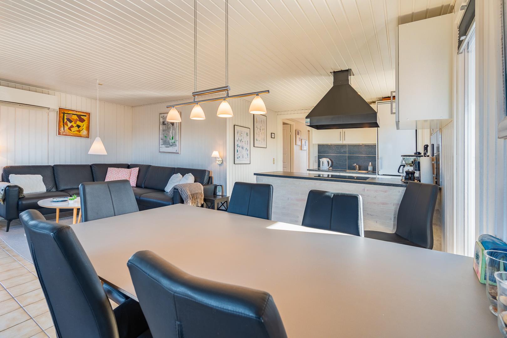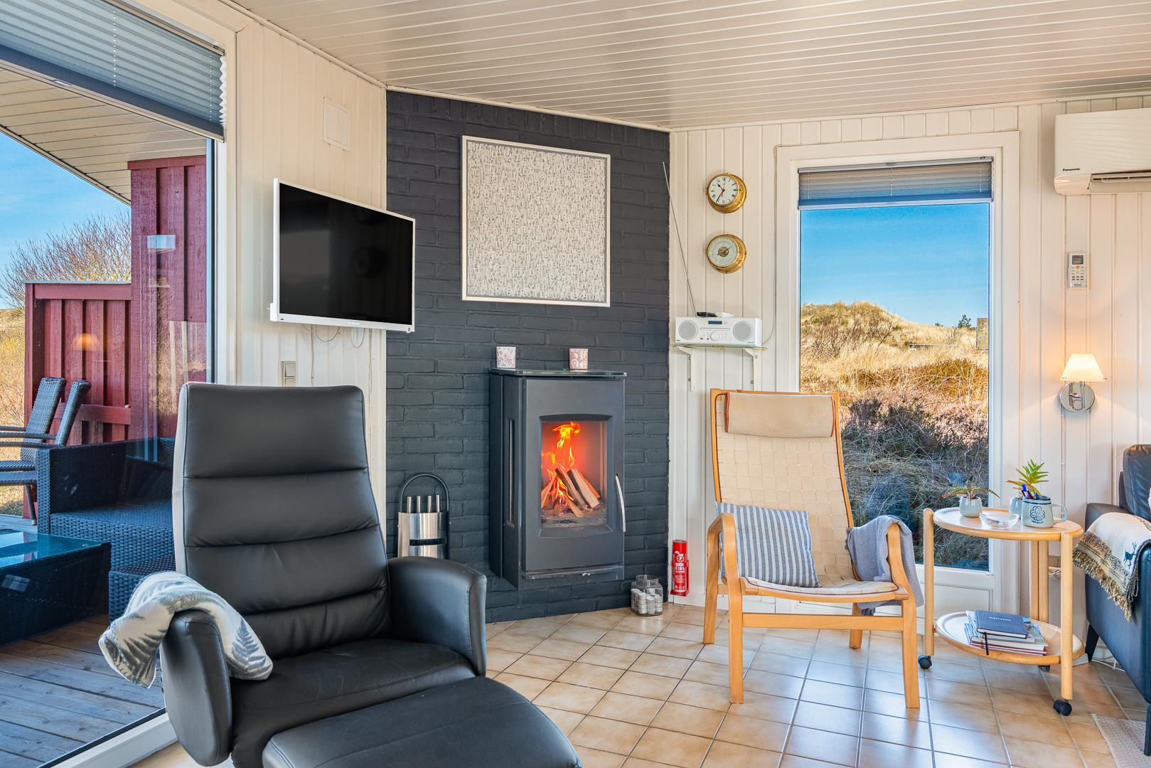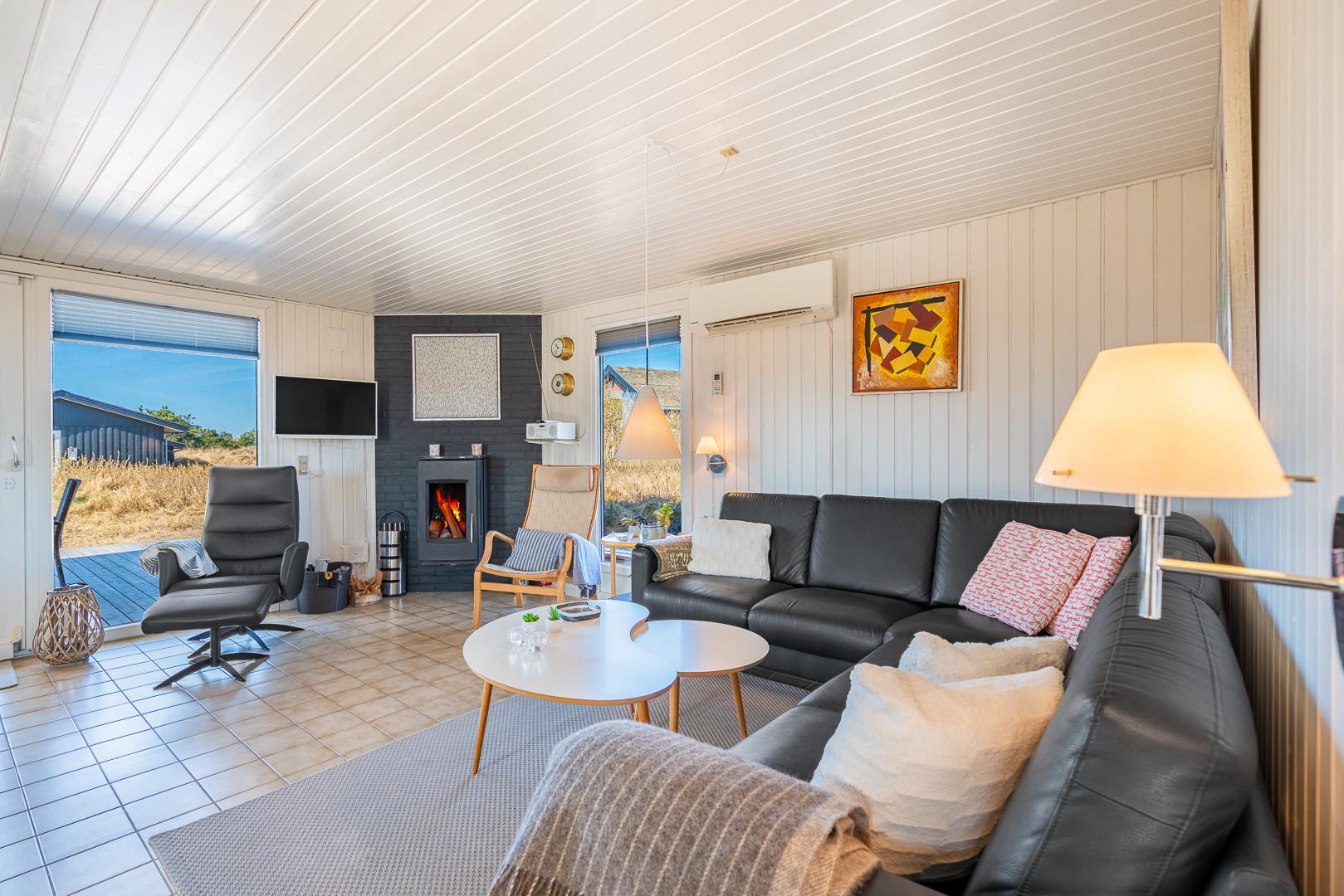 Stuen er integreret med køkkenet, og her kan I nyde varme stunder foran brændeovnen. En varmepumpe sørger for et behageligt indeklima året rundt. Køkkenet er veludstyret med bl.a. opvaskemaskine og ovn, og en vaskemaskine gør ferien ekstra bekvem – især hvis opholdet er lidt længere.