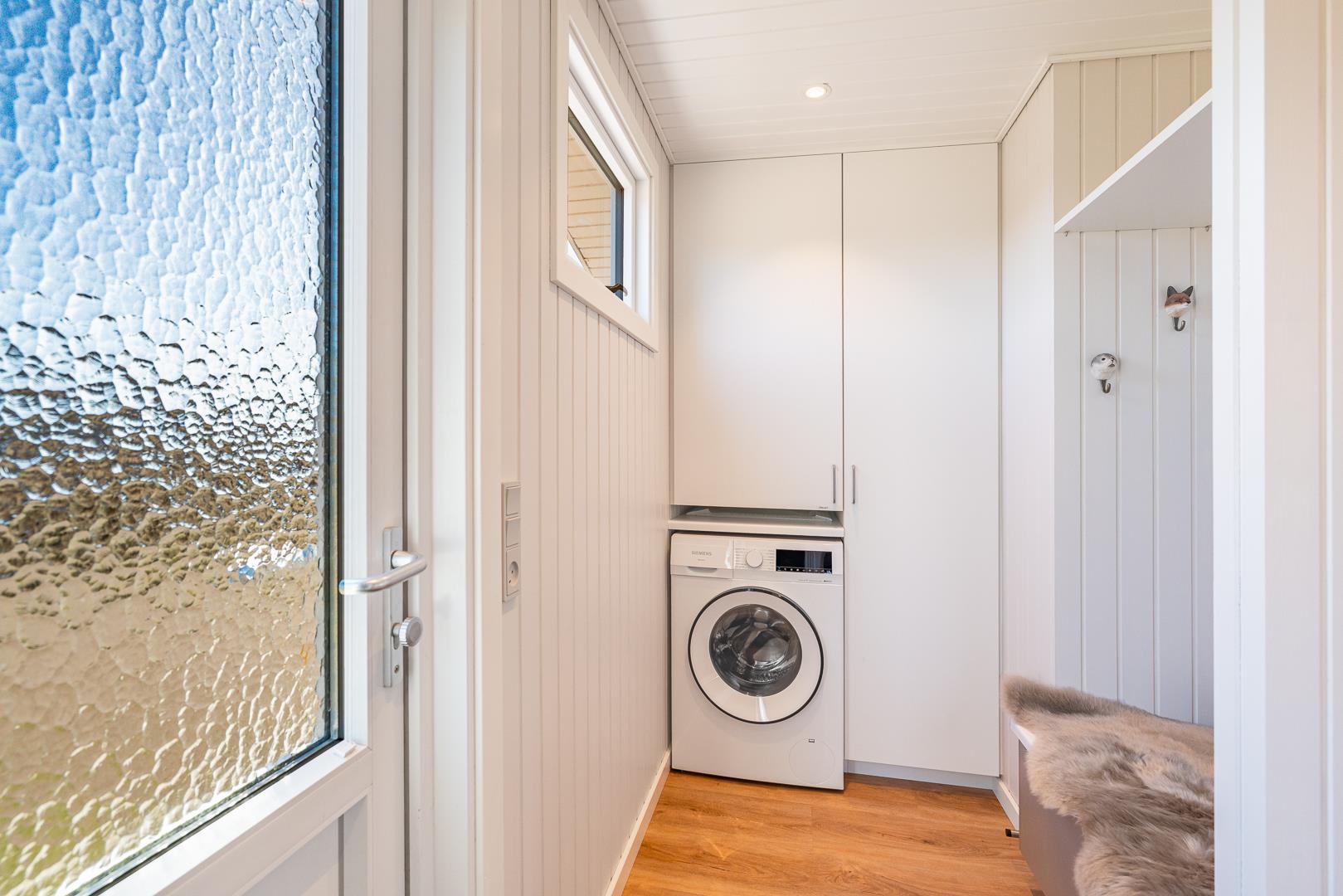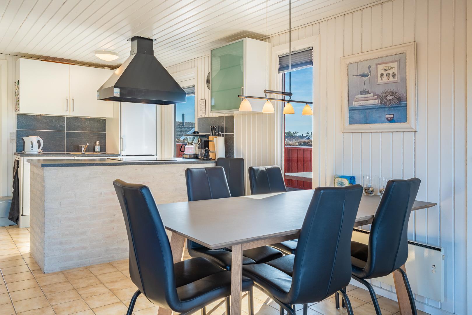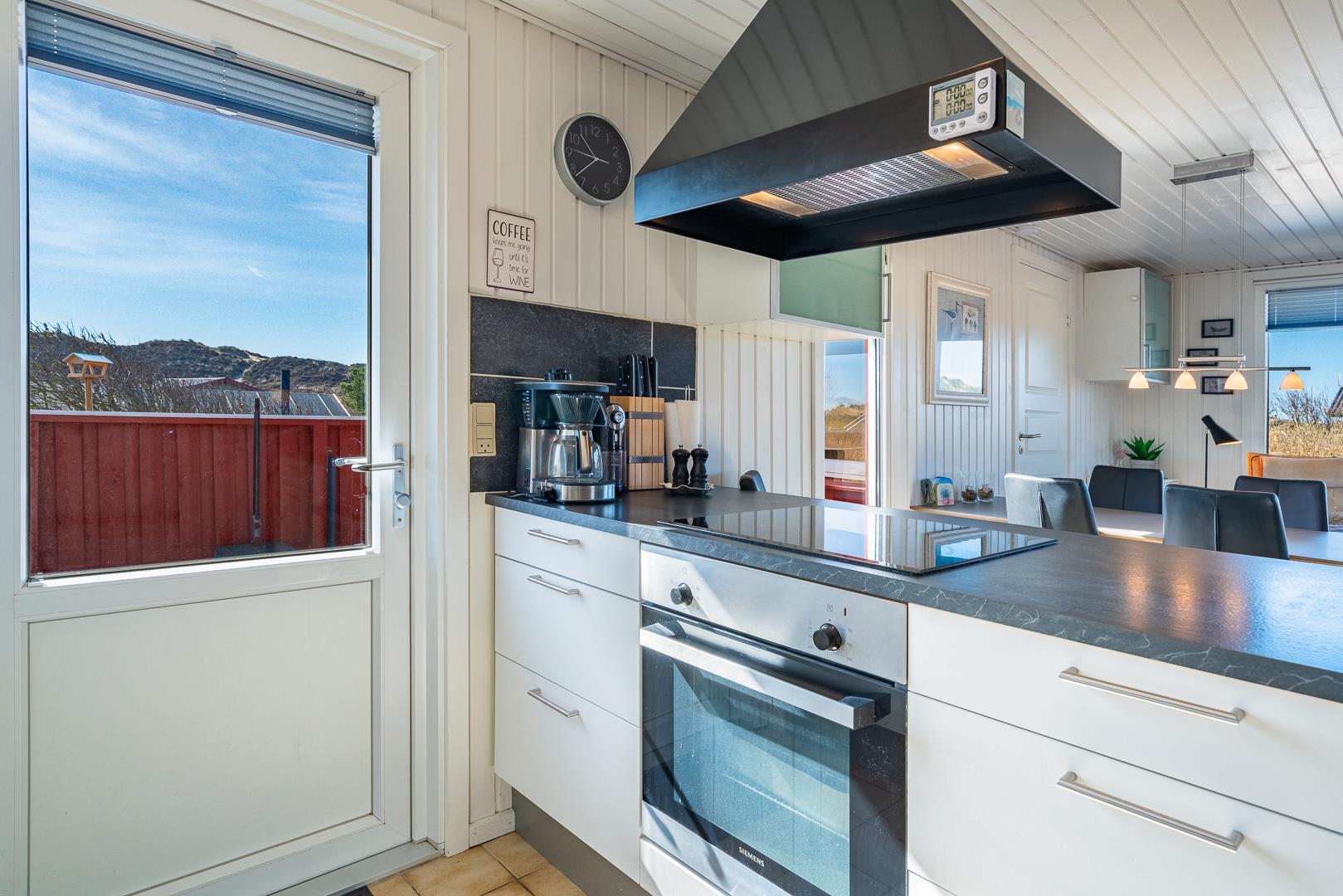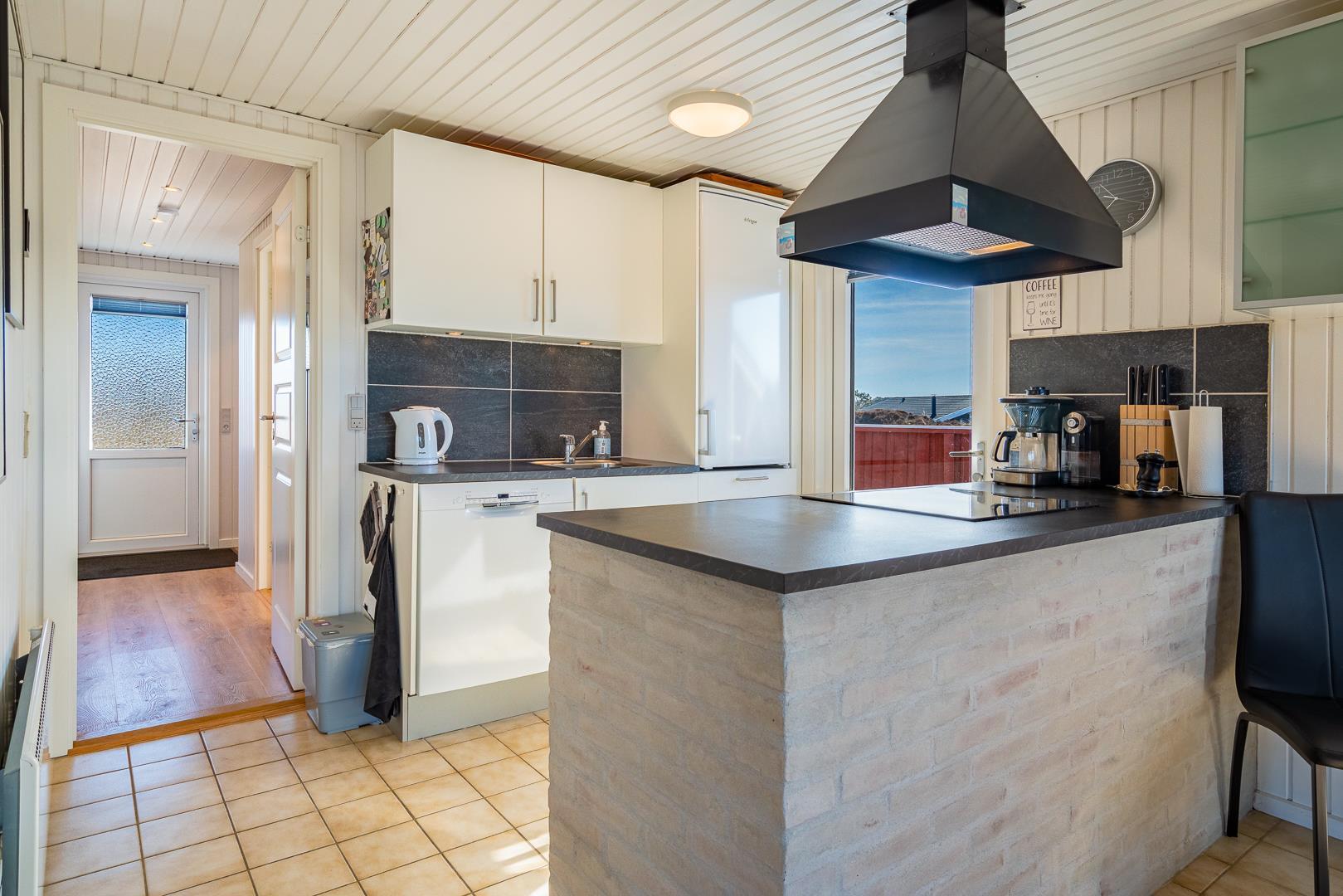 Stuen er integreret med køkkenet, og her kan I nyde varme stunder foran brændeovnen. En varmepumpe sørger for et behageligt indeklima året rundt. Køkkenet er veludstyret med bl.a. opvaskemaskine og ovn, og en vaskemaskine gør ferien ekstra bekvem – især hvis opholdet er lidt længere.