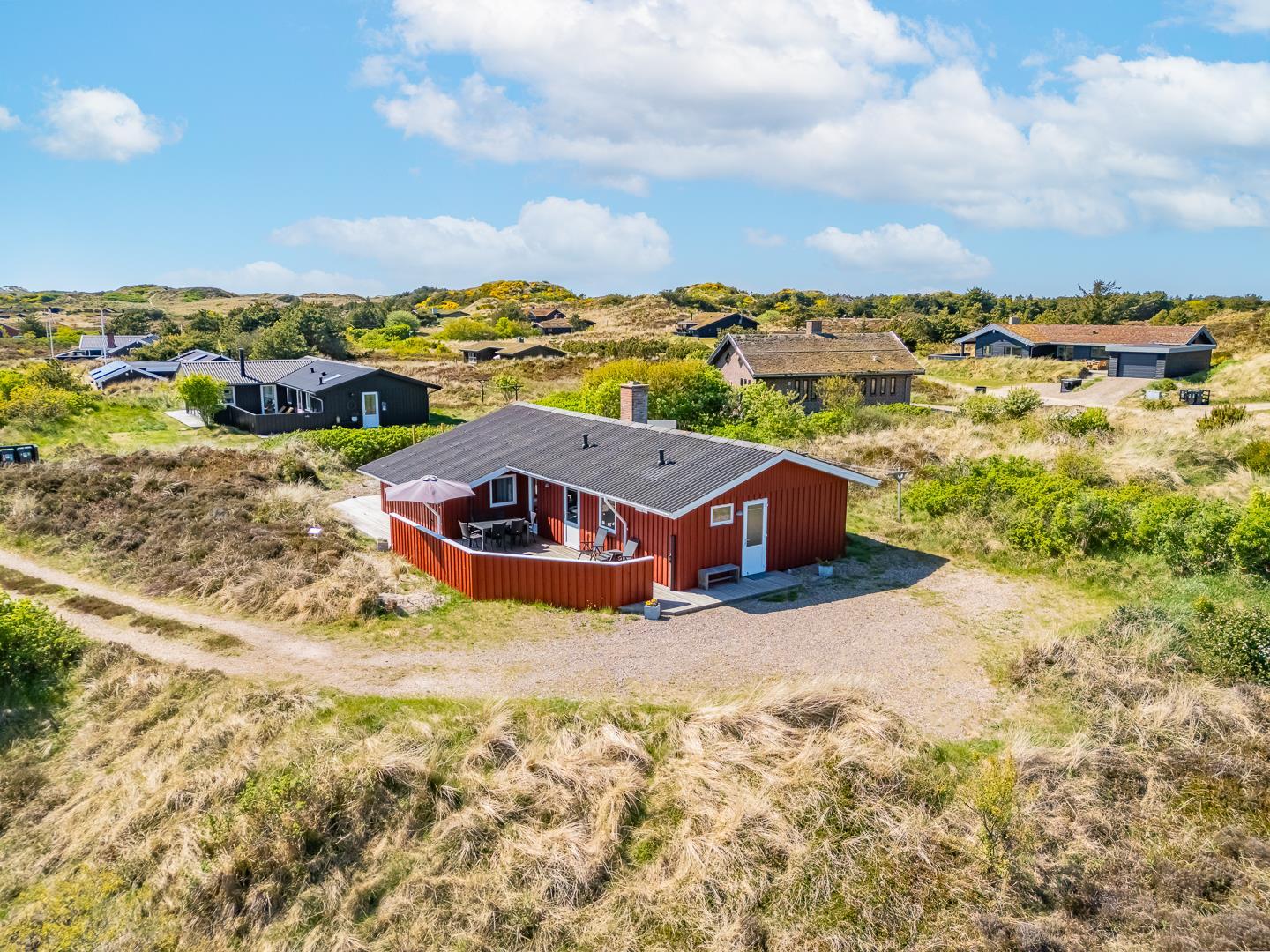 Fra sommerhuset har I en skøn udsigt til klitter og hedelandskab, og her kan I nyde både fred og privatliv. I nærheden venter smukke naturreservater omkring Henne Mølle Å – oplagt til gåture og oplevelser i naturen ved havet.