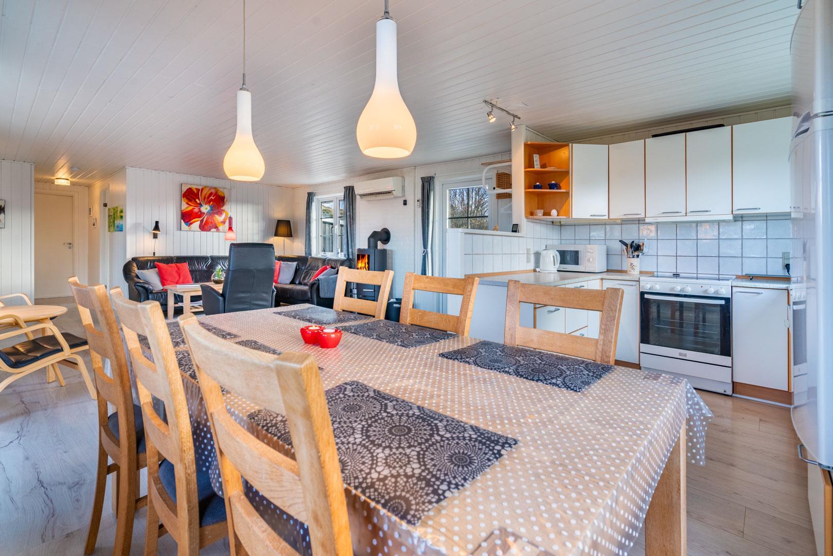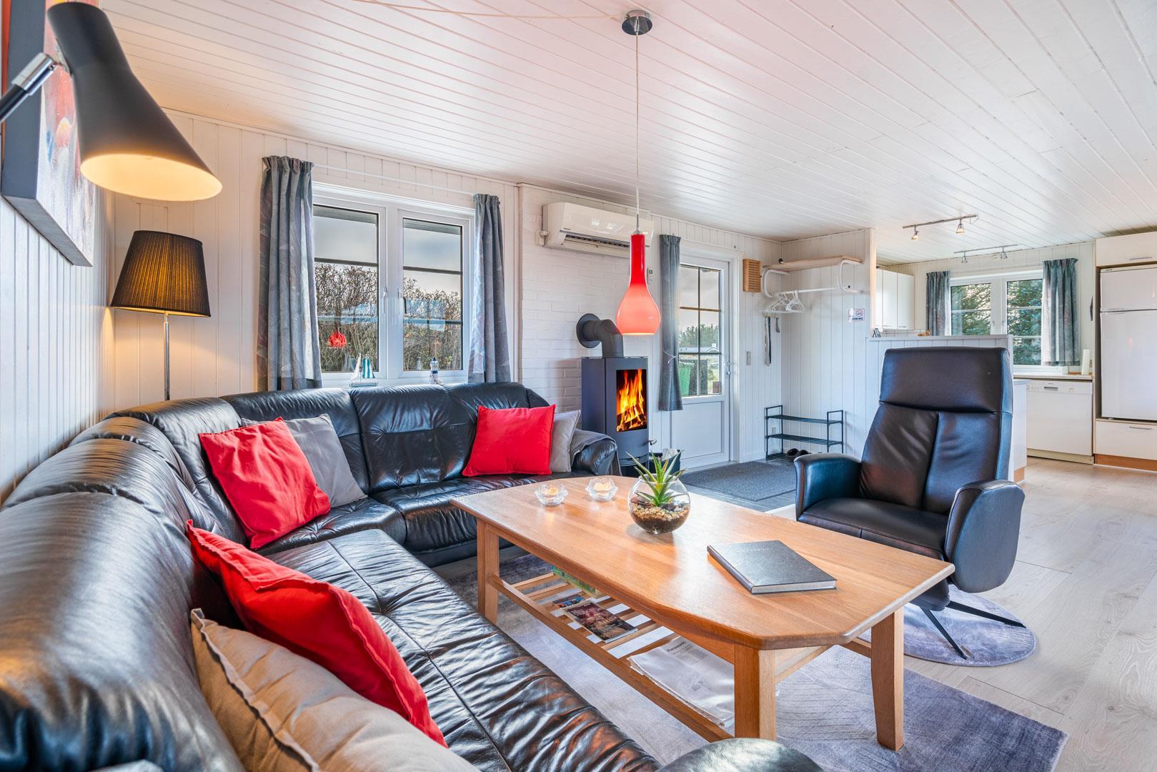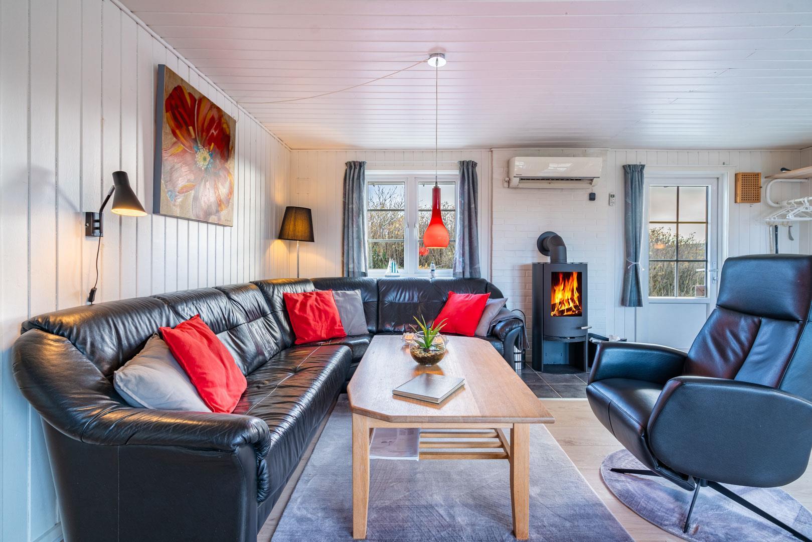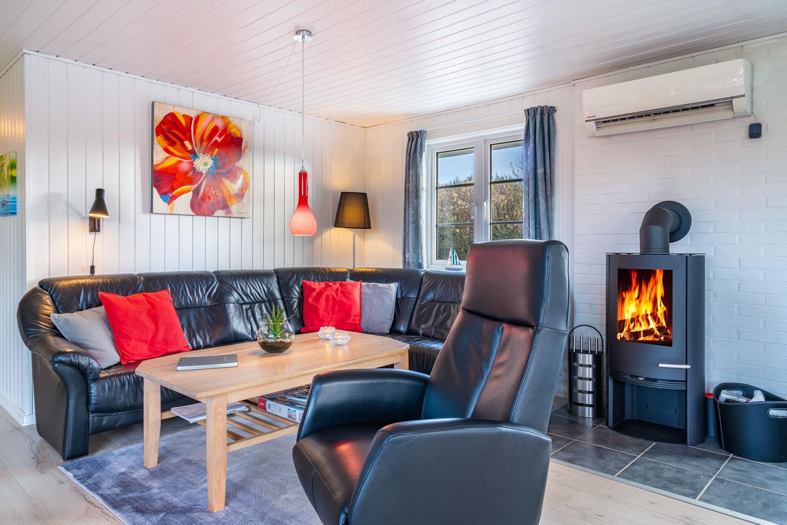 På en let kuperet naturgrund ligger dette dejlige og hyggelige feriehus. Feriehuset er omgivet af 2 dejlige terrasser, den ene helt aflukket. Stort badeværelse med spa og sauna, samt ekstra toilet. Lyst og venligt indrettet køkken/alrum i åben forbindelse til stor stue med brændeovn samt varmepumpe og med direkte udgang til terrassen.