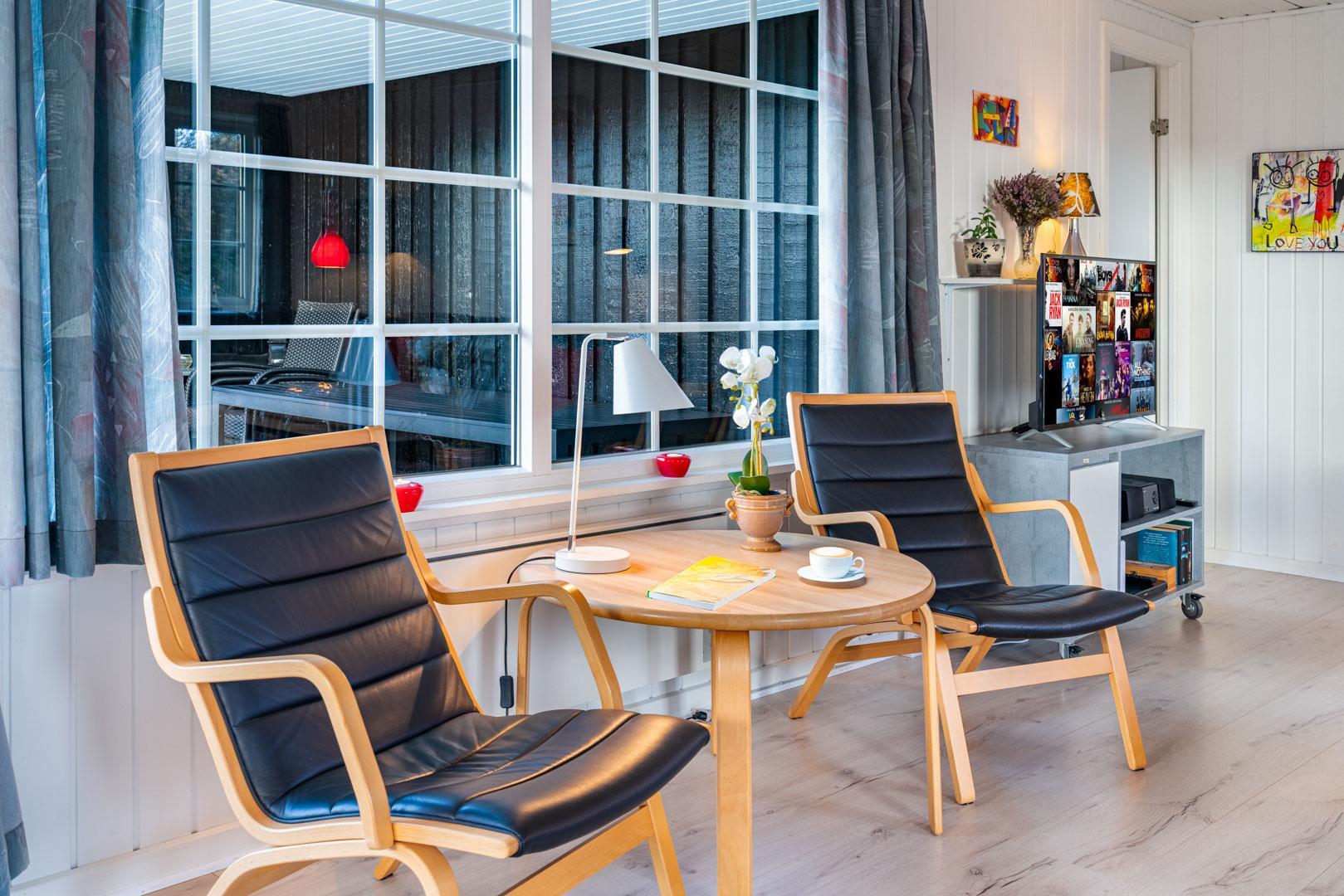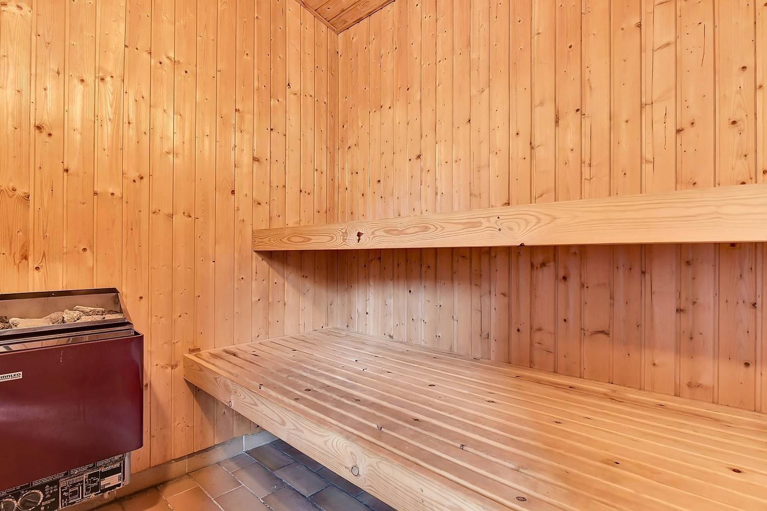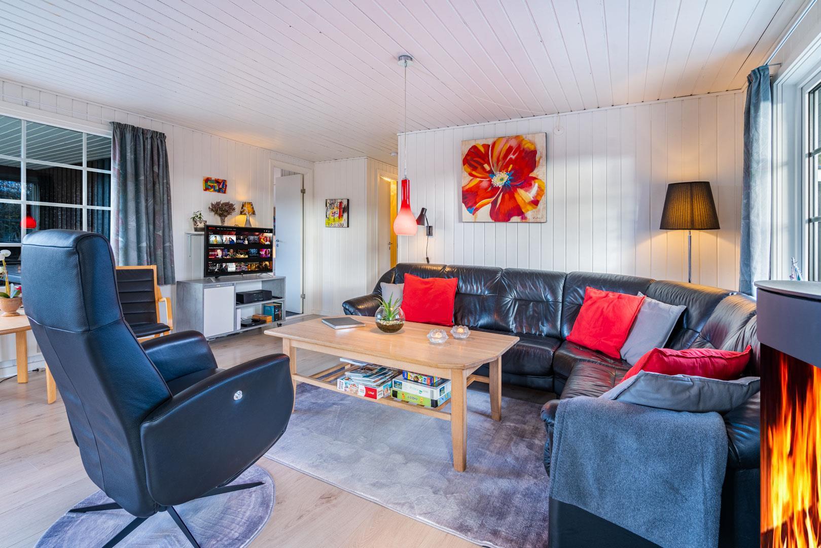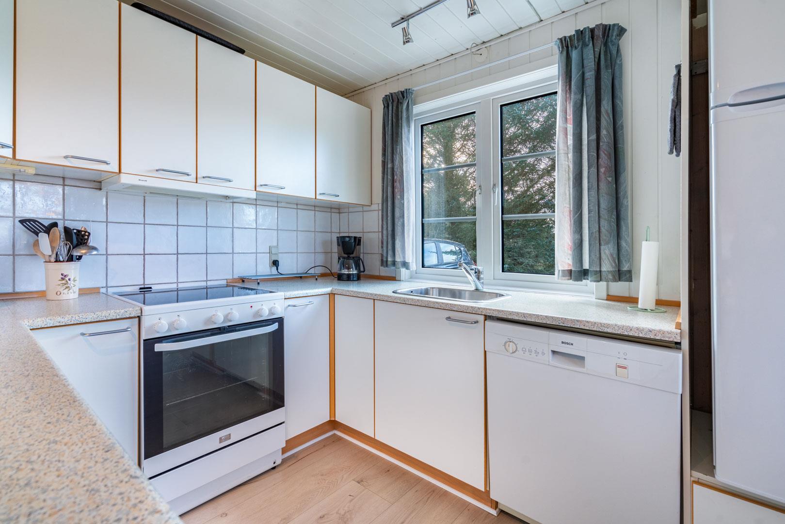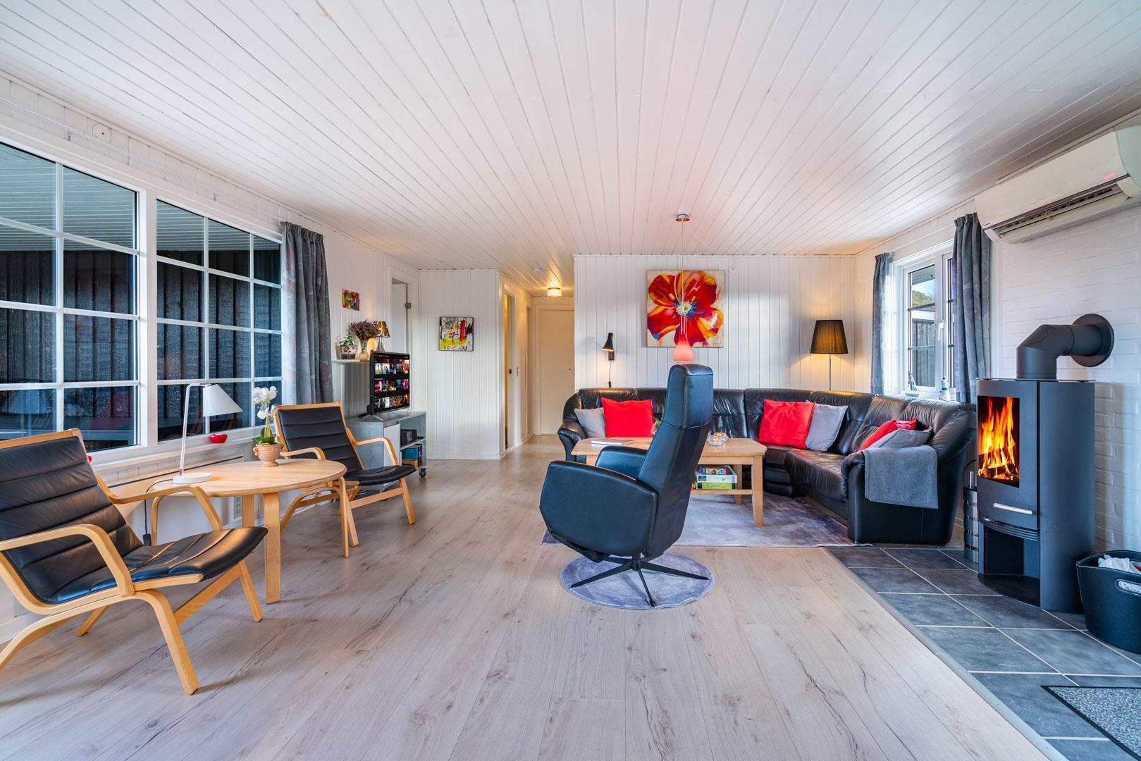 På en let kuperet naturgrund ligger dette dejlige og hyggelige feriehus. Feriehuset er omgivet af 2 dejlige terrasser, den ene helt aflukket. Stort badeværelse med spa og sauna, samt ekstra toilet. Lyst og venligt indrettet køkken/alrum i åben forbindelse til stor stue med brændeovn samt varmepumpe og med direkte udgang til terrassen.