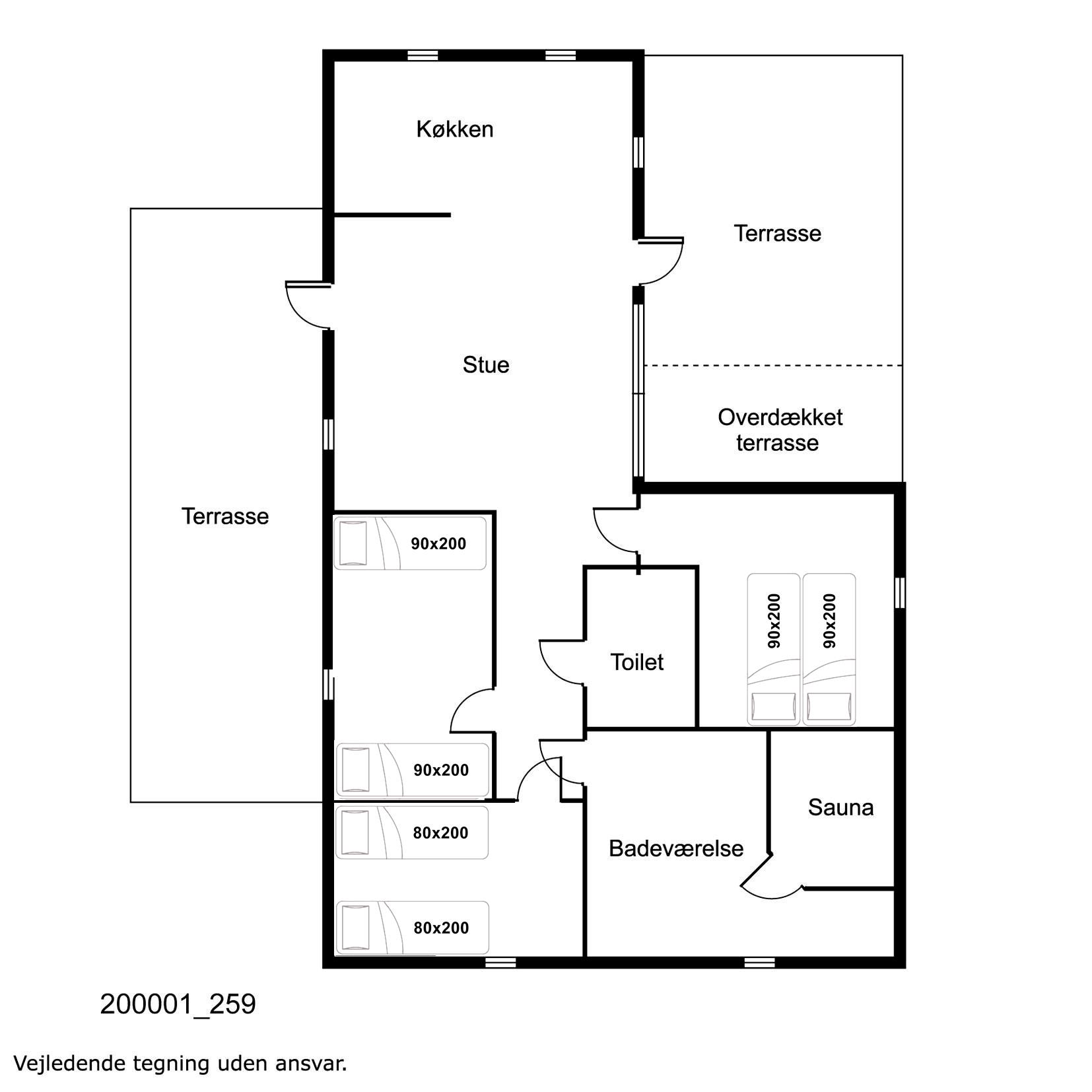 Sengestørrelse: 1 dobbeltseng med 2 madrasser 90 x 200 cm + 2 enkeltsenge 80 x 200 cm + 2 enkeltsenge 90 x 200 cm.
