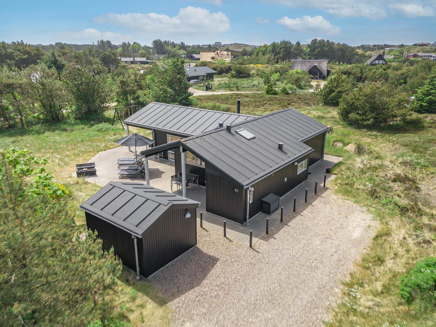 Flot sommerhus beliggende på en ugeneret, flot klitgrund omkranset af træer og buske.