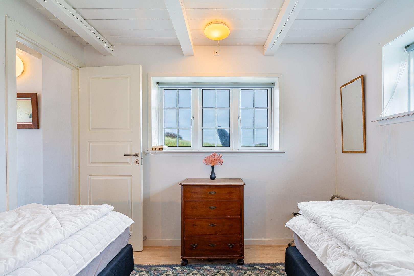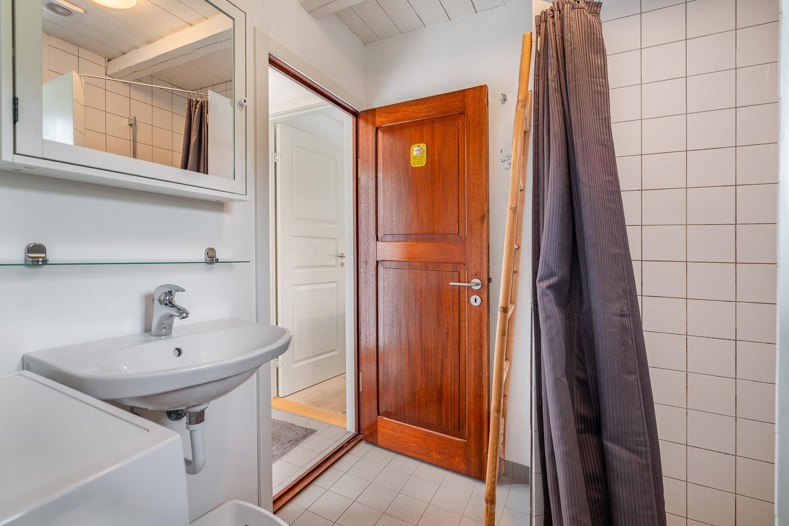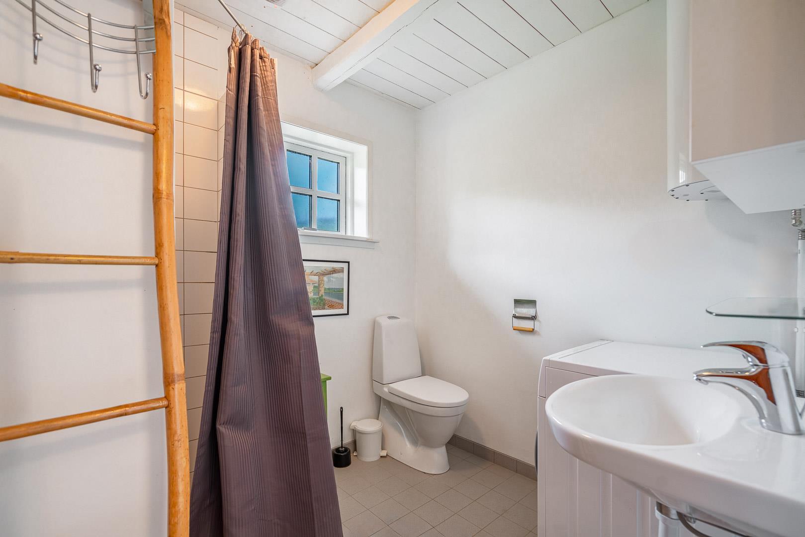 Sommerhuset har to soveværelser – ét med dobbeltseng og ét med to enkeltsenge – perfekt til både familier og par. Der er også vaskemaskine, så sommerhuset er praktisk til længere ophold og ferie med børn og hund. Badeværelset er lyst og funktionelt med bruser og toilet.