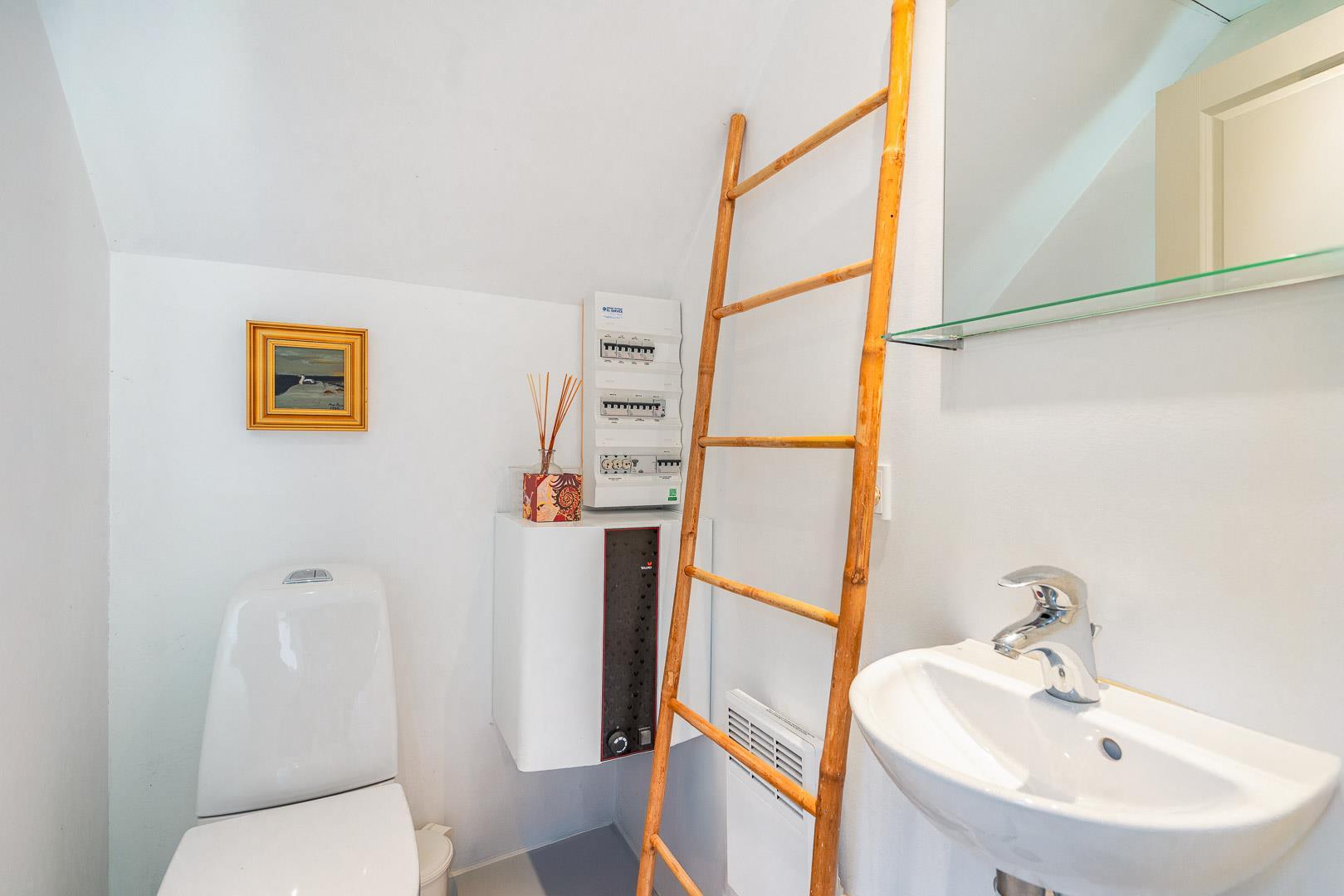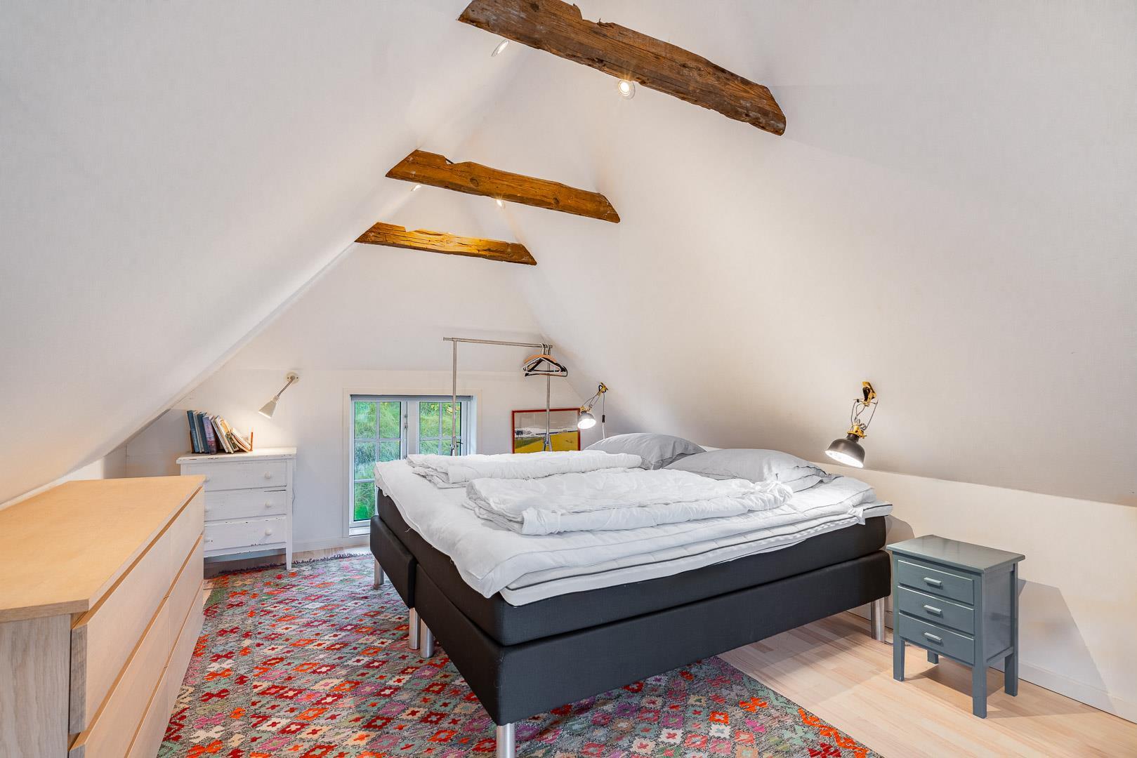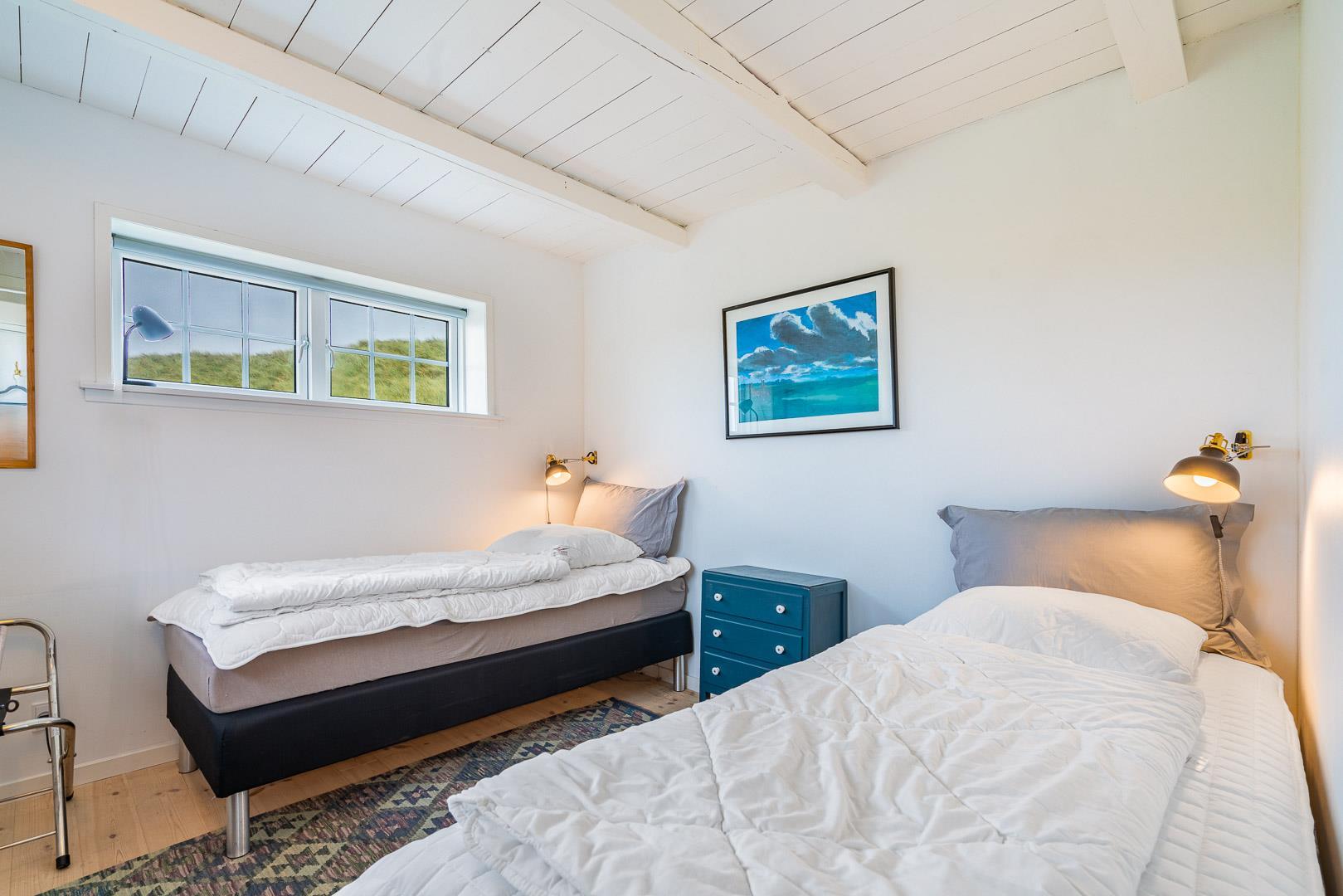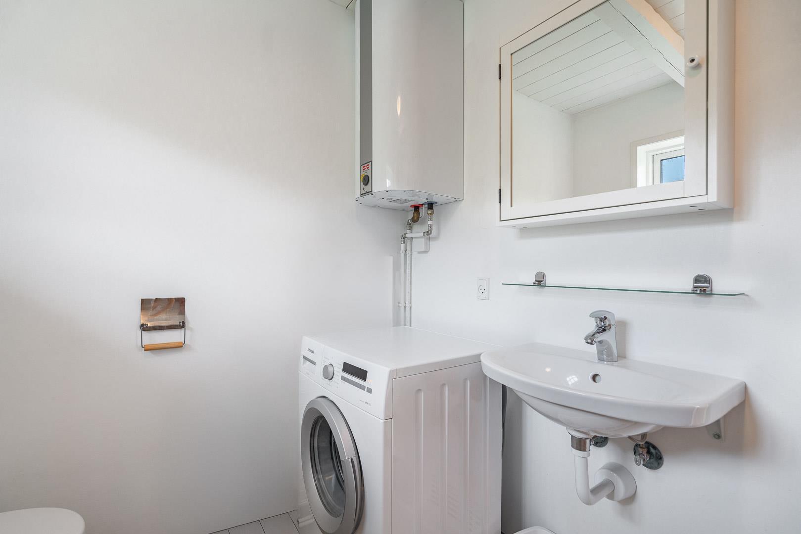 Sommerhuset har to soveværelser – ét med dobbeltseng og ét med to enkeltsenge – perfekt til både familier og par. Der er også vaskemaskine, så sommerhuset er praktisk til længere ophold og ferie med børn og hund. Badeværelset er lyst og funktionelt med bruser og toilet.