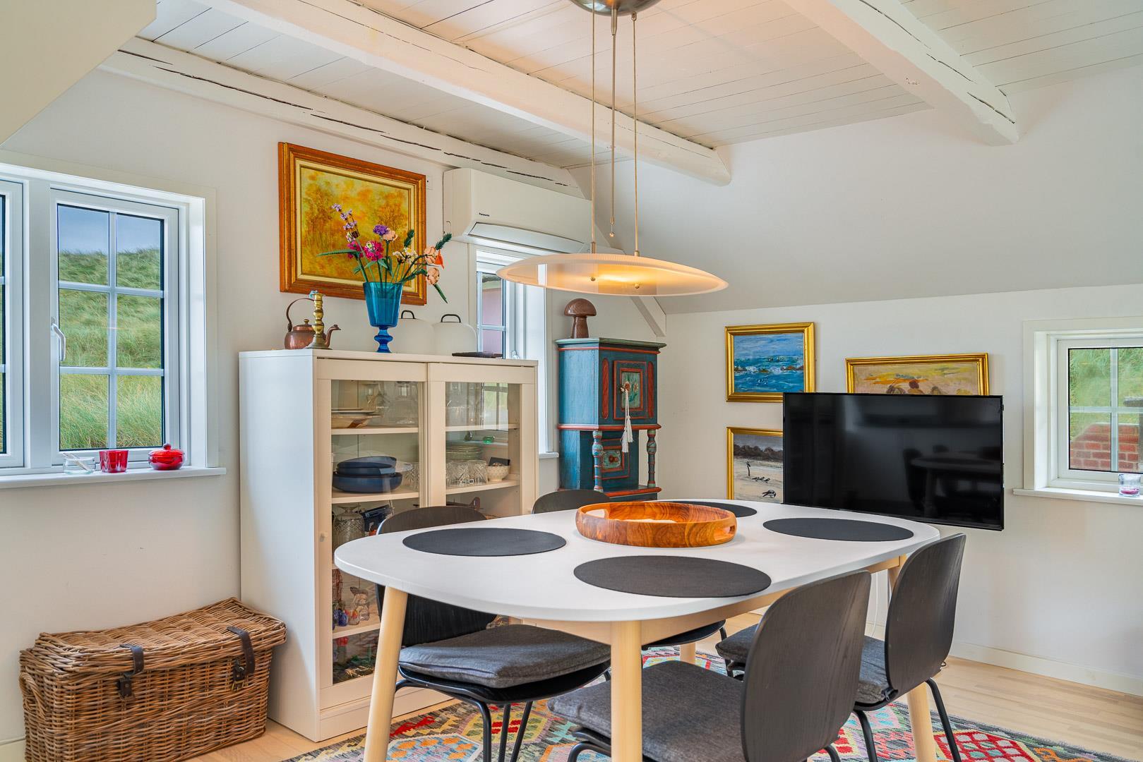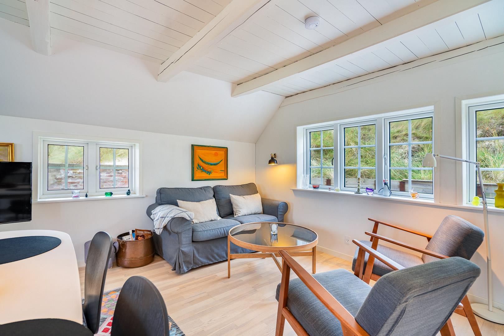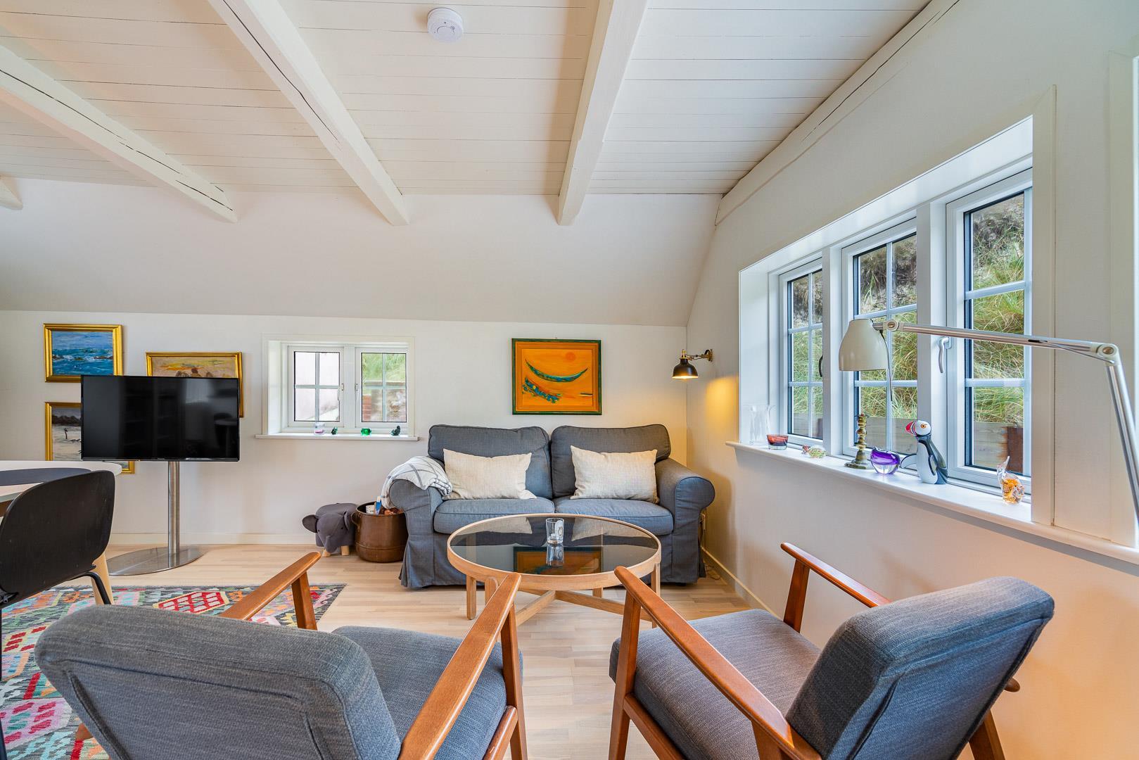 Sommerhusets hjerte er den lyse stue med store vinduer og udsigt til klitterne. Her strømmer dagslyset ind og skaber en behagelig atmosfære. Opholdsrummet er indrettet med komfortable møbler, spiseplads og TV – ideelt til afslapning, spil eller hyggelige måltider sammen. To moderne varmepumper sikrer et behageligt indeklima året rundt – både sommer og vinter.