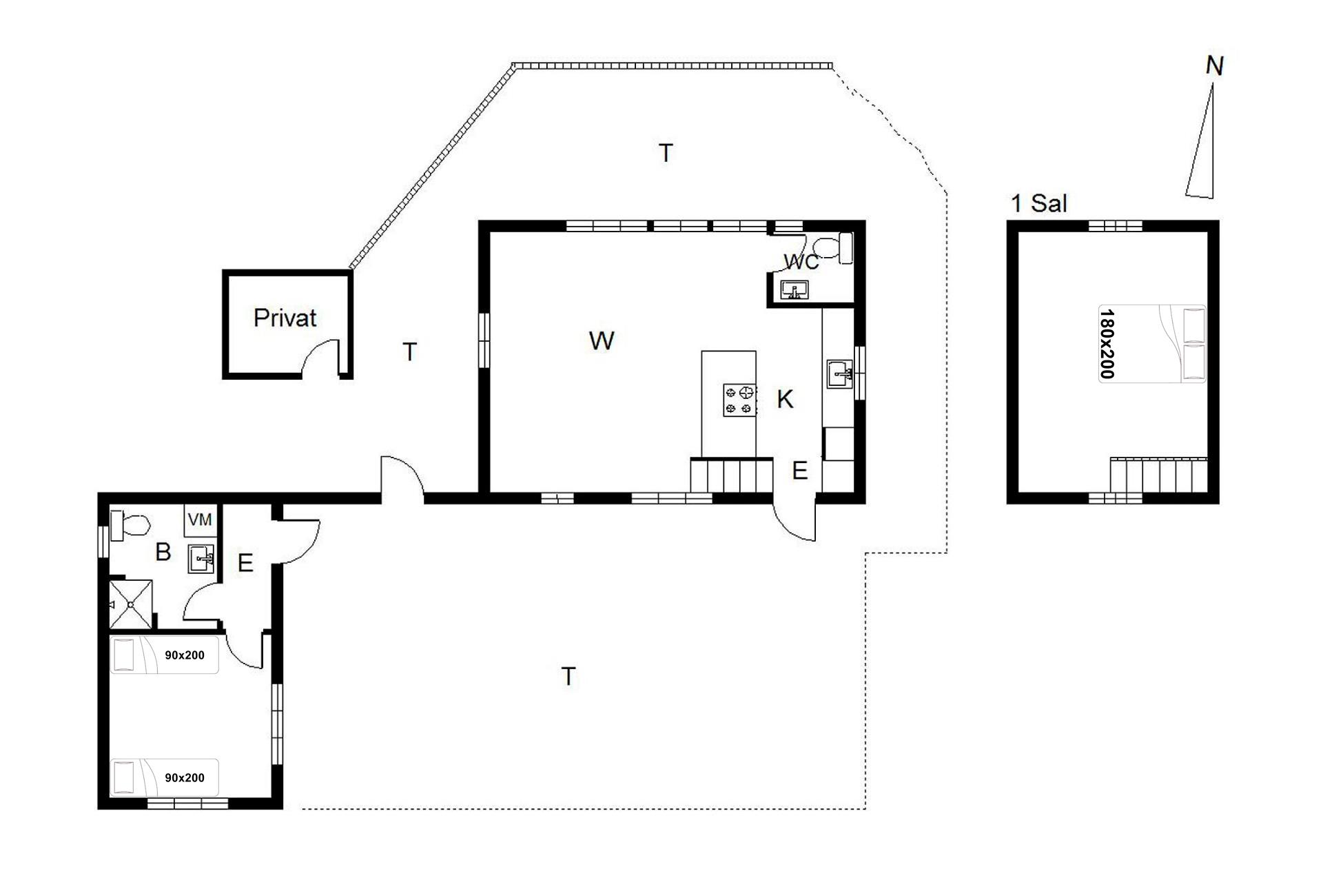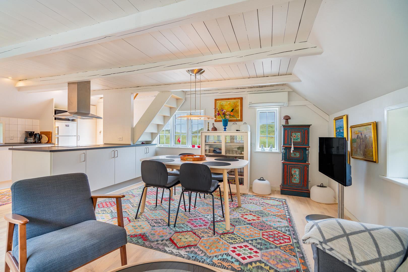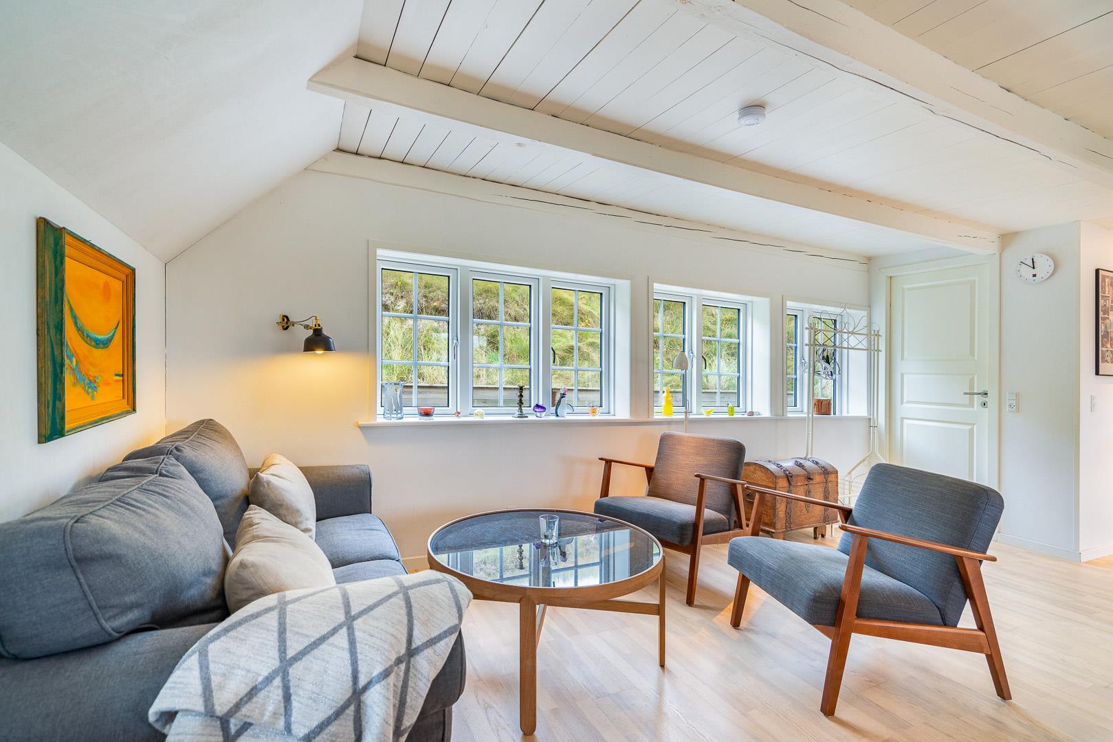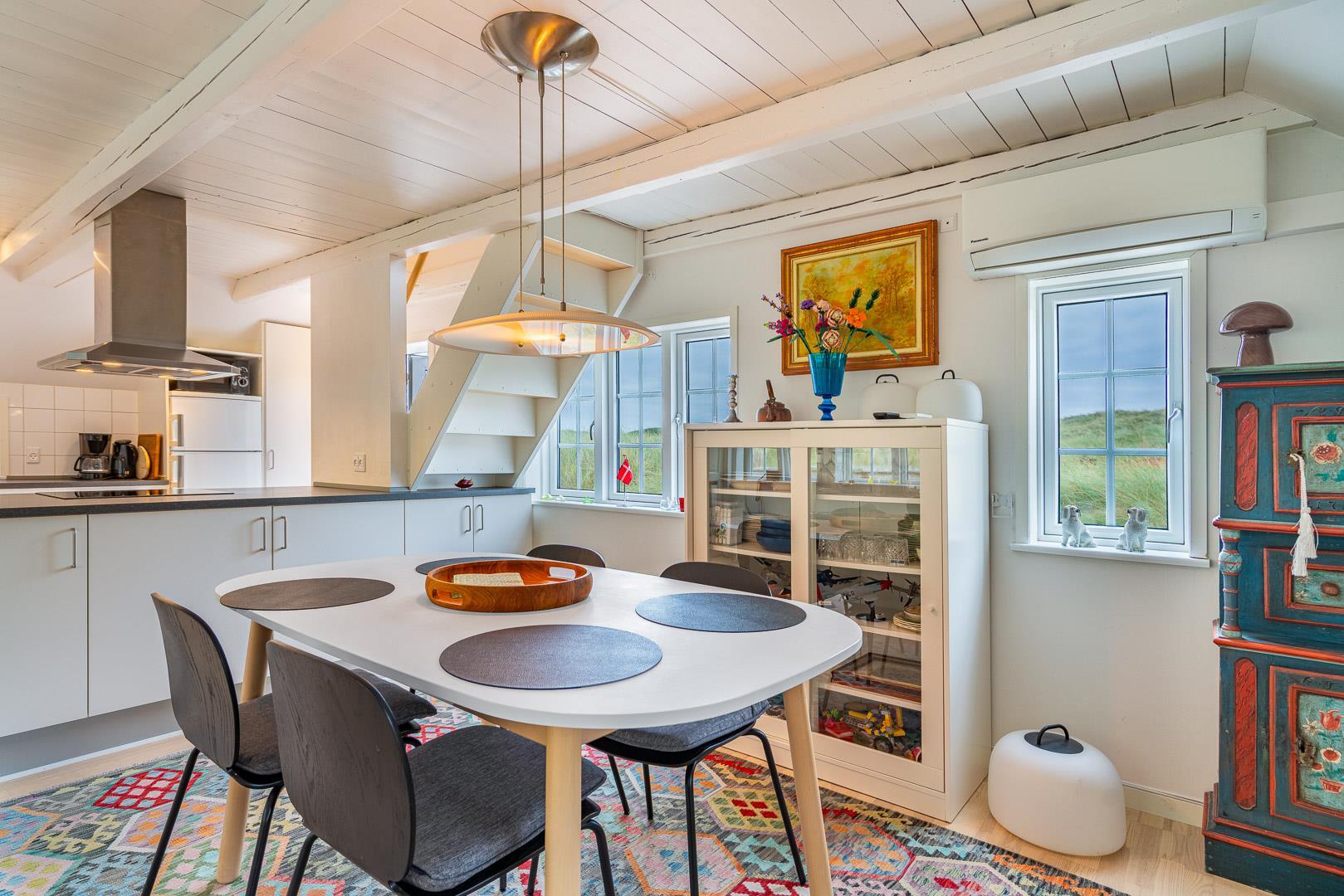 Sommerhusets hjerte er den lyse stue med store vinduer og udsigt til klitterne. Her strømmer dagslyset ind og skaber en behagelig atmosfære. Opholdsrummet er indrettet med komfortable møbler, spiseplads og TV – ideelt til afslapning, spil eller hyggelige måltider sammen. To moderne varmepumper sikrer et behageligt indeklima året rundt – både sommer og vinter.