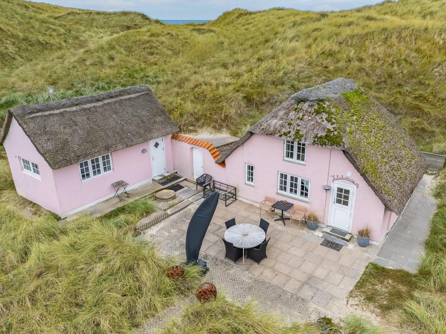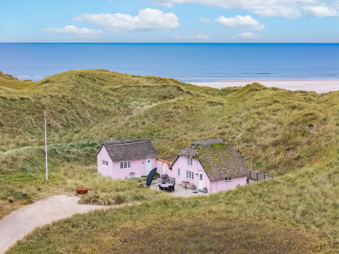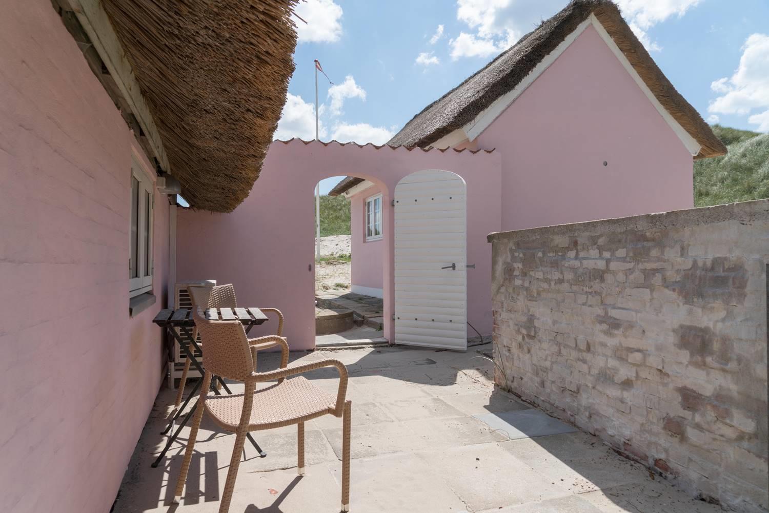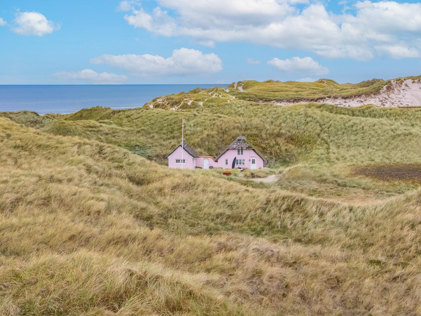 Med sin unikke rosa facade skiller sommerhuset sig ud på den mest charmerende måde. Skjult bag en høj klit får I her fred og privatliv – og samtidig ligger stranden kun få minutters gang væk.