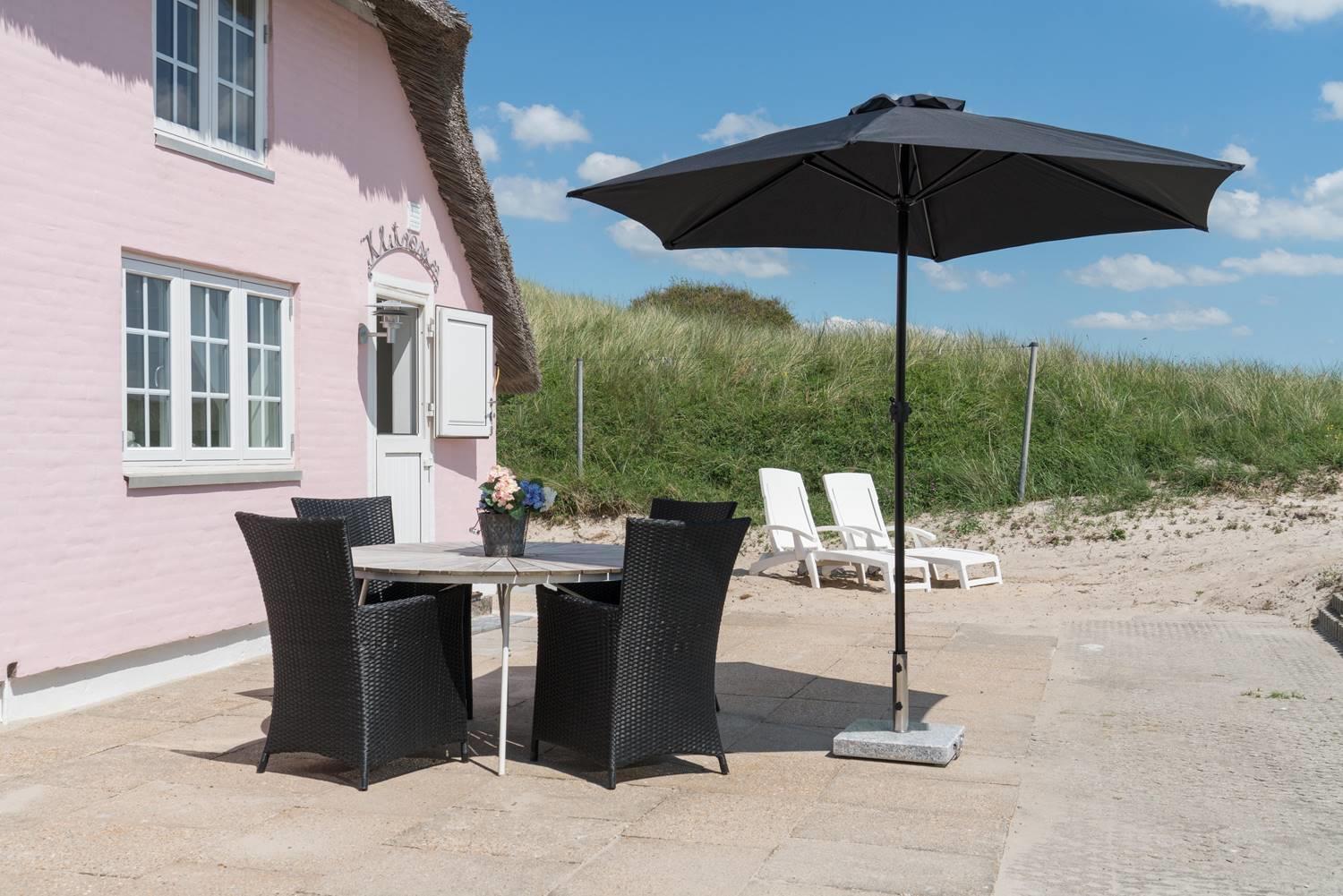 Udendørs byder sommerhuset på en dejlig, afskærmet terrasse med udsigt til klitterne. Her kan I nyde solen, drikke morgenkaffe i læ for vinden eller tænde grillen, mens dagen går på hæld.
