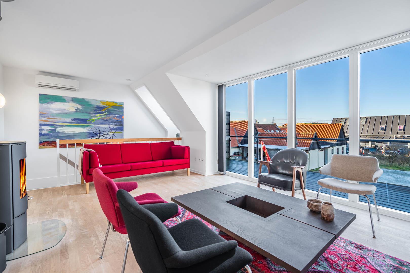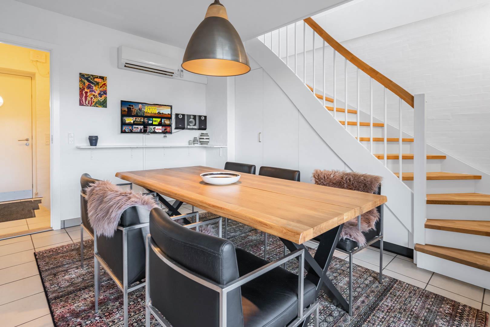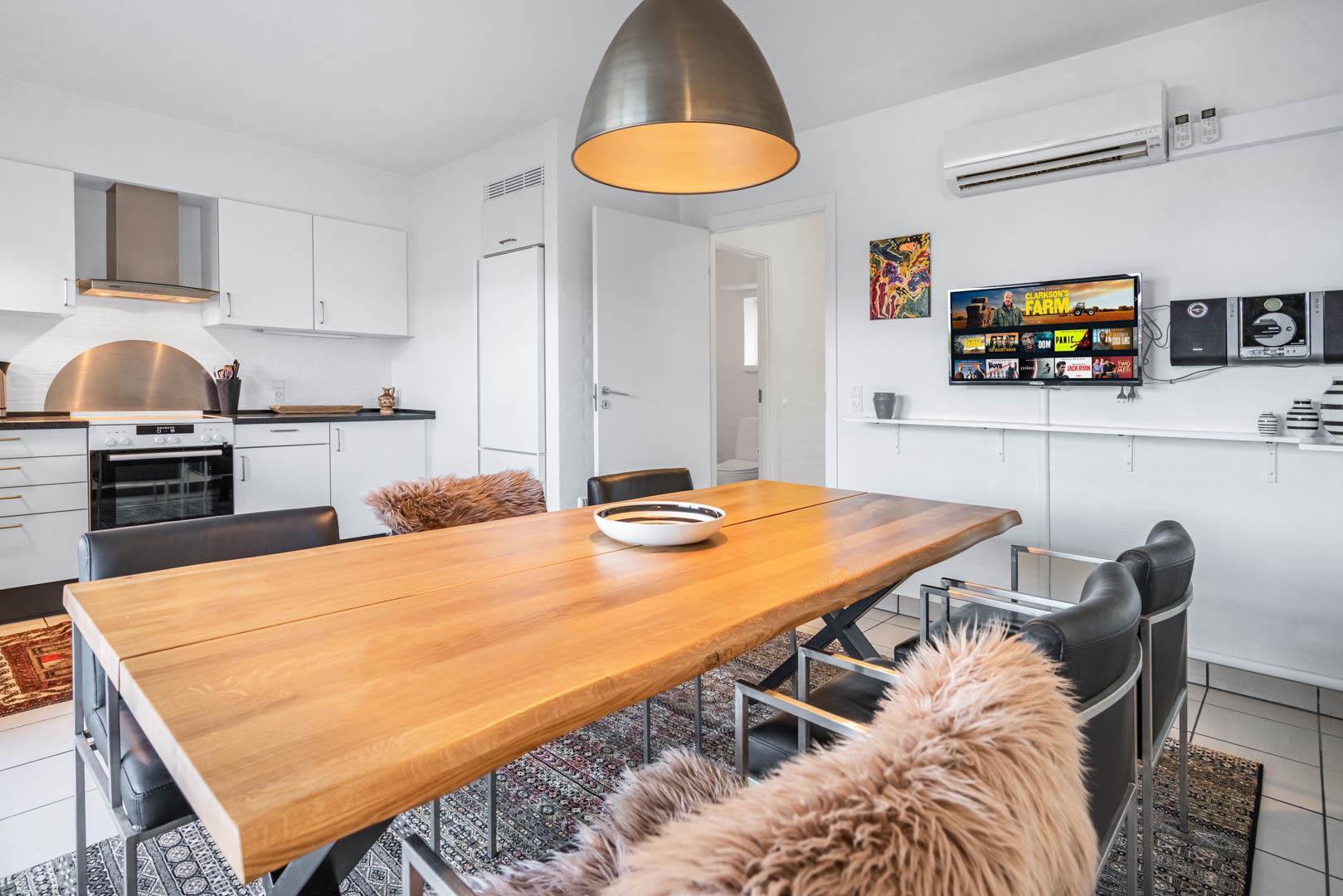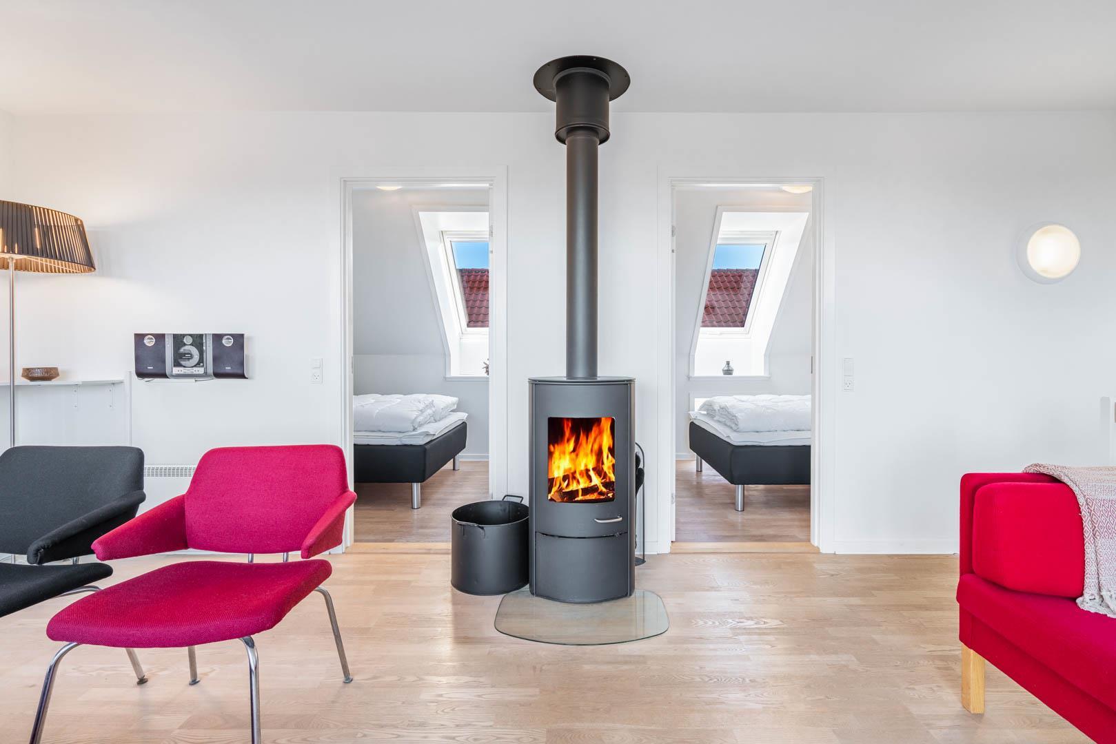 Lejligheden er udstyret med moderne faciliteter, herunder TV i alle soverum, stuen og køkkenalrummet. En brændeovn og varmepumpe sikrer et behageligt indeklima hele året rundt, samtidig med at strømforbruget holdes nede.
