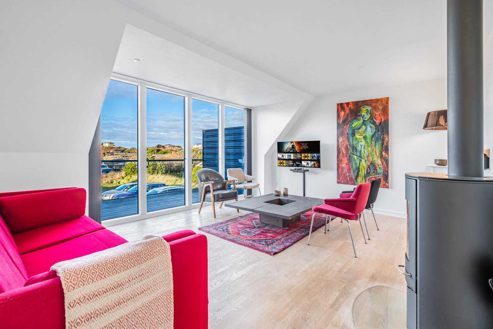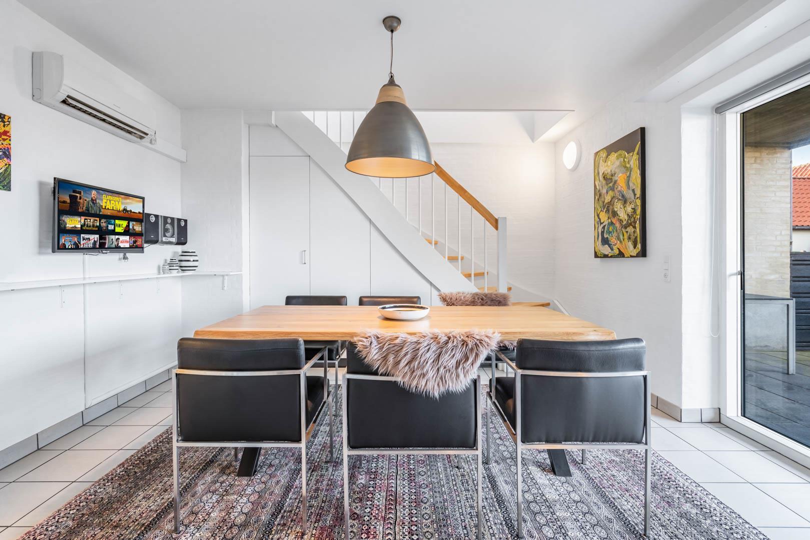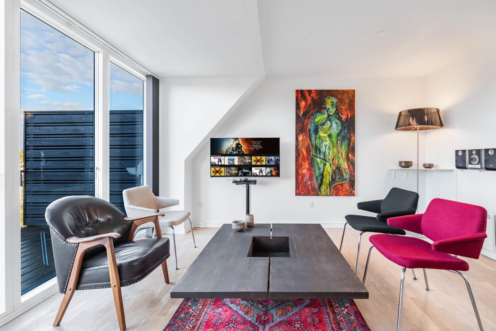 Lejligheden er udstyret med moderne faciliteter, herunder TV i alle soverum, stuen og køkkenalrummet. En brændeovn og varmepumpe sikrer et behageligt indeklima hele året rundt, samtidig med at strømforbruget holdes nede.