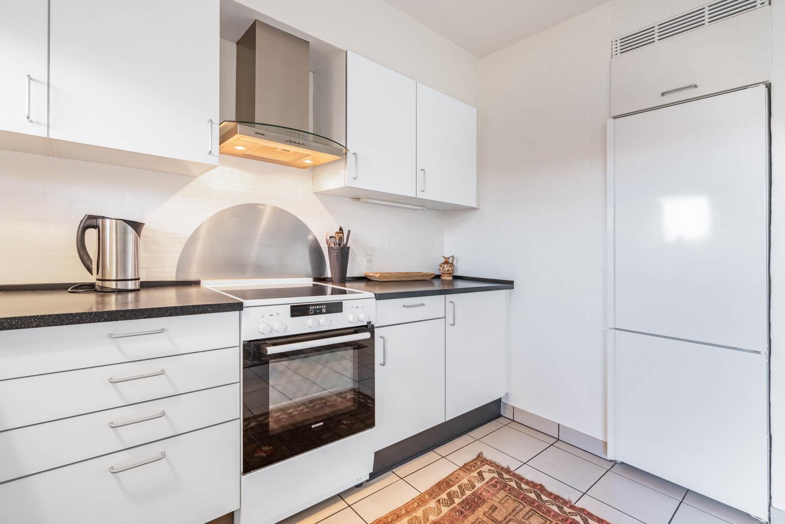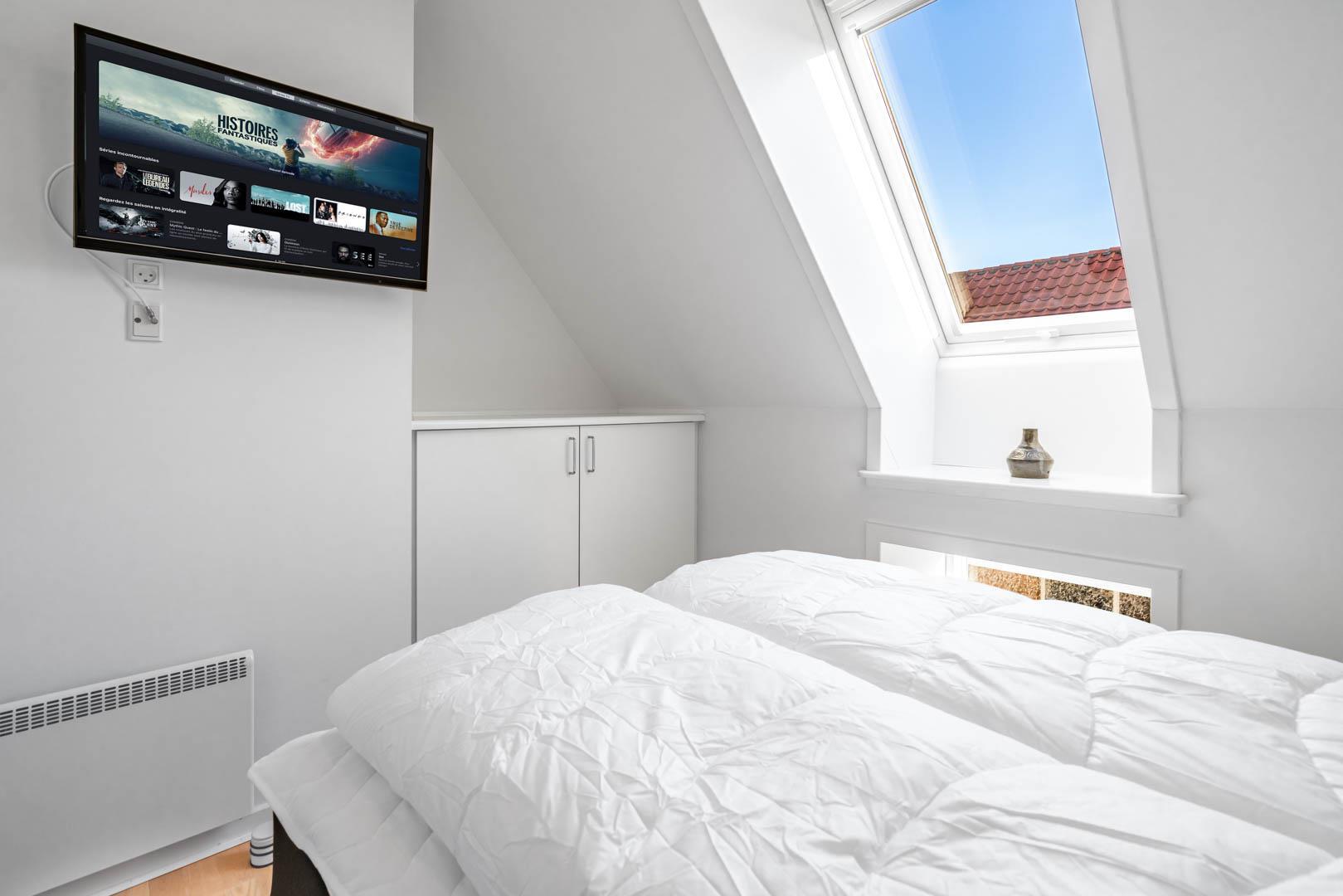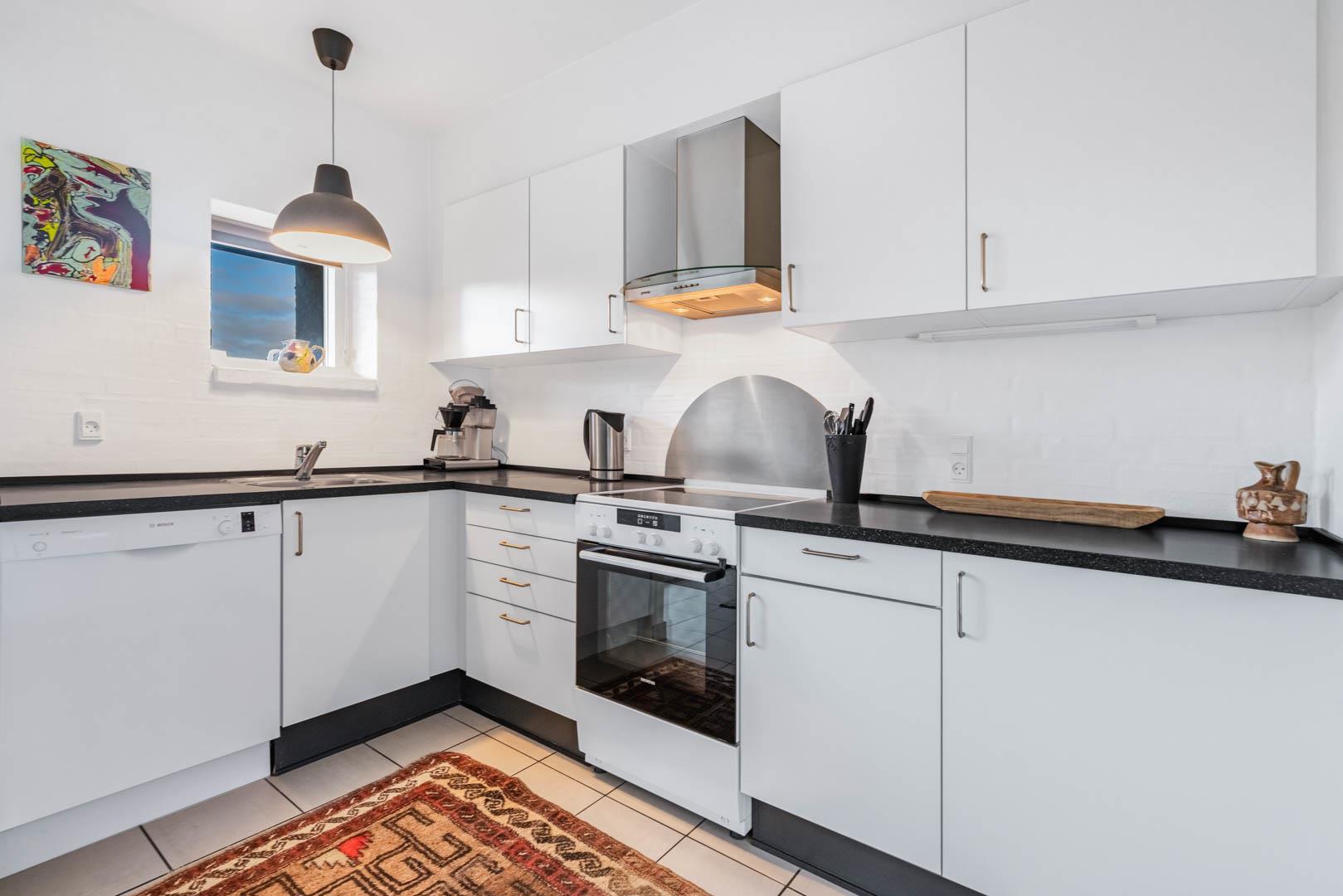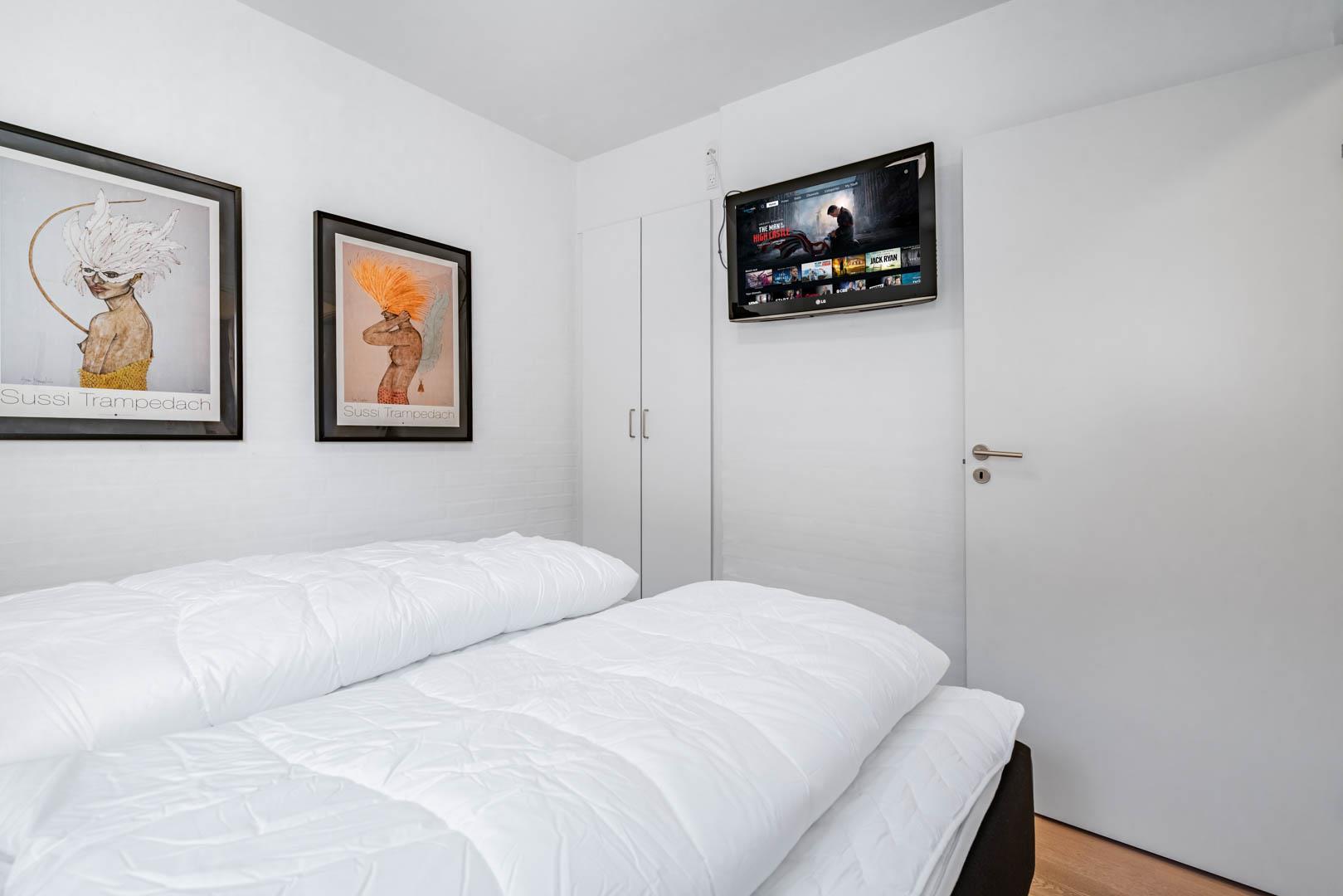 Lejligheden er udstyret med moderne faciliteter, herunder TV i alle soverum, stuen og køkkenalrummet. En brændeovn og varmepumpe sikrer et behageligt indeklima hele året rundt, samtidig med at strømforbruget holdes nede.