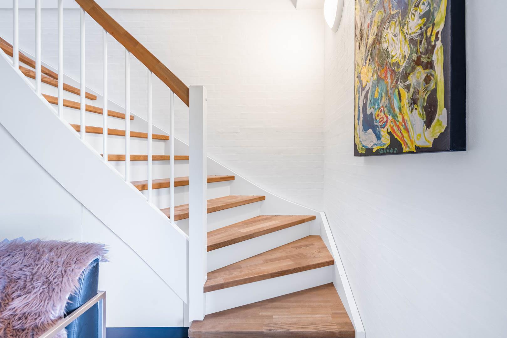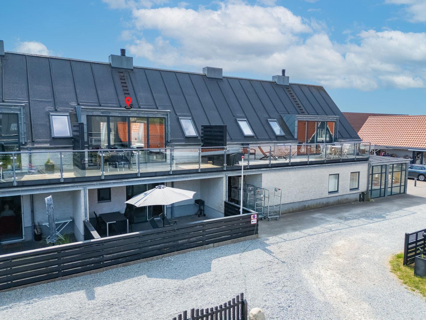 I stueplan træder du ind i en rummelig entre, der leder til et værelse, et badeværelse samt en skøn, delvist overdækket vestvendt gårdhave. Her kan du nyde solens stråler eller tilbringe de varme sommeraftener i ro og fred. På første sal finder du den åbne opholdsstue, som giver et fantastisk lysindfald og skaber en hyggelig atmosfære. To værelser og en stor vestvendt balkon giver dig endnu en mulighed for at nyde den friske luft og den smukke udsigt.