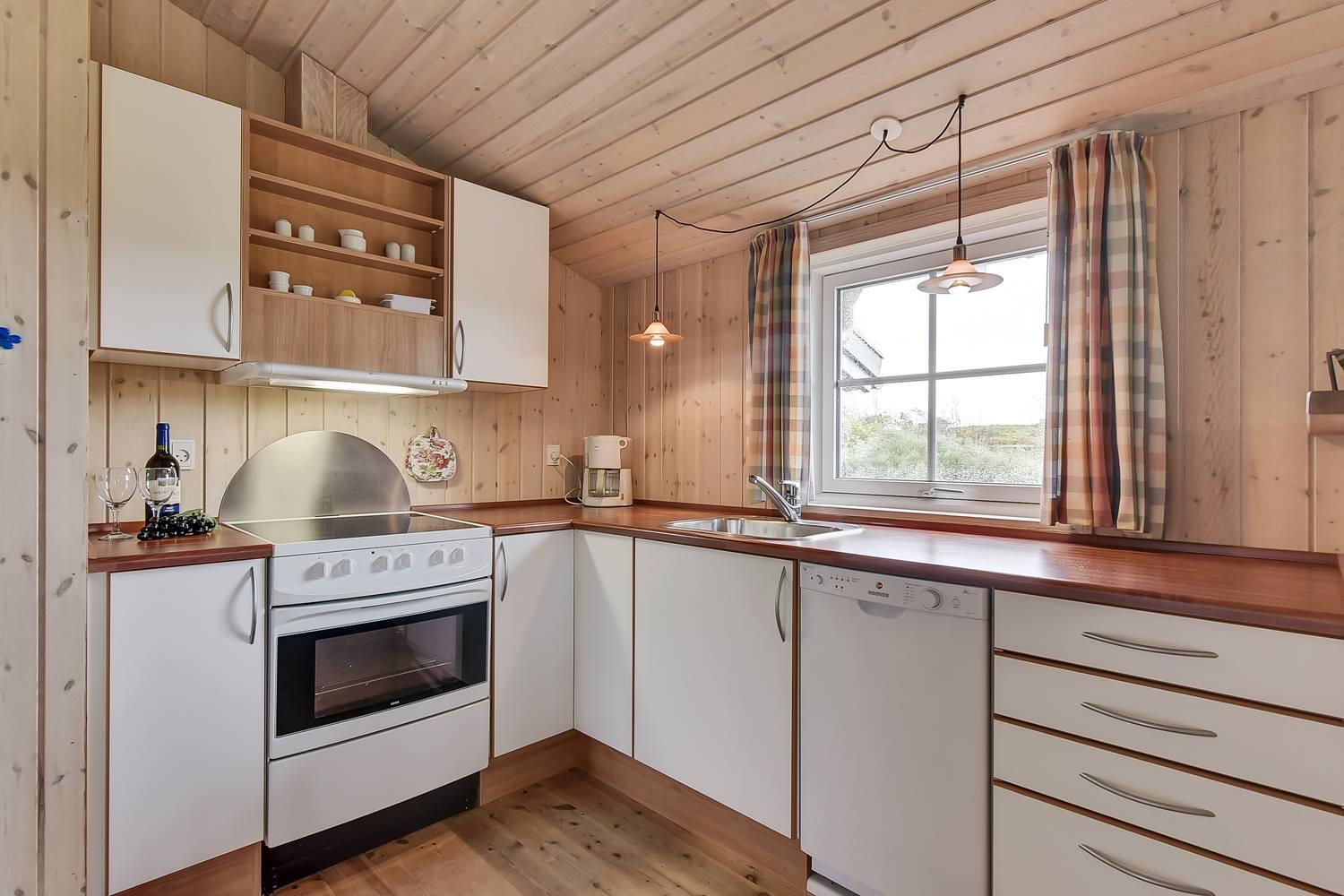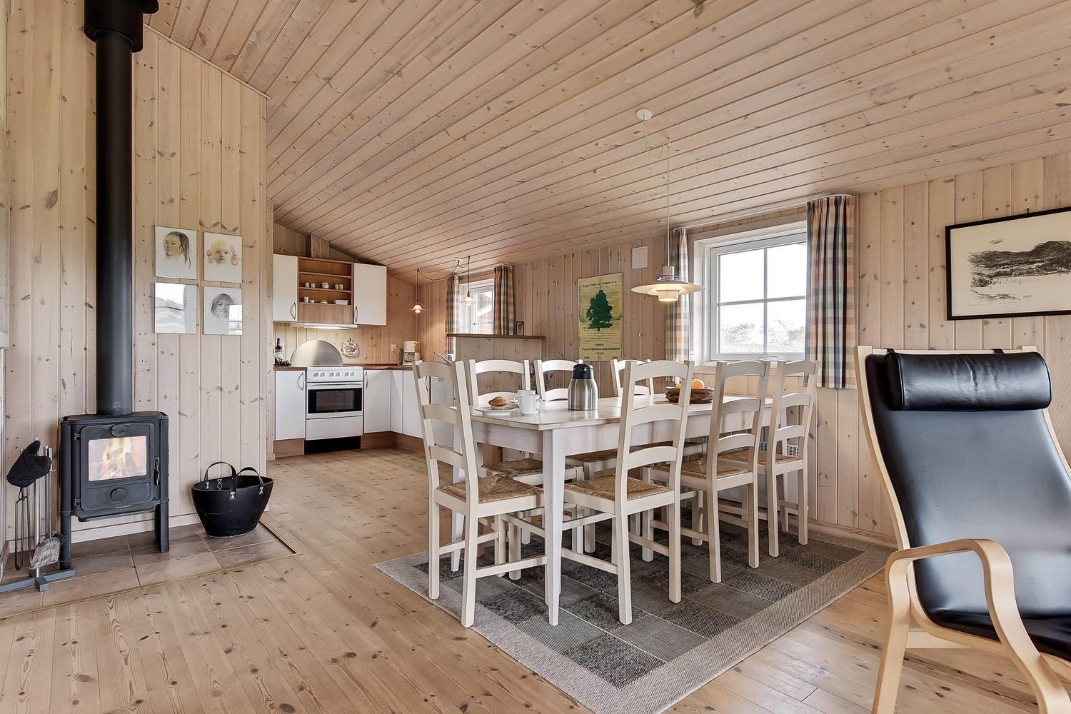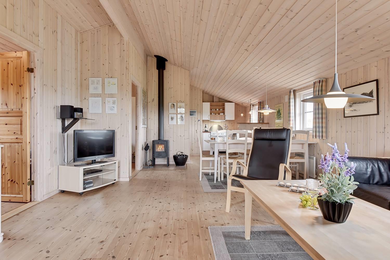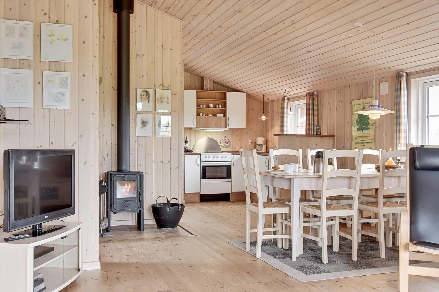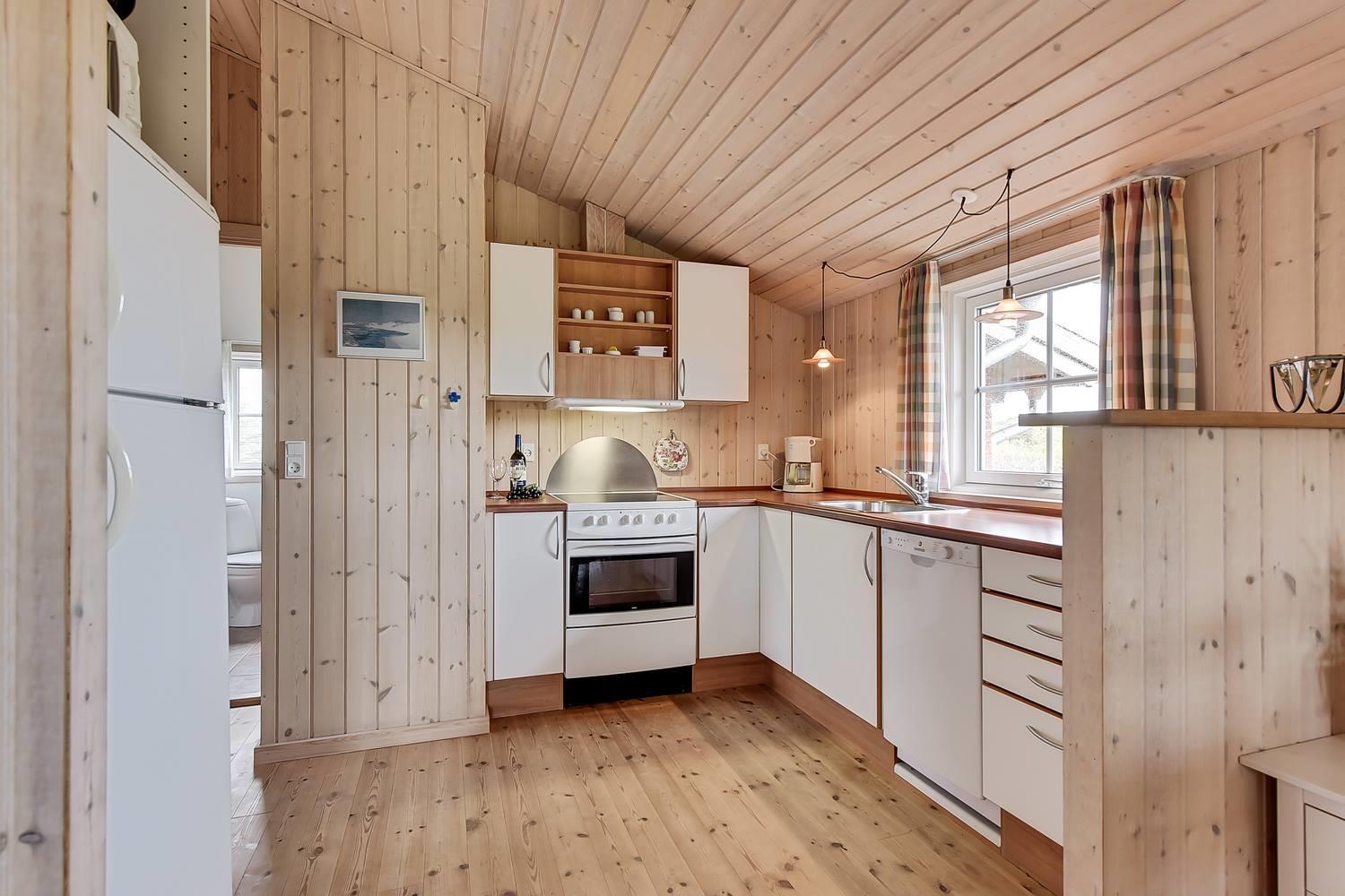 Et rigtig godt muret feriehus, beliggende på en lyngklædt grund grænsende op til stort friareal. Entre med god plads til overtøj m.v. og herfra adgang til stue med moderne og gode møbler. Hele huset har trægulve og fremstår overalt lyst og venligt. Terrasse på 2 sider af huset mod syd og vest.
