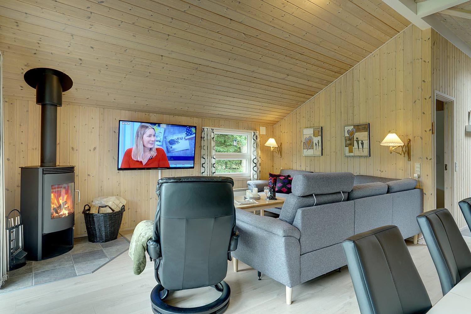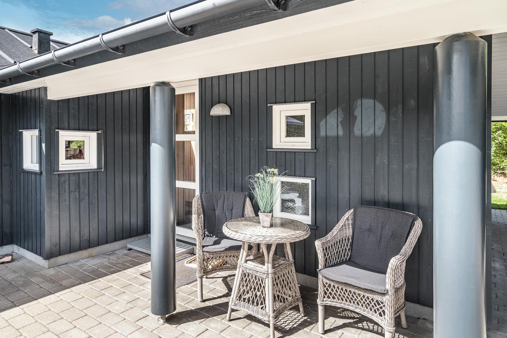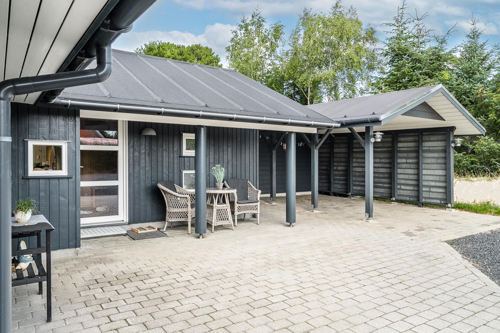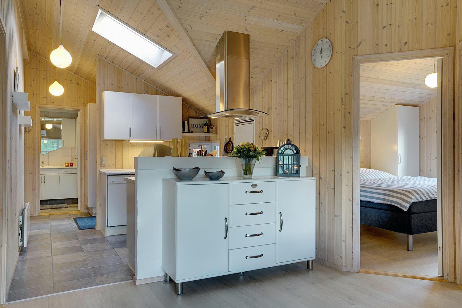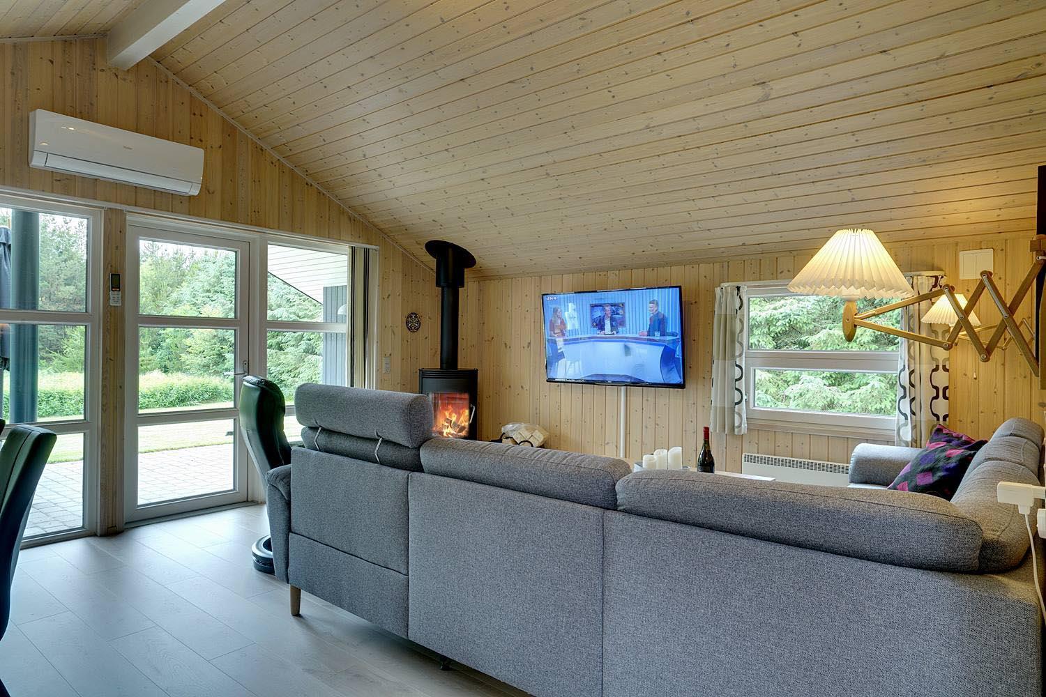 Sommerhusets hjerte er det dejlige køkken i åben forbindelse med den hyggelige stue, der er indrettet med komfortable møbler og en imponerende loftshøjde til kip. Parketgulvet giver et frisk og moderne udtryk, og med både brændeovn og et luft-til-luft varmesystem kan du nyde et lavt energiforbrug og en behagelig varme året rundt. Fra stuen er der direkte udgang til en delvist overdækket sydvendt terrasse, perfekt til afslapning og hyggelige grillmåltider på Weber-kuglegrillen.