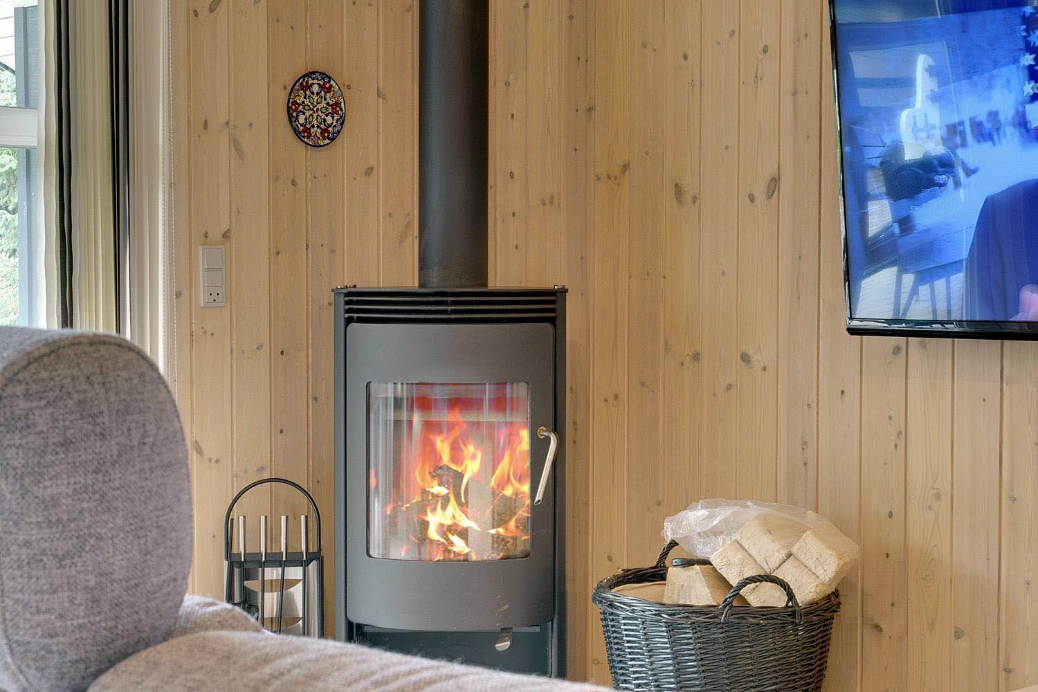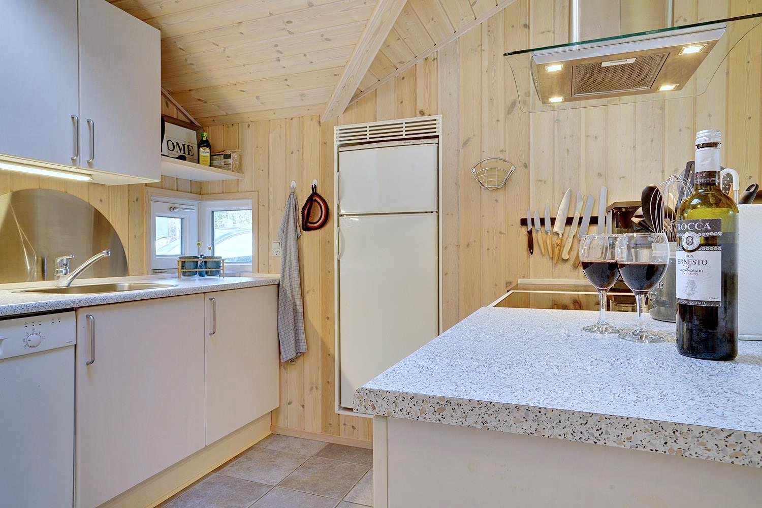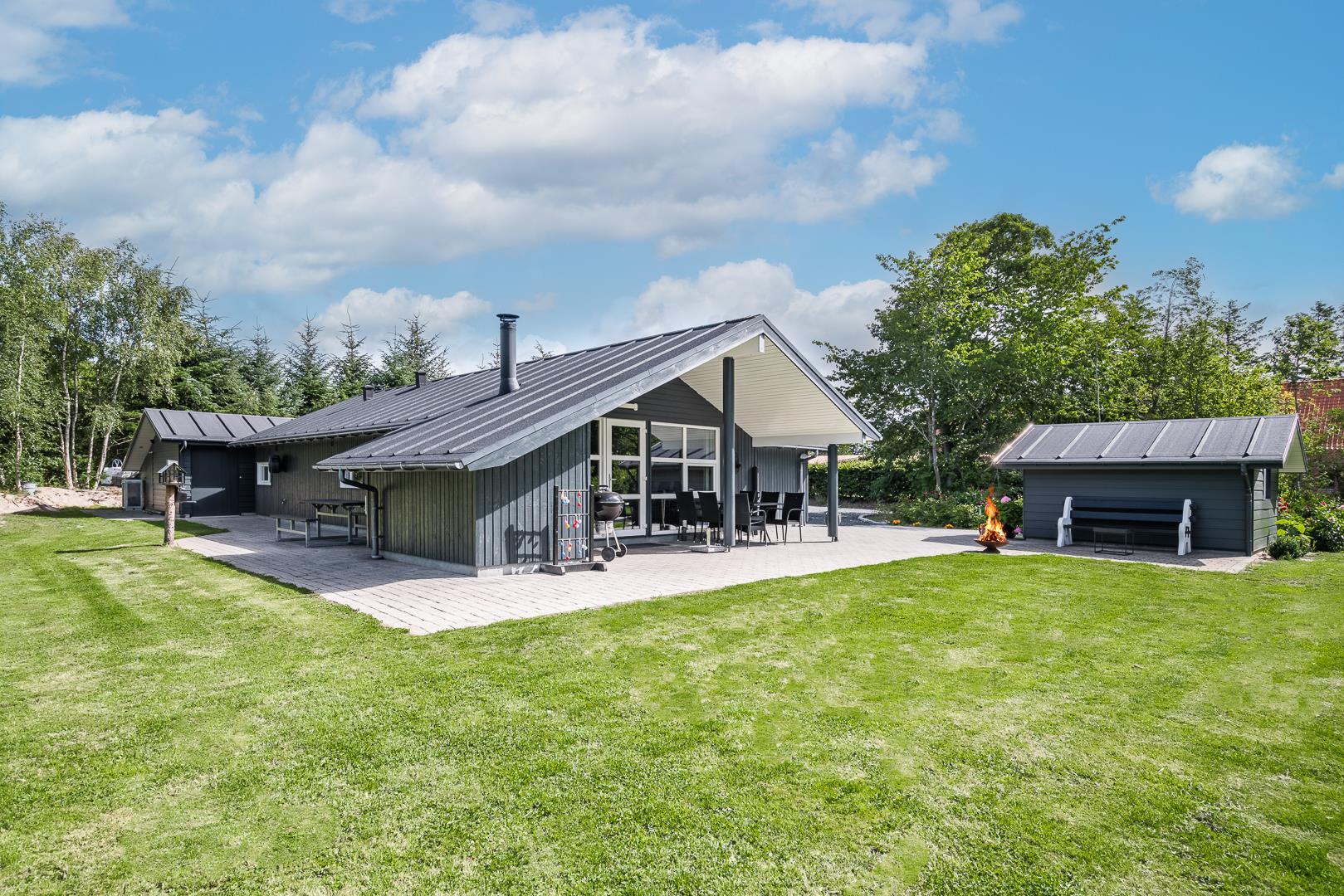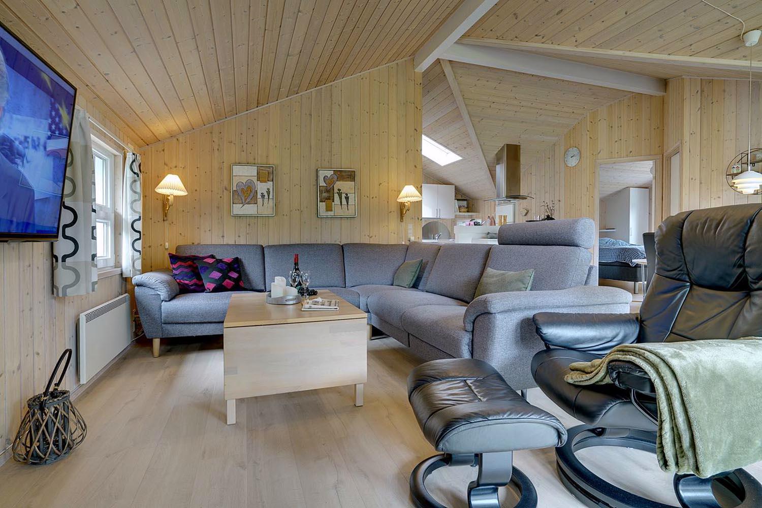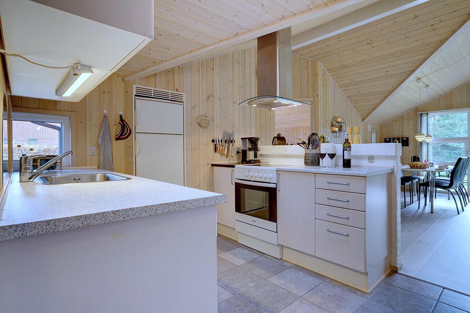 Sommerhusets hjerte er det dejlige køkken i åben forbindelse med den hyggelige stue, der er indrettet med komfortable møbler og en imponerende loftshøjde til kip. Parketgulvet giver et frisk og moderne udtryk, og med både brændeovn og et luft-til-luft varmesystem kan du nyde et lavt energiforbrug og en behagelig varme året rundt. Fra stuen er der direkte udgang til en delvist overdækket sydvendt terrasse, perfekt til afslapning og hyggelige grillmåltider på Weber-kuglegrillen.