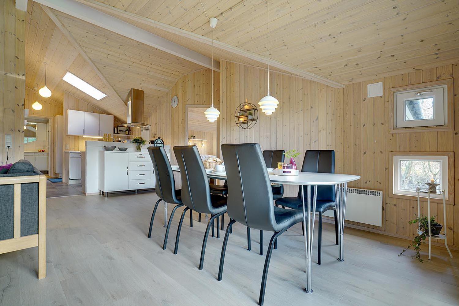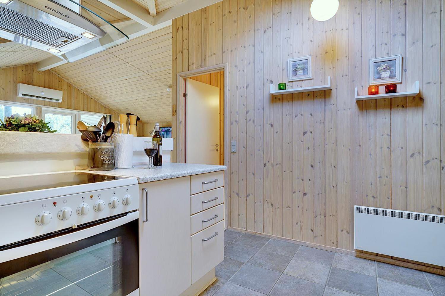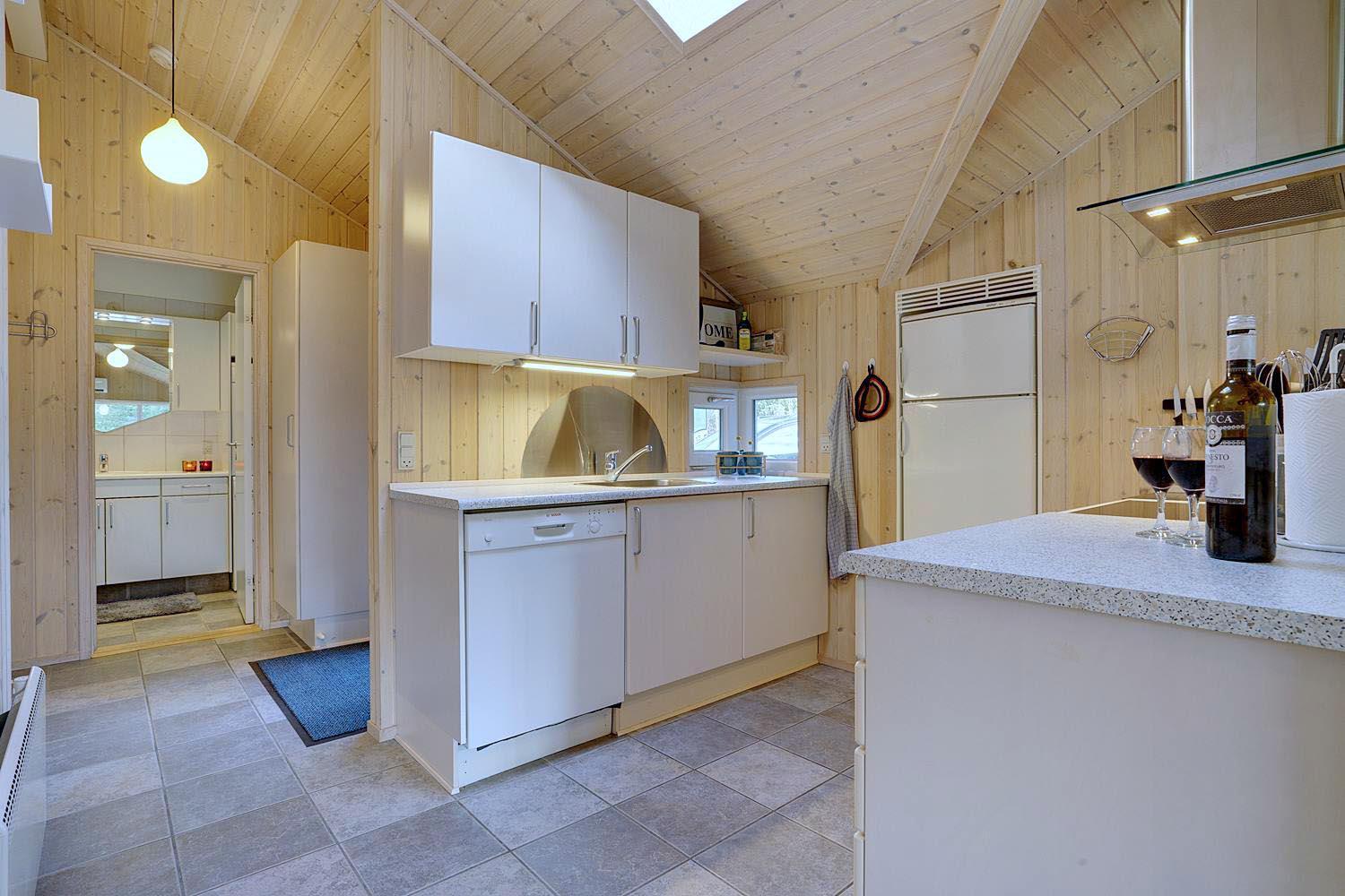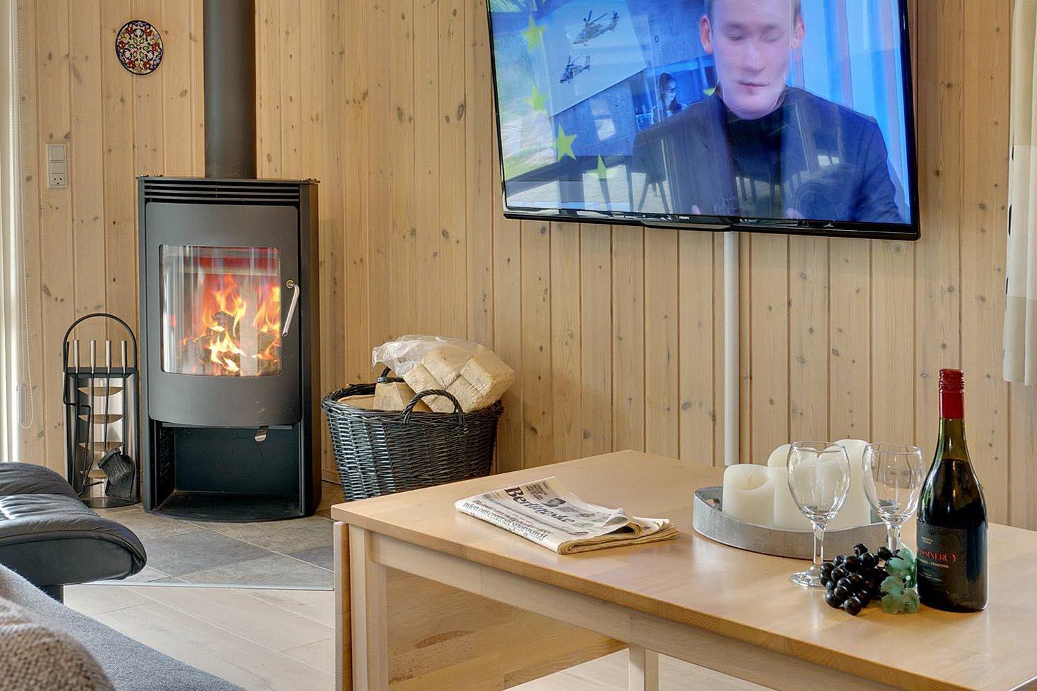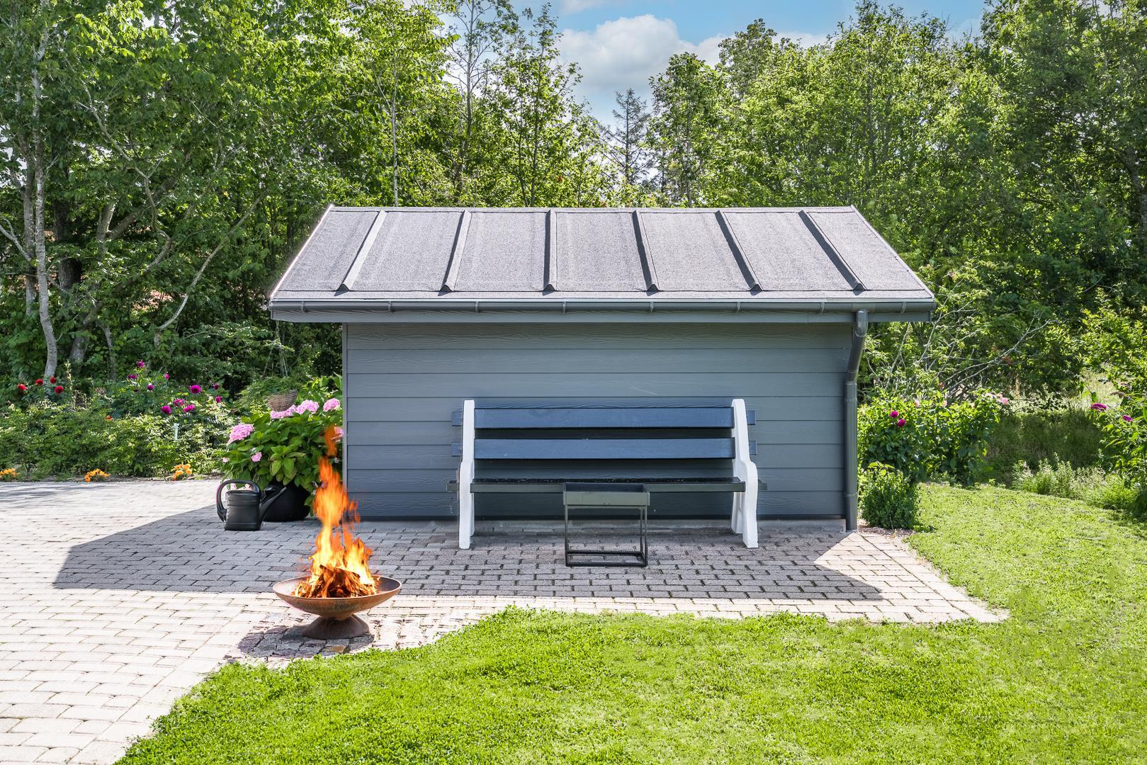 Sommerhusets hjerte er det dejlige køkken i åben forbindelse med den hyggelige stue, der er indrettet med komfortable møbler og en imponerende loftshøjde til kip. Parketgulvet giver et frisk og moderne udtryk, og med både brændeovn og et luft-til-luft varmesystem kan du nyde et lavt energiforbrug og en behagelig varme året rundt. Fra stuen er der direkte udgang til en delvist overdækket sydvendt terrasse, perfekt til afslapning og hyggelige grillmåltider på Weber-kuglegrillen.