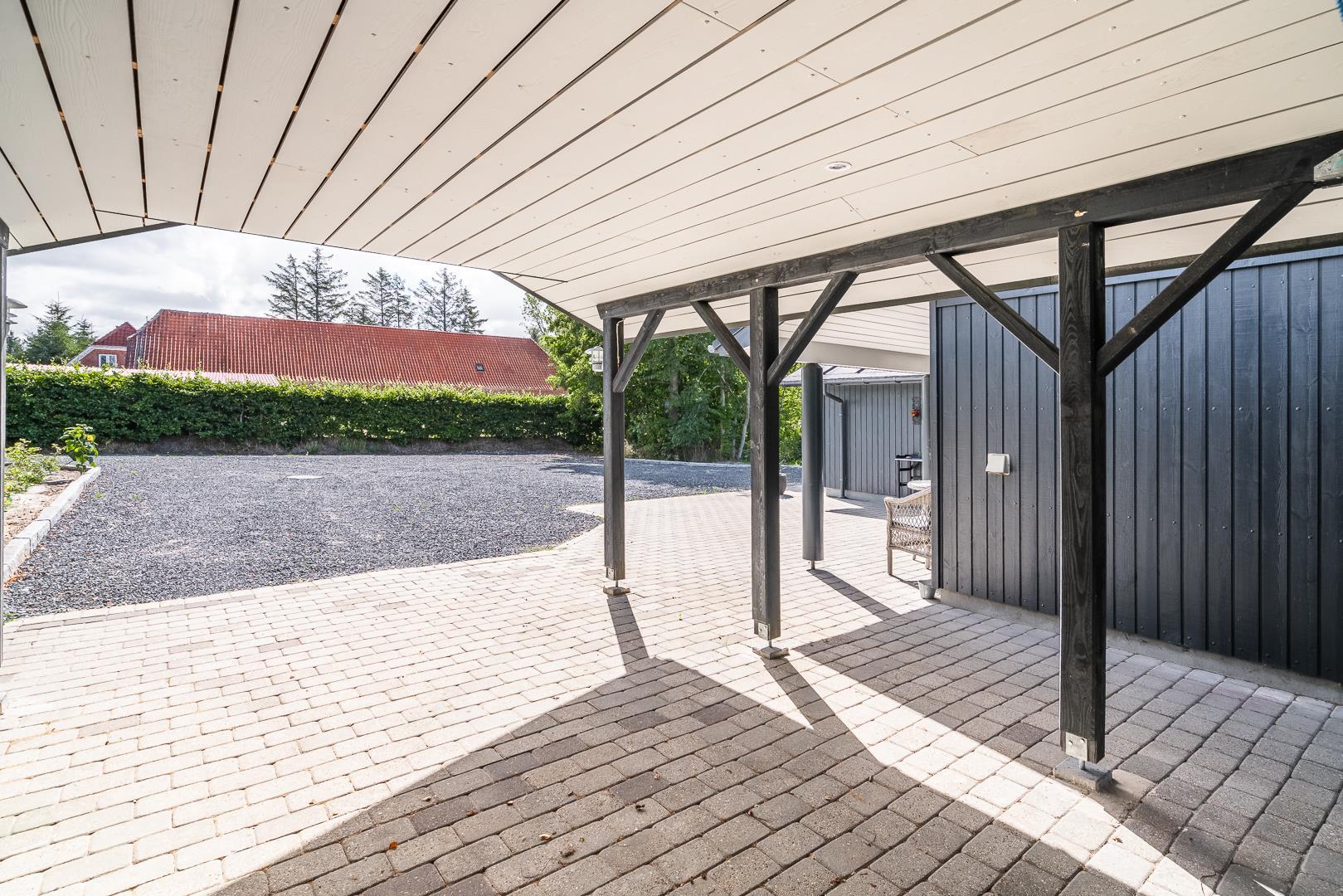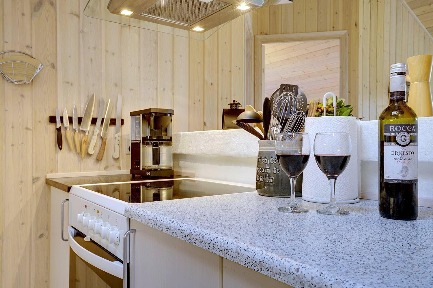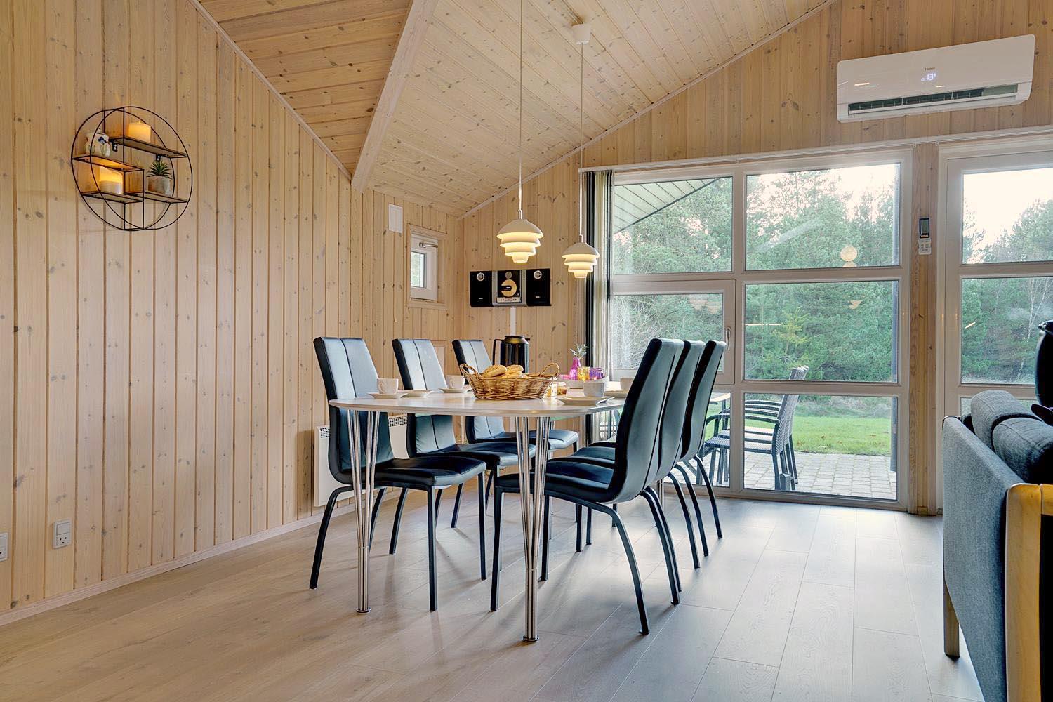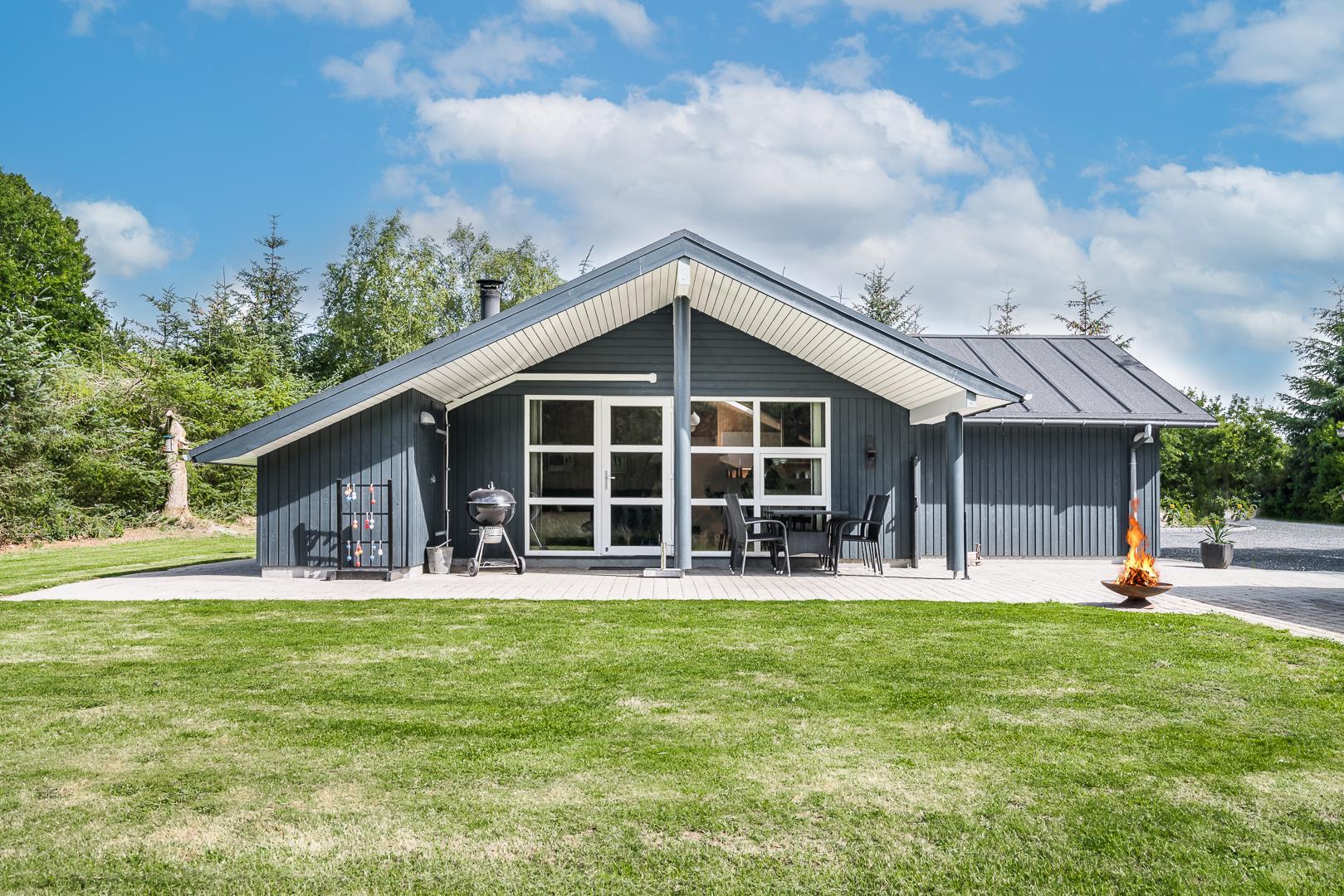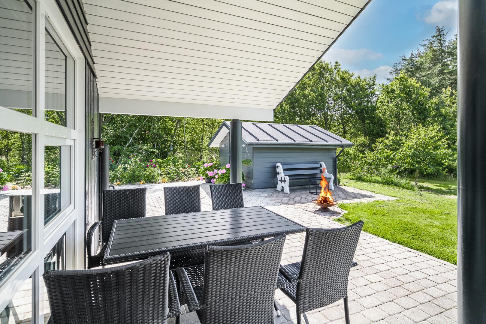 Sommerhusets hjerte er det dejlige køkken i åben forbindelse med den hyggelige stue, der er indrettet med komfortable møbler og en imponerende loftshøjde til kip. Parketgulvet giver et frisk og moderne udtryk, og med både brændeovn og et luft-til-luft varmesystem kan du nyde et lavt energiforbrug og en behagelig varme året rundt. Fra stuen er der direkte udgang til en delvist overdækket sydvendt terrasse, perfekt til afslapning og hyggelige grillmåltider på Weber-kuglegrillen.