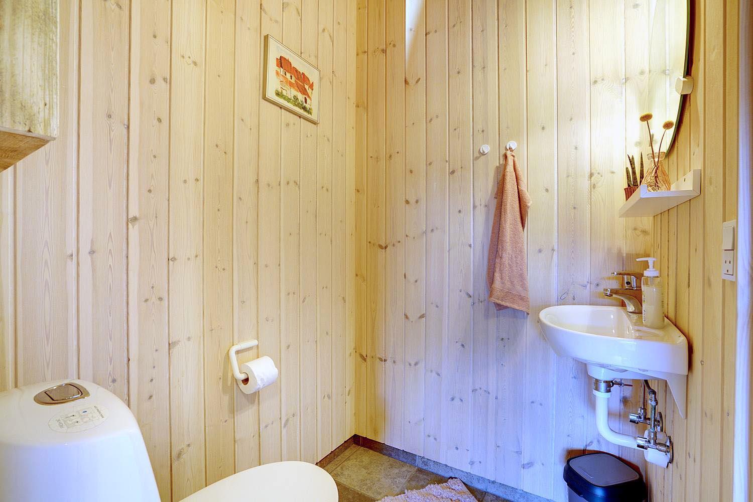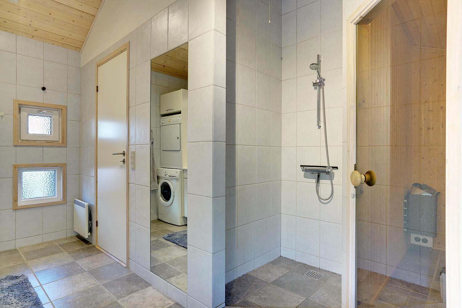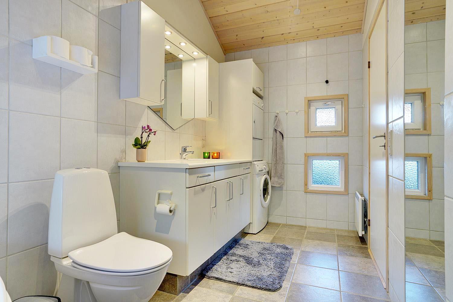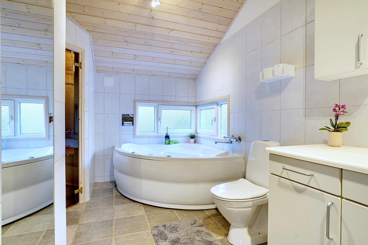 Sommerhusets badeværelser er en oase af velvære. Det store badeværelse er udstyret med sauna, hvor du kan forkæle dig selv og nyde total afslapning. Derudover er der et mindre ekstra toilet. Hele sommerhuset er komfortabelt opvarmet med gulvvarme i badeværelserne, gangen og køkkenet.