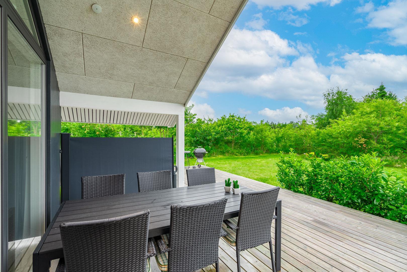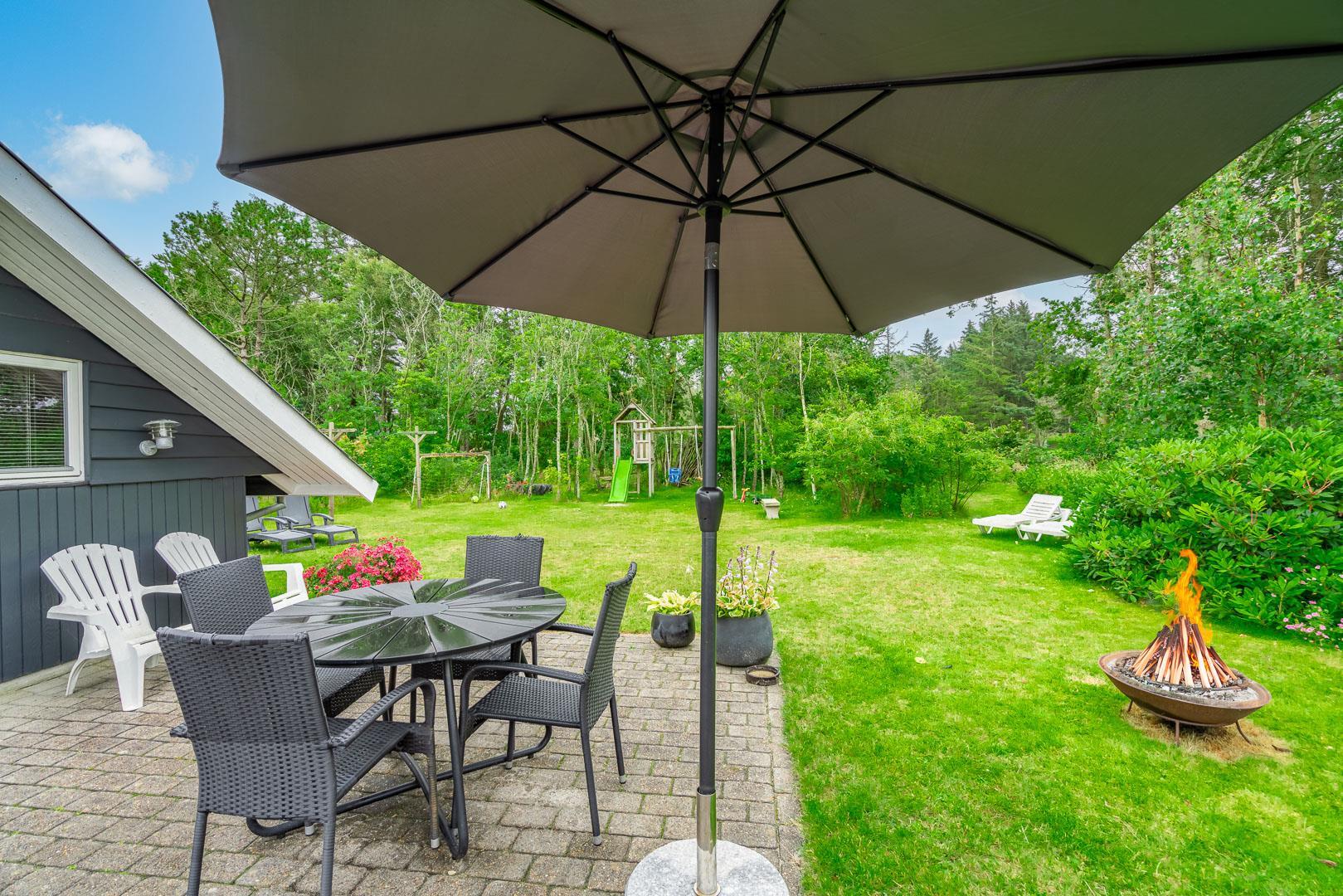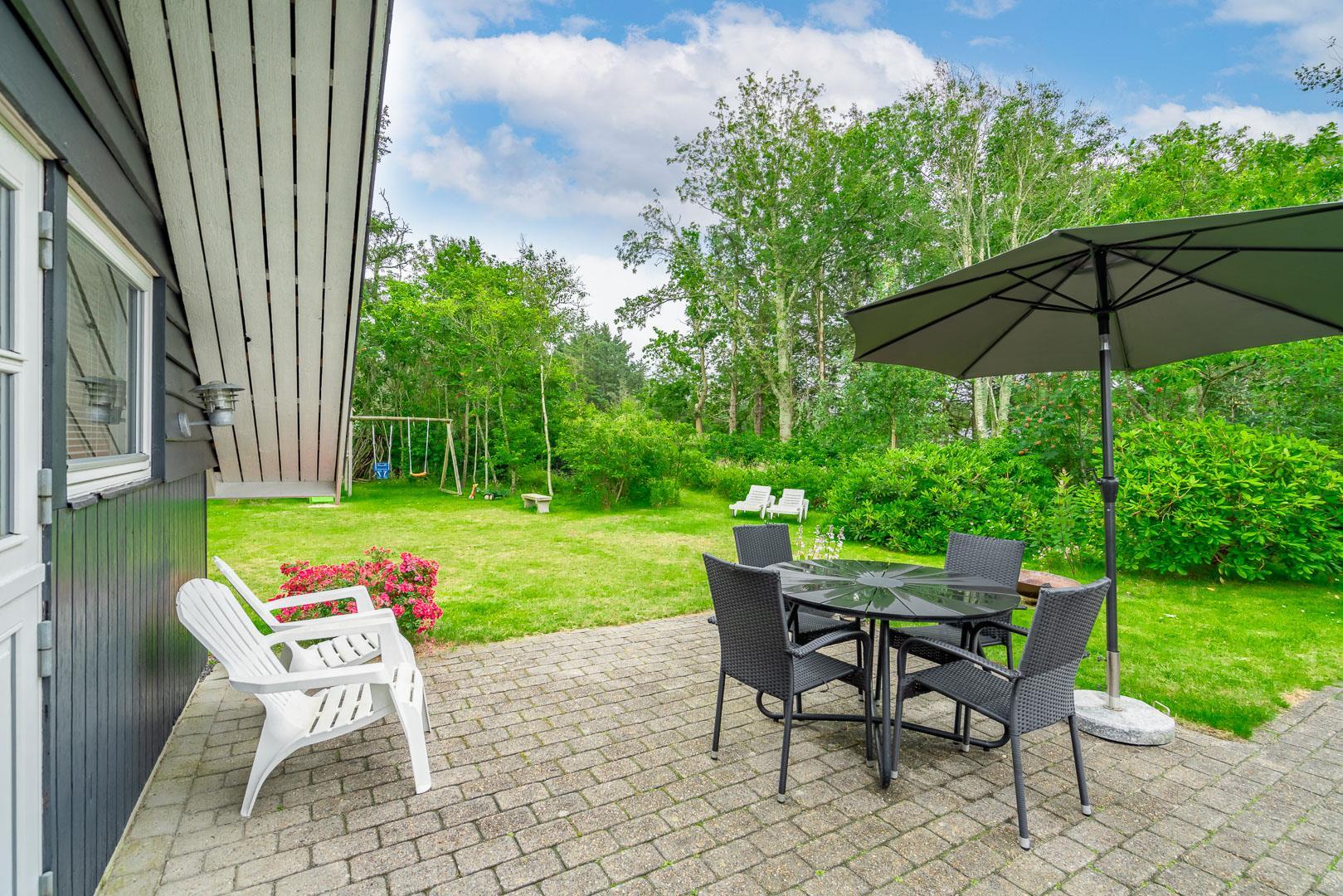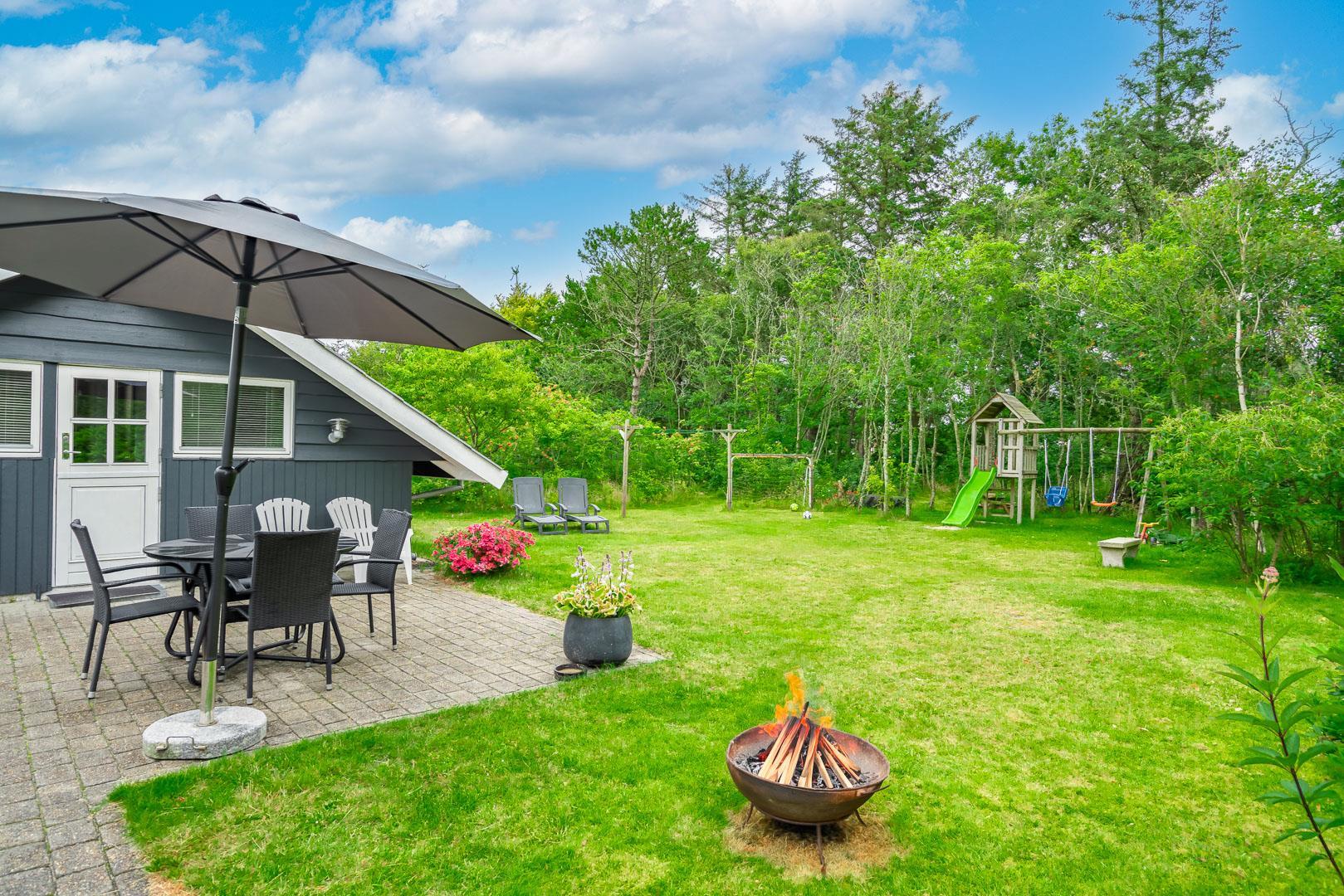 Den overdækkede terrasse gør det muligt at sidde ude og nyde den friske luft – også når vejret ikke er helt perfekt. Imens kan børnene lege på gyngen eller i sandkassen – ideelle rammer for en familieferie i Henne Strand.