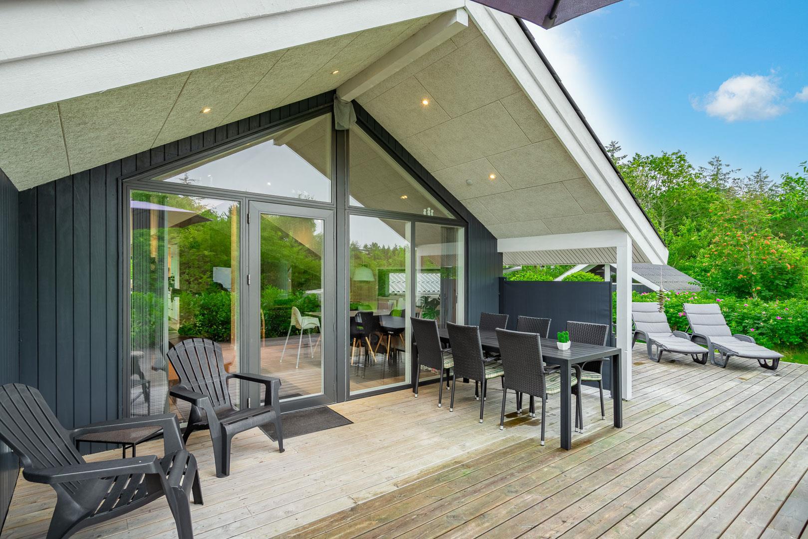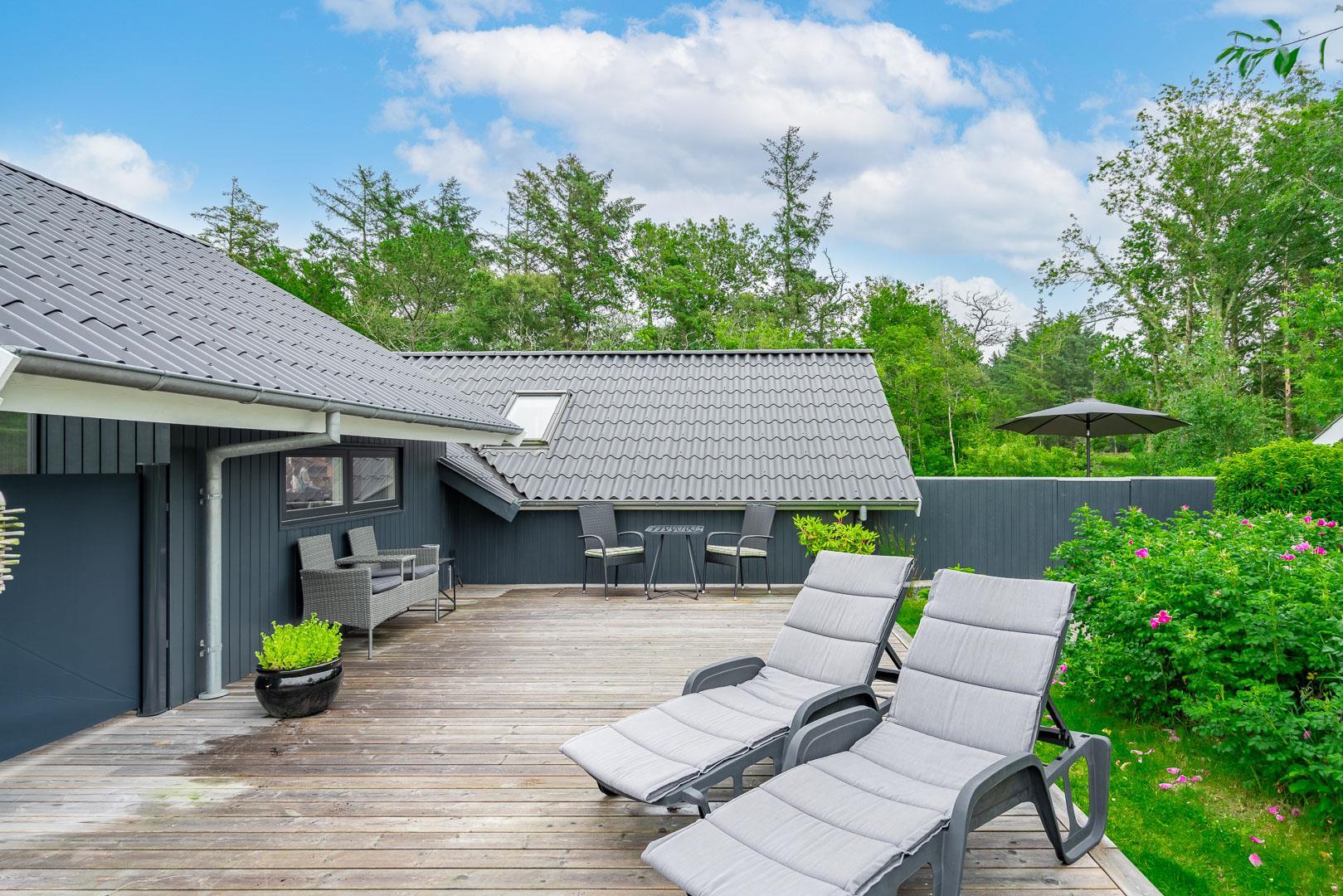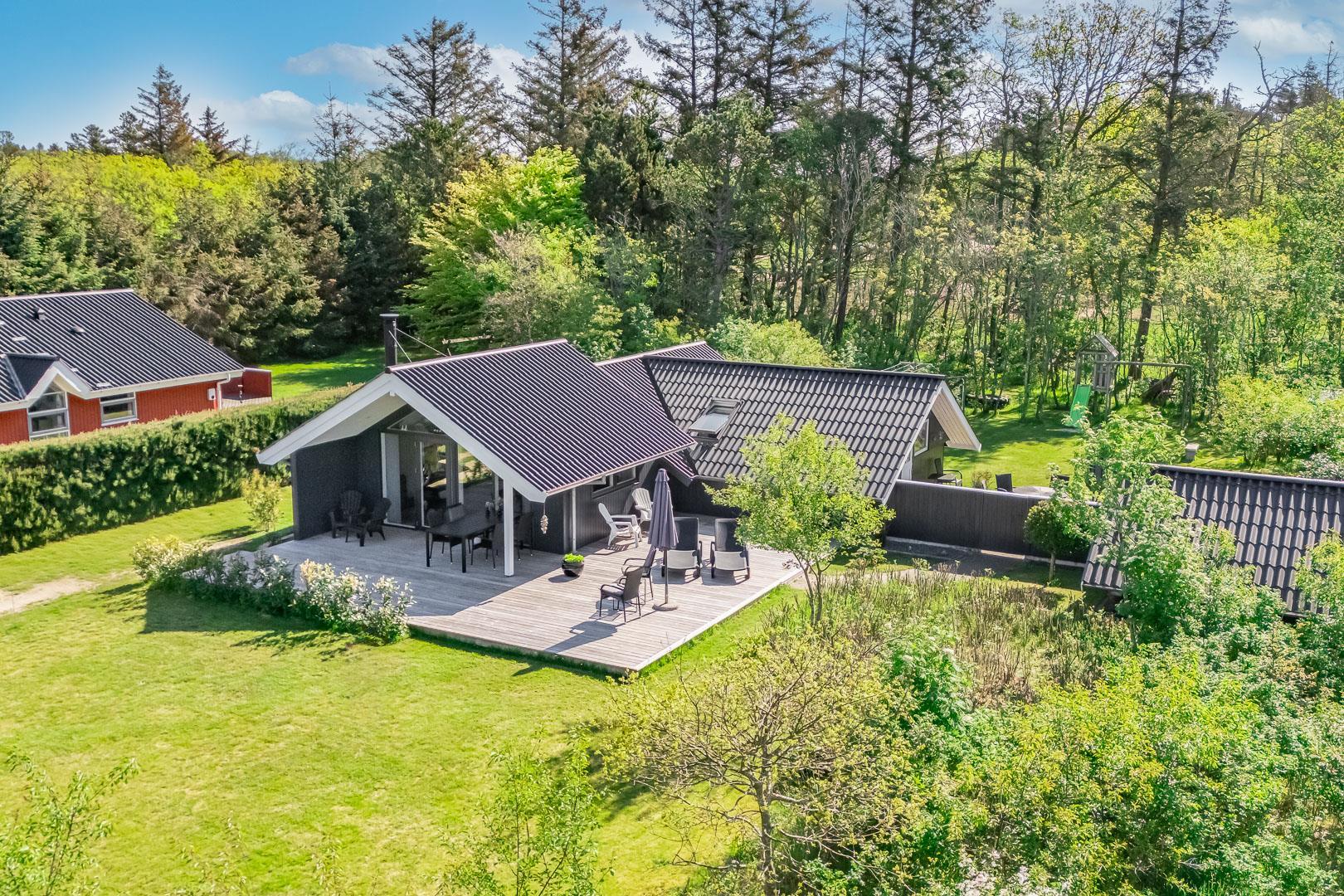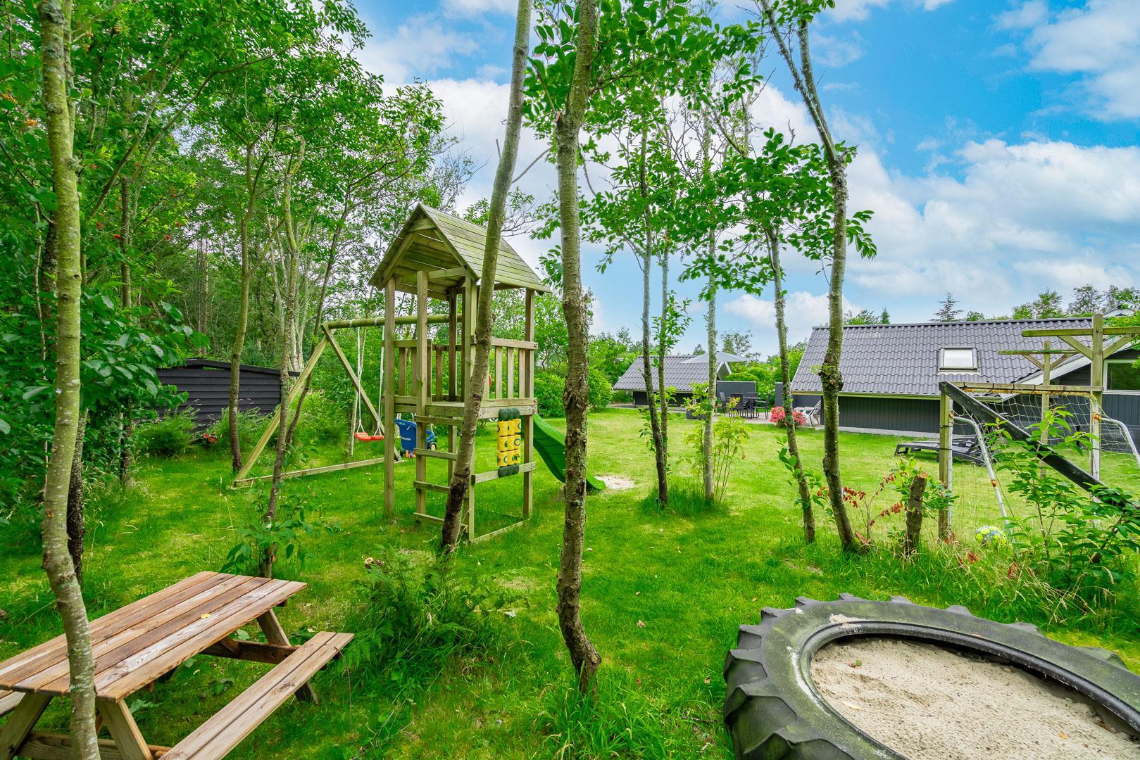 Den overdækkede terrasse gør det muligt at sidde ude og nyde den friske luft – også når vejret ikke er helt perfekt. Imens kan børnene lege på gyngen eller i sandkassen – ideelle rammer for en familieferie i Henne Strand.