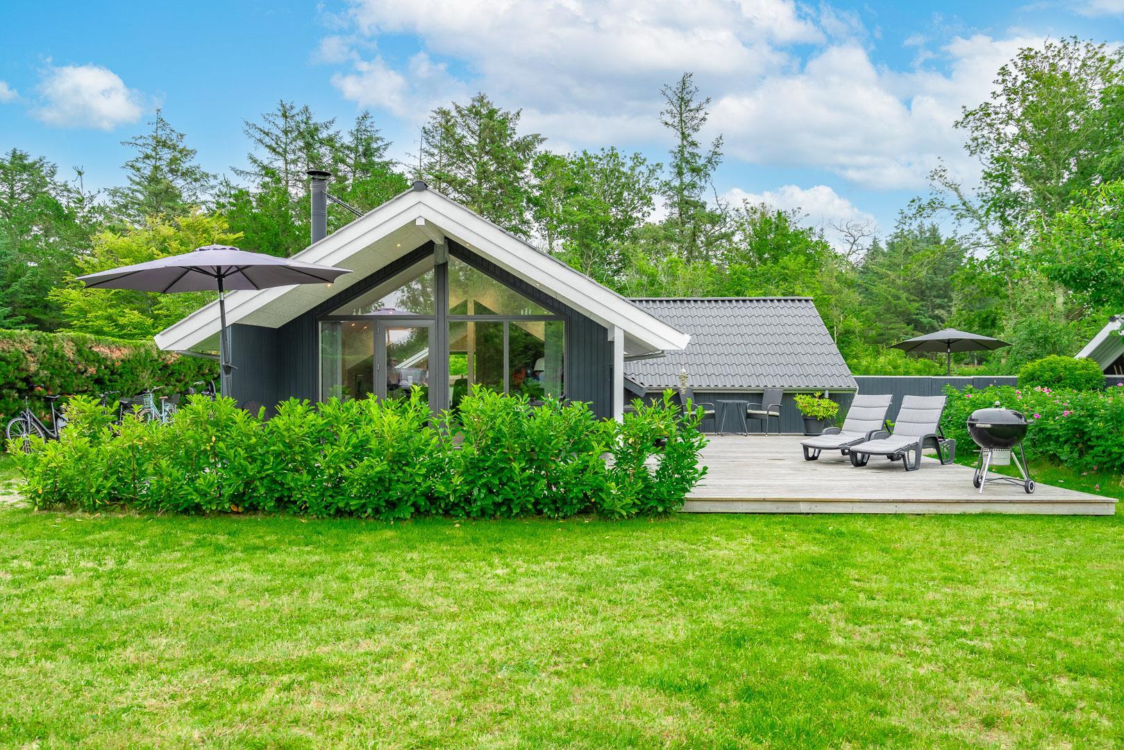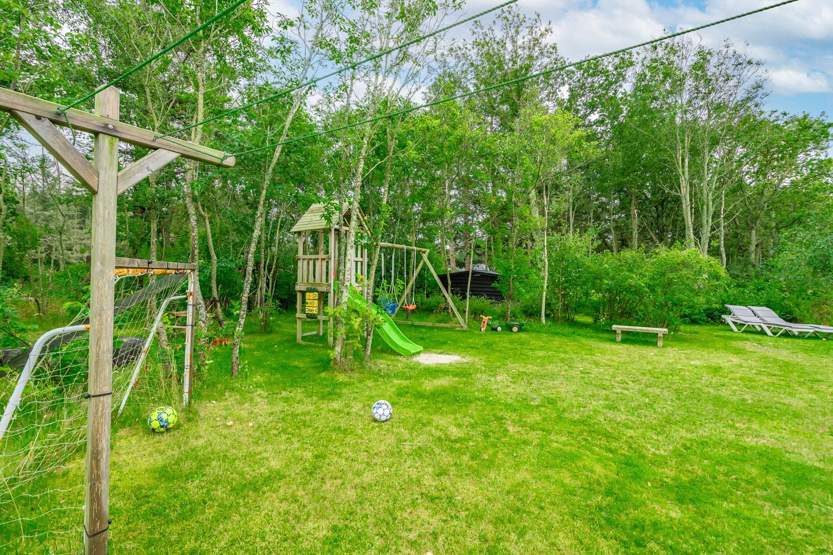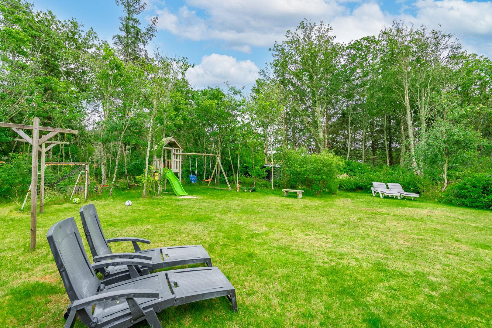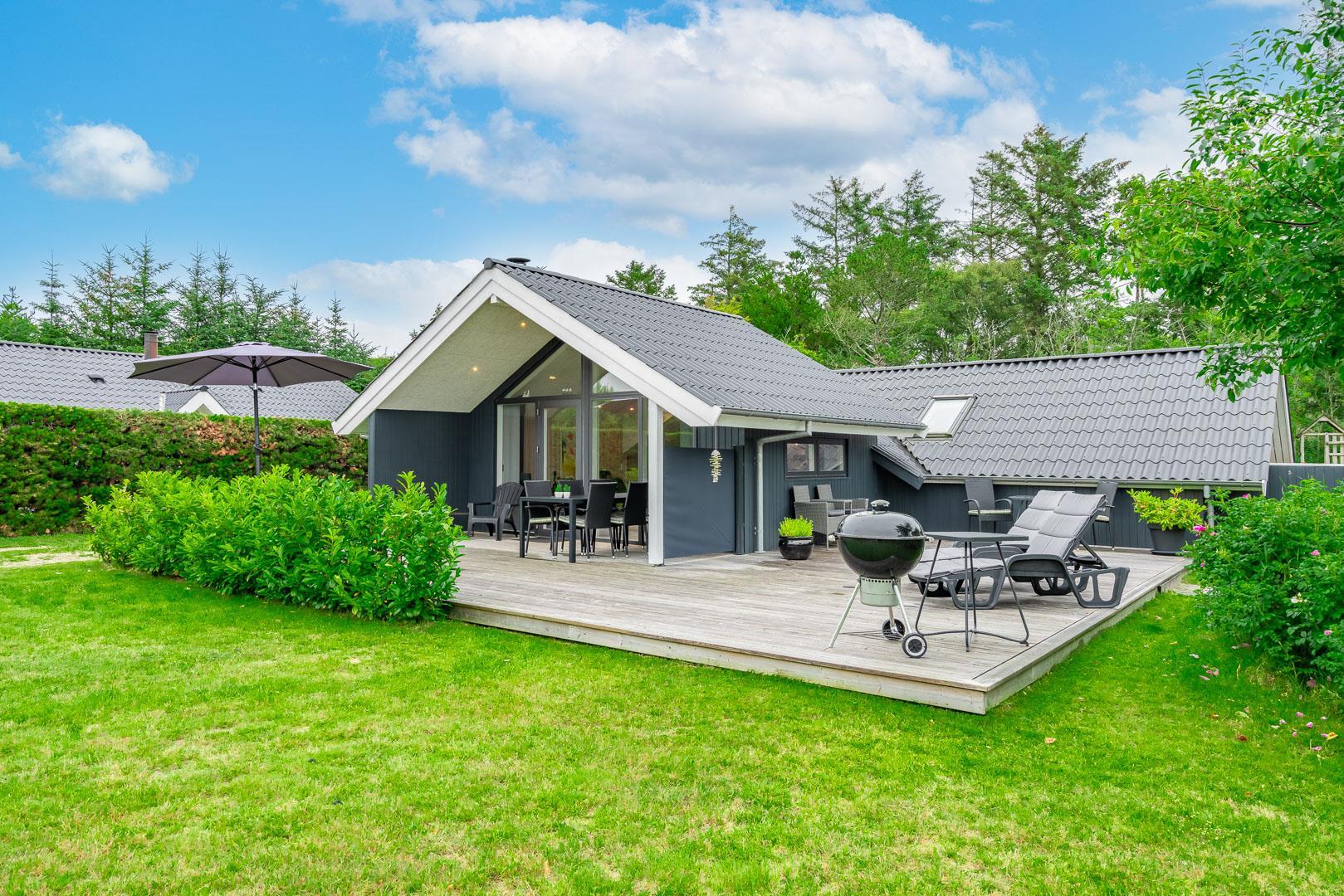 Den overdækkede terrasse gør det muligt at sidde ude og nyde den friske luft – også når vejret ikke er helt perfekt. Imens kan børnene lege på gyngen eller i sandkassen – ideelle rammer for en familieferie i Henne Strand.
