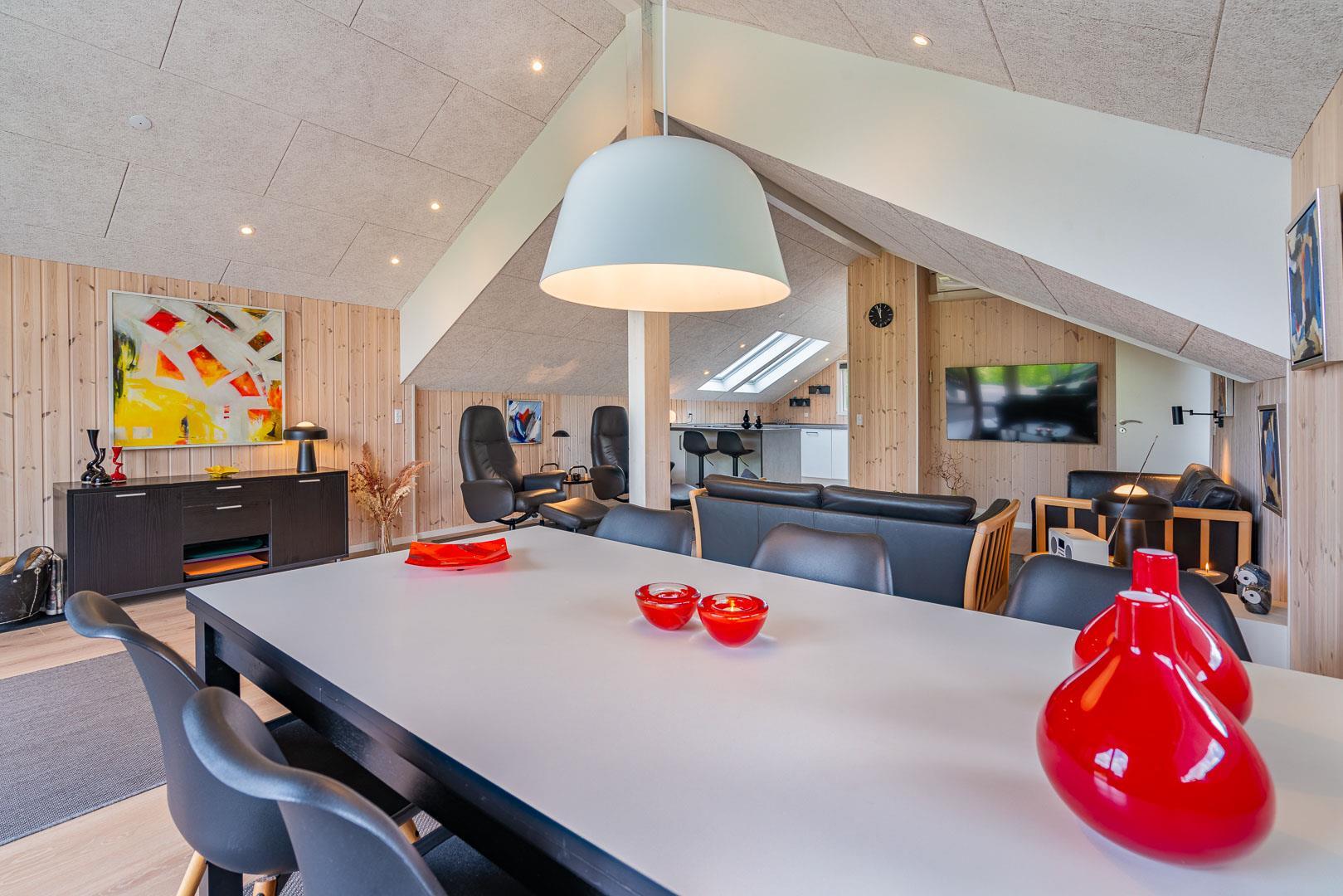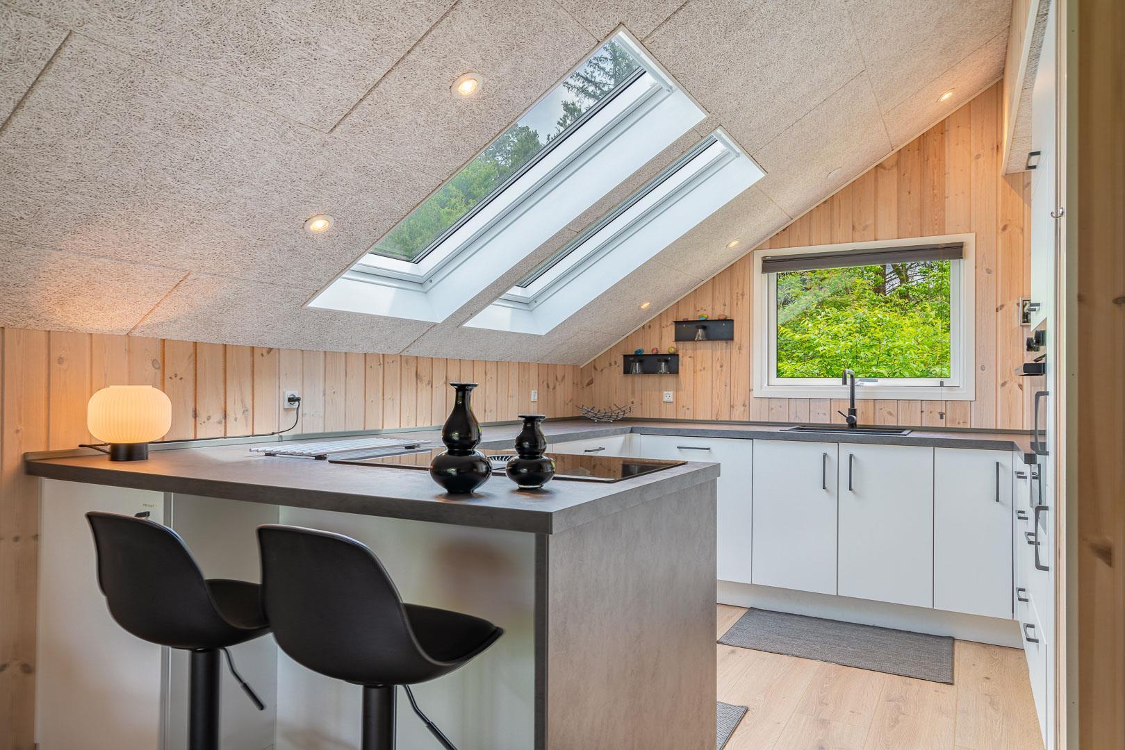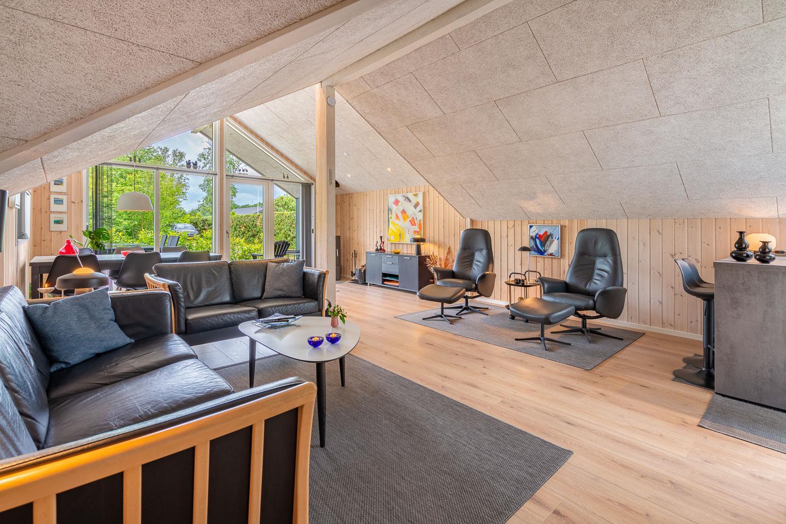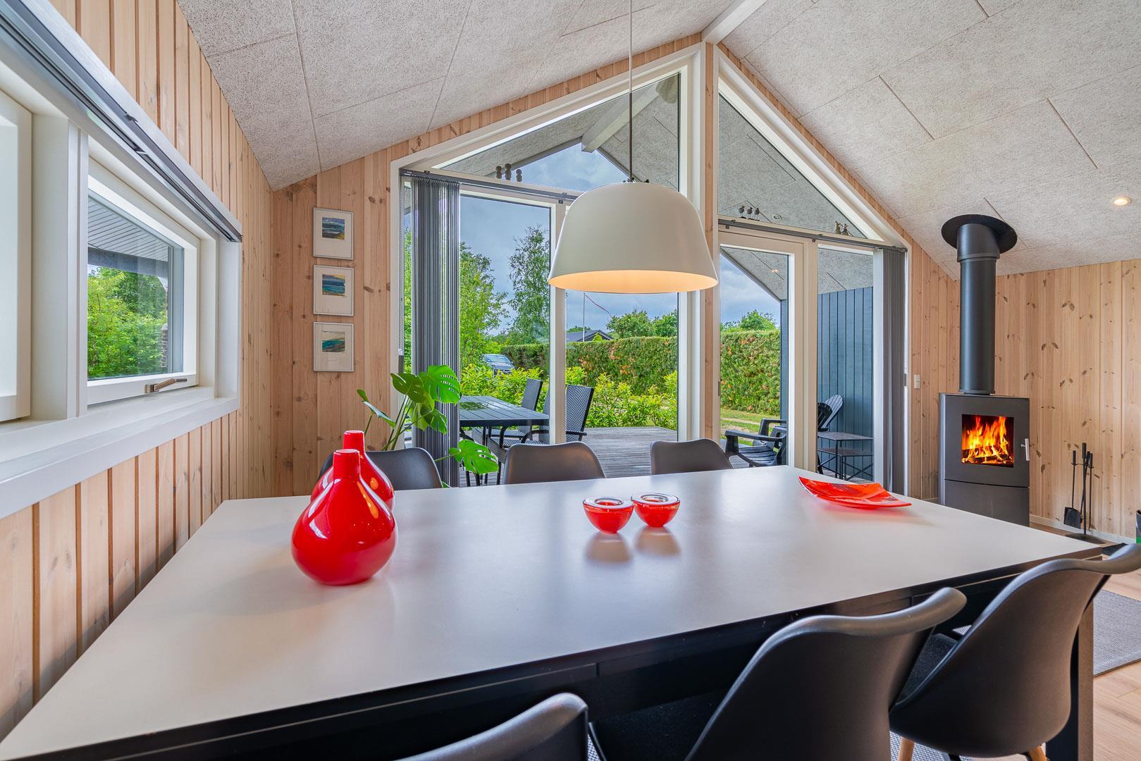 Det åbne opholds- og spiseområde byder på store vinduespartier, der lukker masser af lys ind og skaber en lys og indbydende atmosfære. Her kan I samles efter en dag ved havet, lave mad sammen eller bare slappe af. En varmepumpe sørger for et behageligt indeklima året rundt.