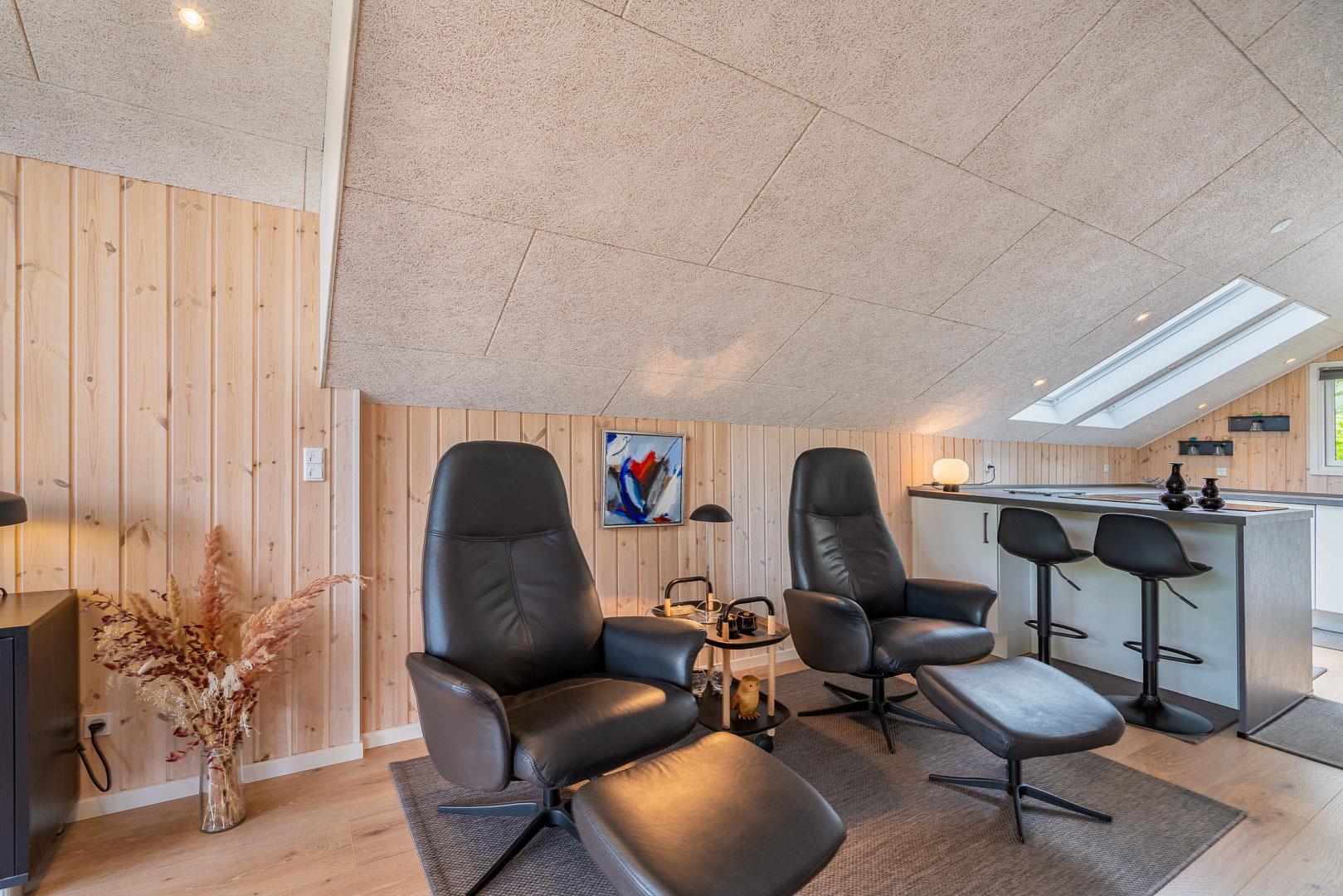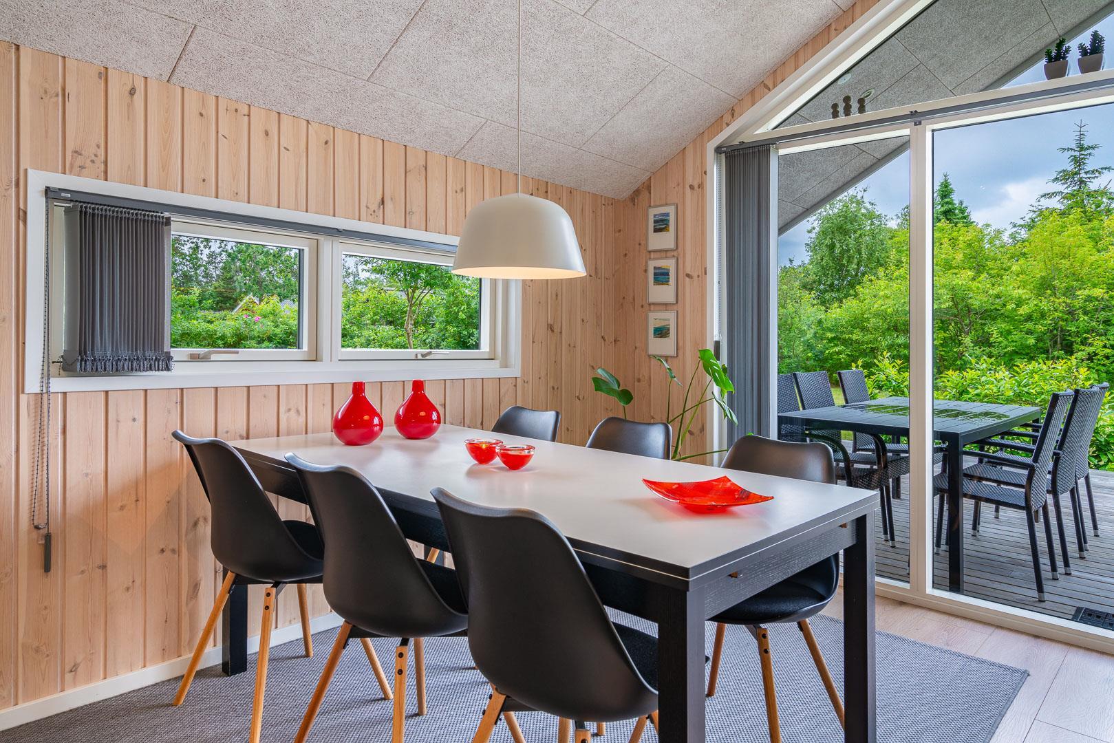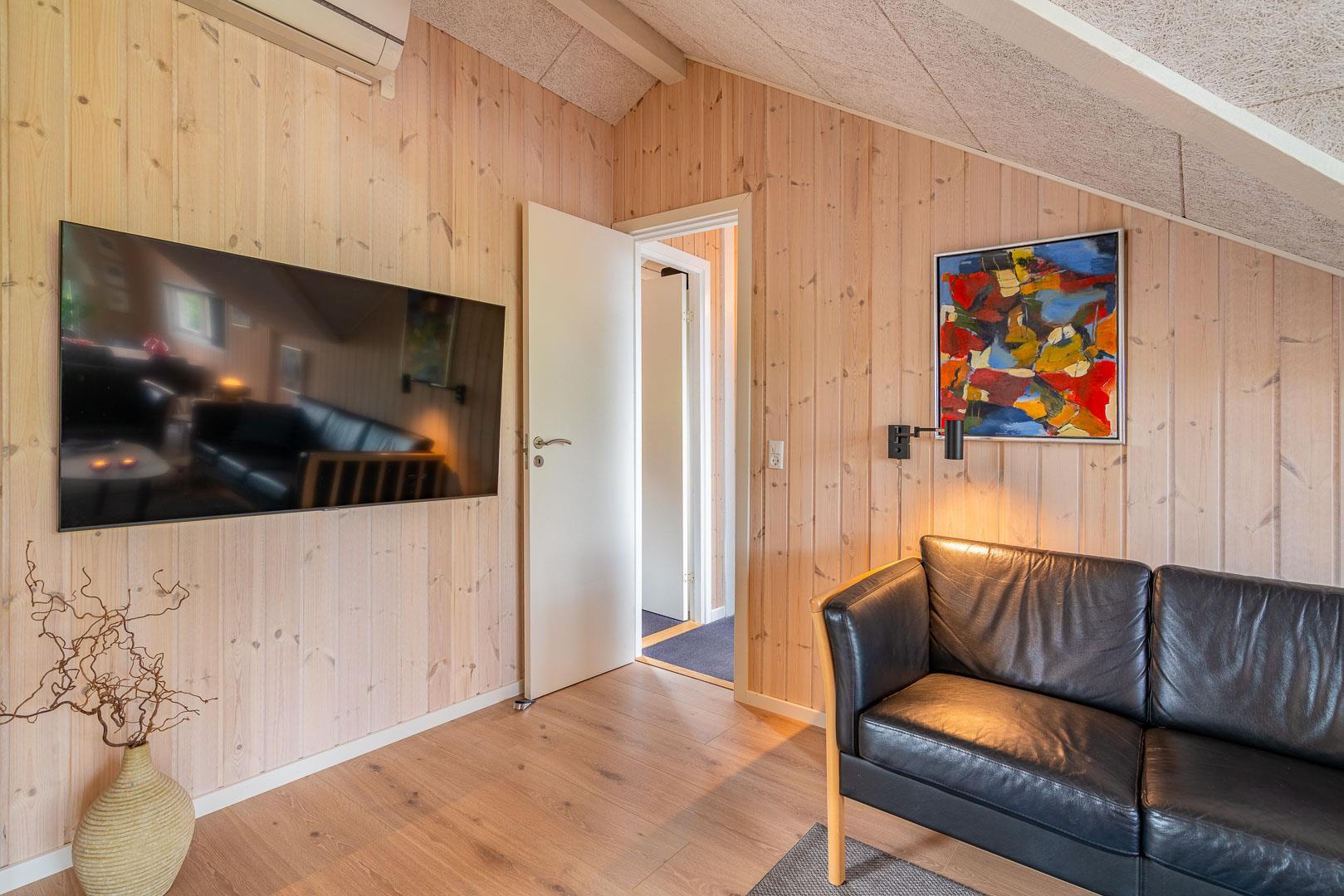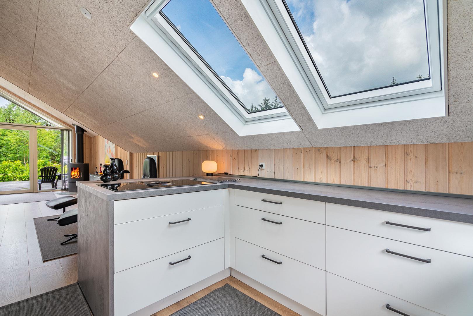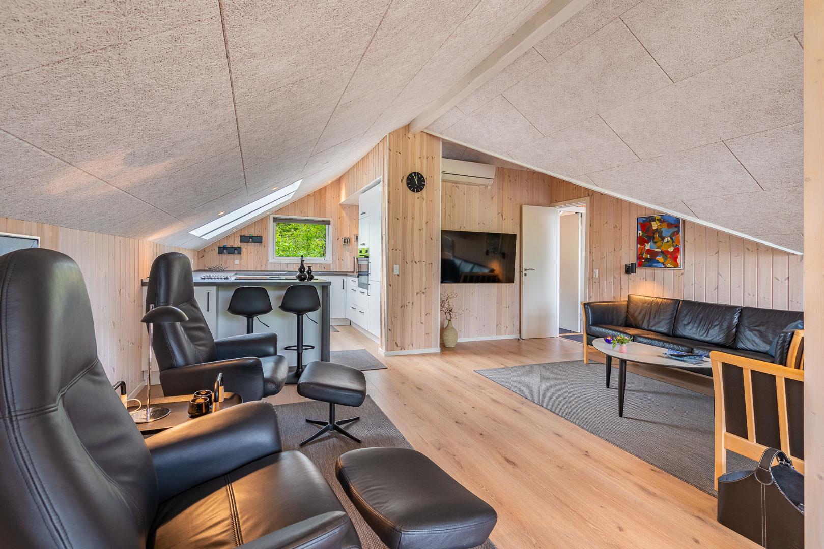 Det åbne opholds- og spiseområde byder på store vinduespartier, der lukker masser af lys ind og skaber en lys og indbydende atmosfære. Her kan I samles efter en dag ved havet, lave mad sammen eller bare slappe af. En varmepumpe sørger for et behageligt indeklima året rundt.