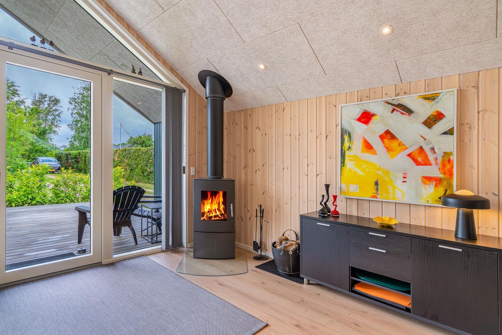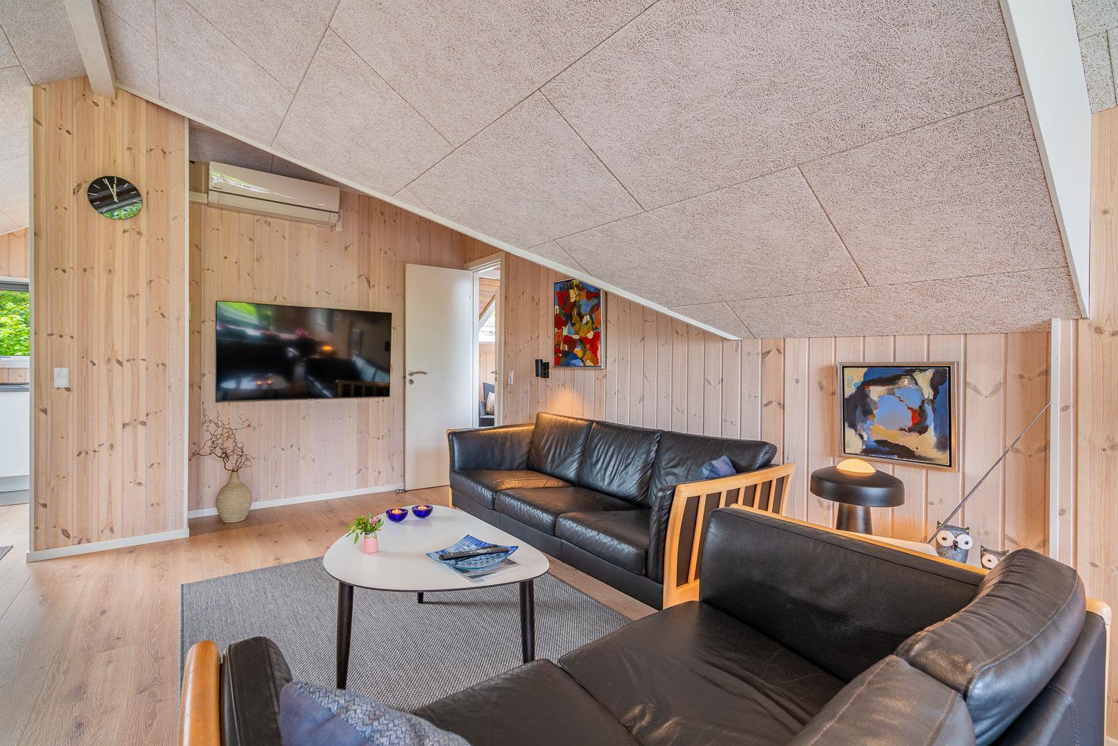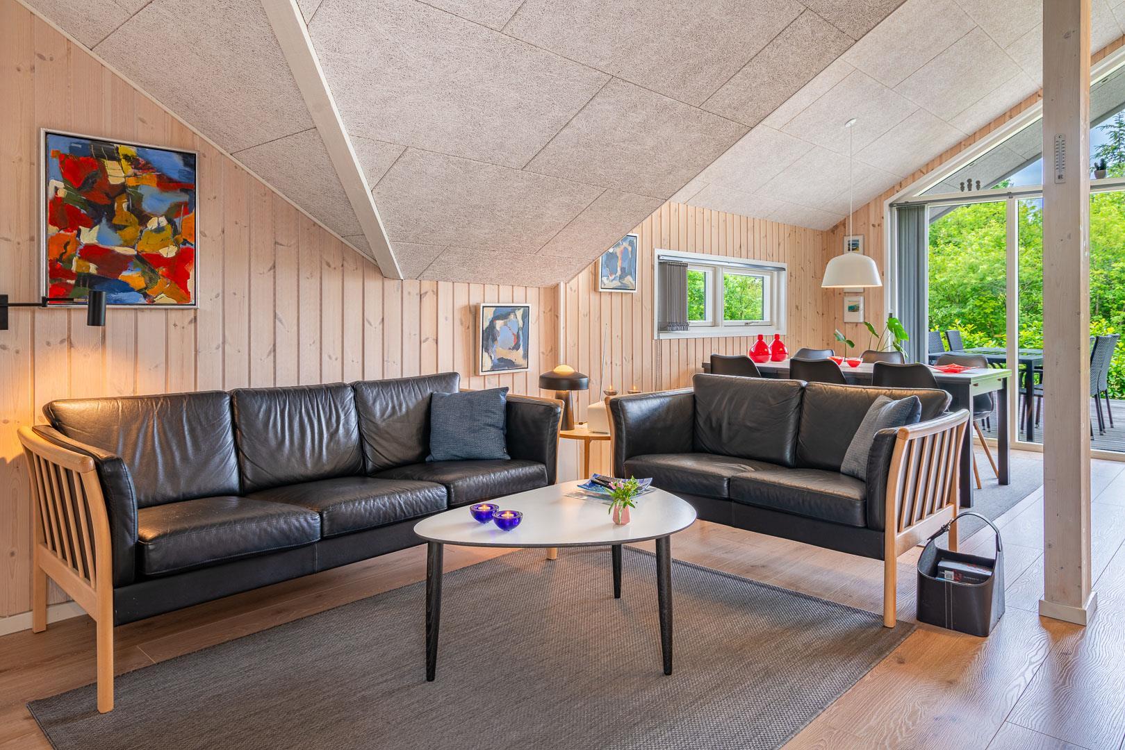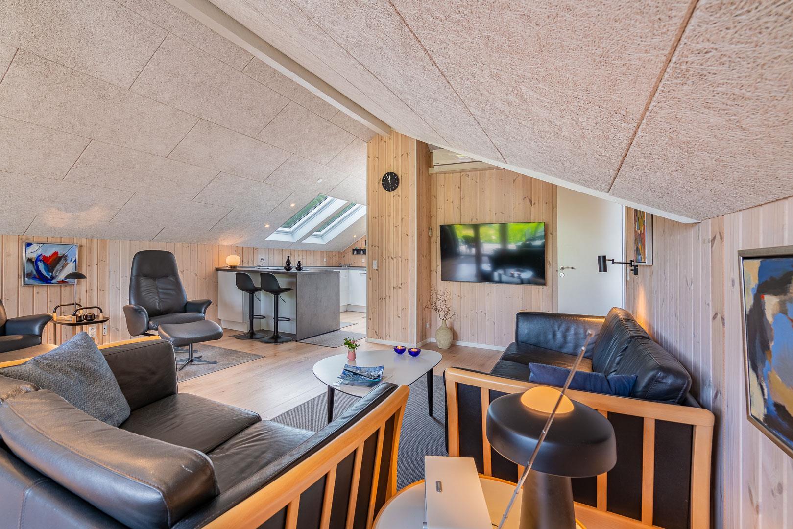 Det åbne opholds- og spiseområde byder på store vinduespartier, der lukker masser af lys ind og skaber en lys og indbydende atmosfære. Her kan I samles efter en dag ved havet, lave mad sammen eller bare slappe af. En varmepumpe sørger for et behageligt indeklima året rundt.