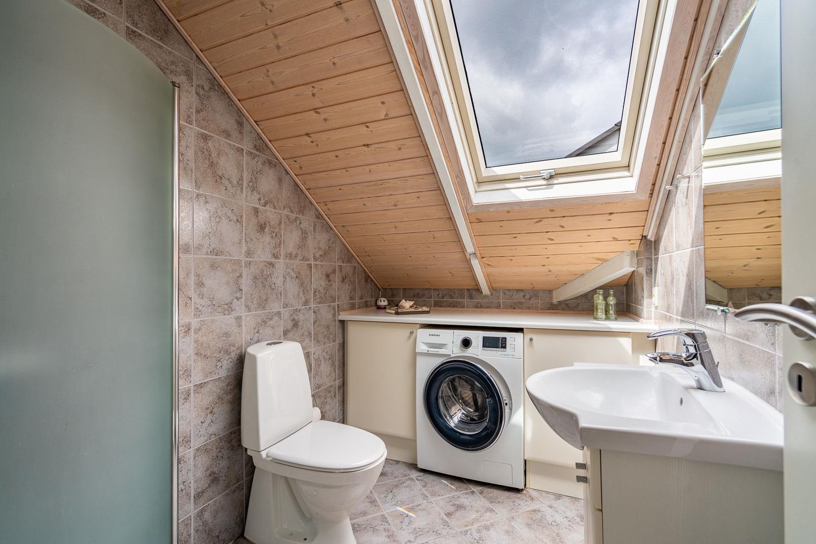 Badeværelset har gulvvarme, hvilket er ekstra skønt på kølige dage. Derudover er der praktiske faciliteter som vaskemaskine og værdiboks, som gør opholdet endnu mere bekvemt.