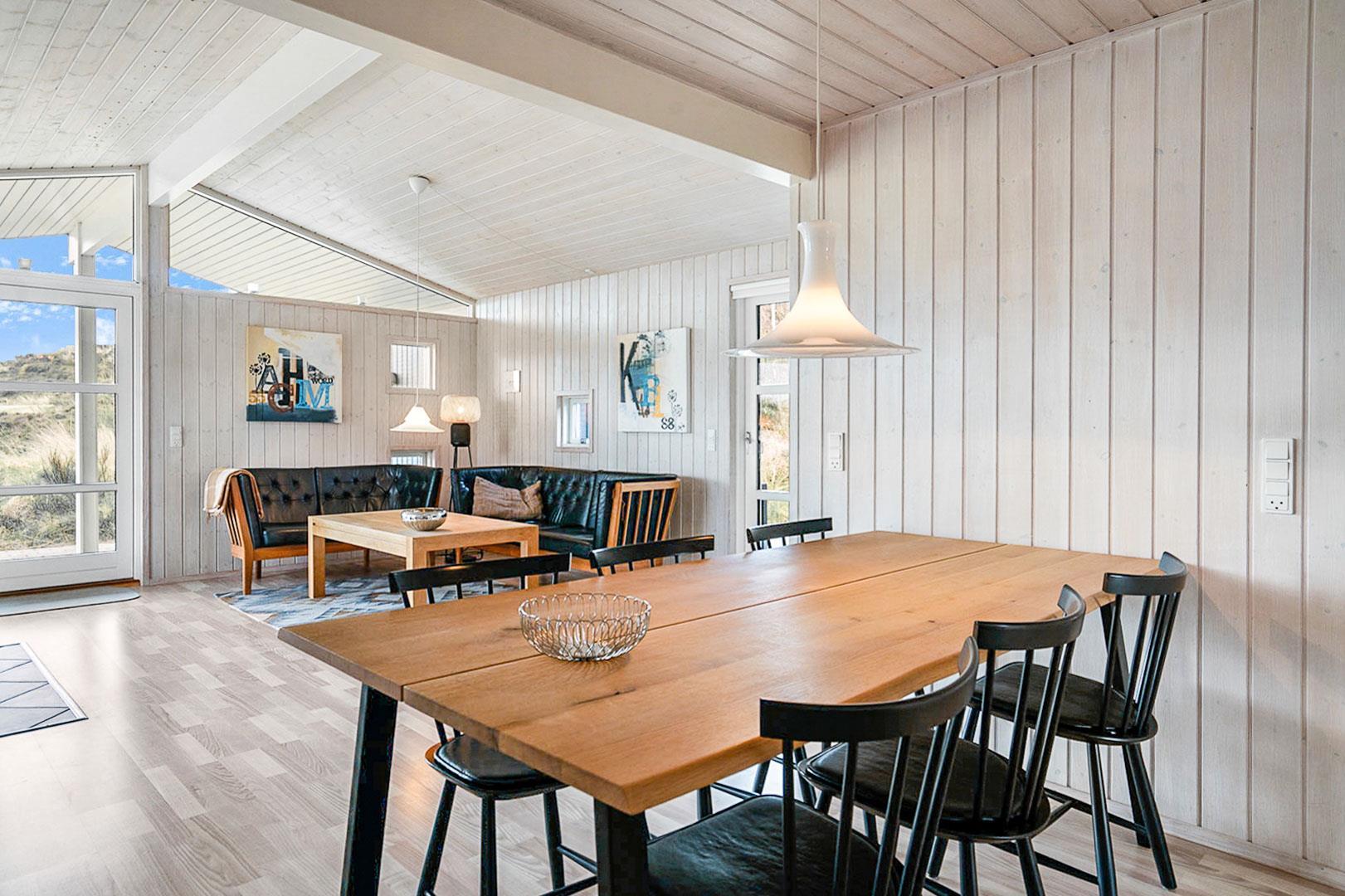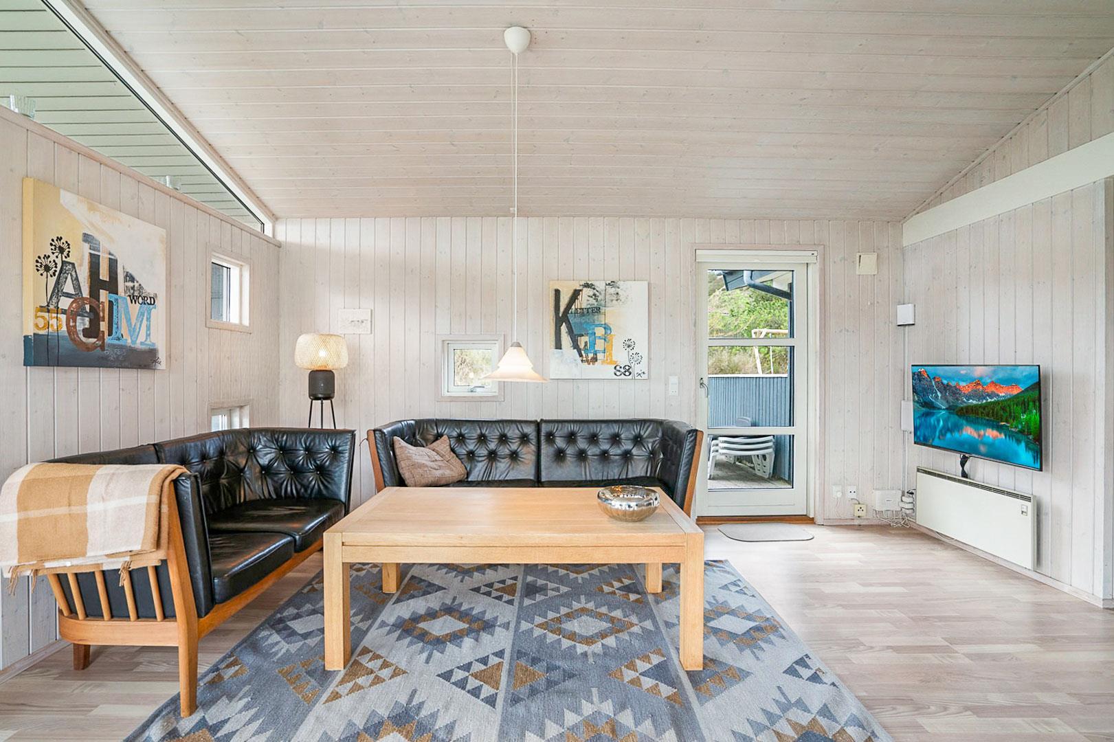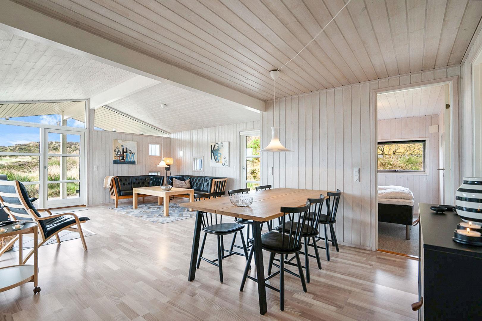 På en pragtfuld og ugeneret naturgrund ligger dette meget venlige og lyst indrettede feriehus. Huset har 2 badeværelser med gulvvarme. Lys stue med brændeovn og med direkte udgang til overdækket terrasse, samt udgang til ekstra ugenert mindre solterrasse.