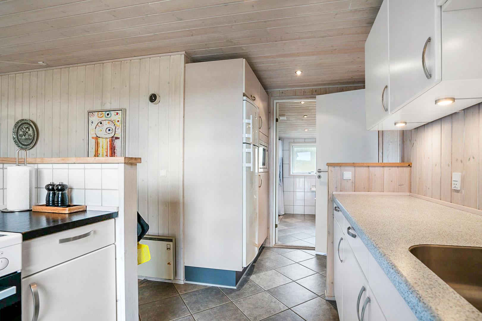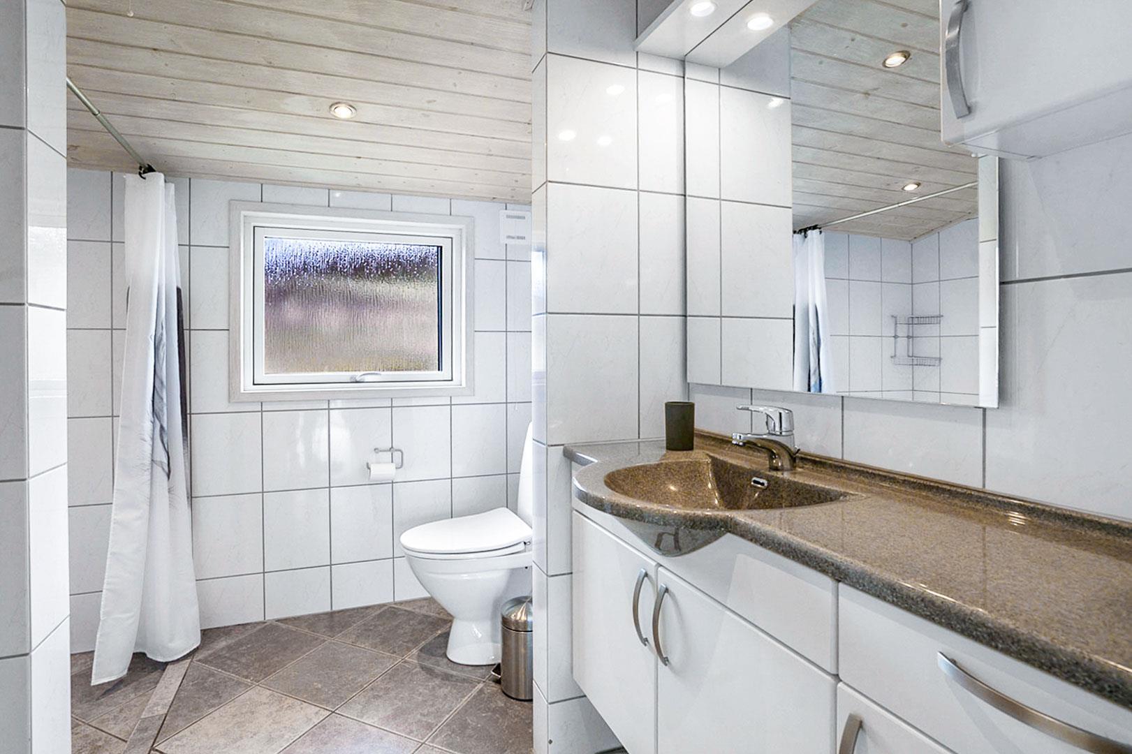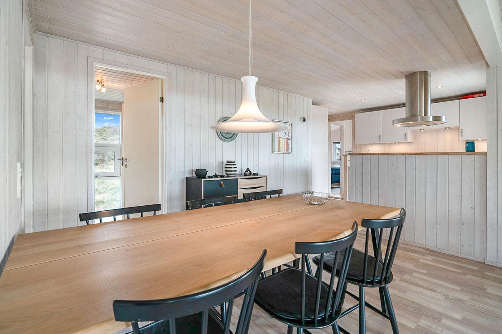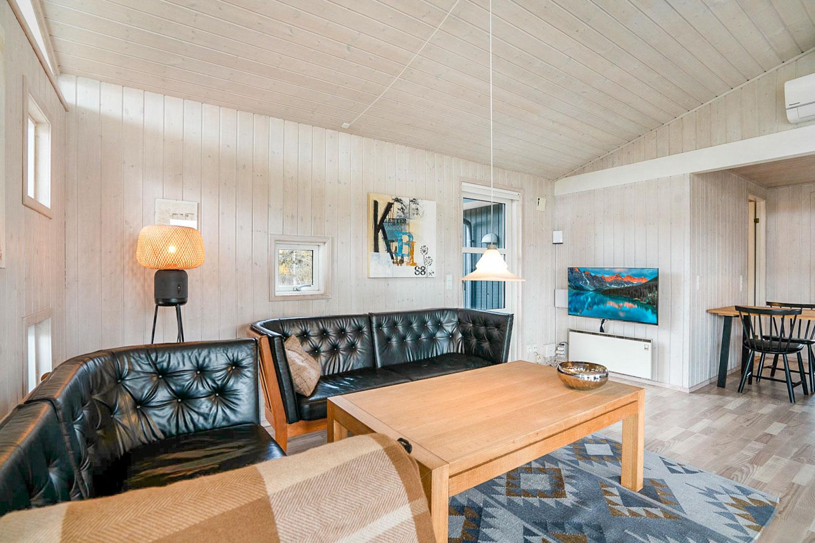 På en pragtfuld og ugeneret naturgrund ligger dette meget venlige og lyst indrettede feriehus. Huset har 2 badeværelser med gulvvarme. Lys stue med brændeovn og med direkte udgang til overdækket terrasse, samt udgang til ekstra ugenert mindre solterrasse.