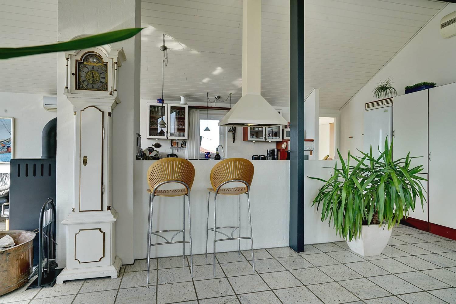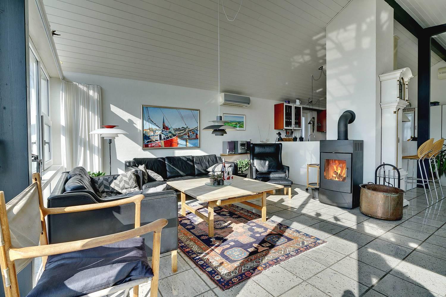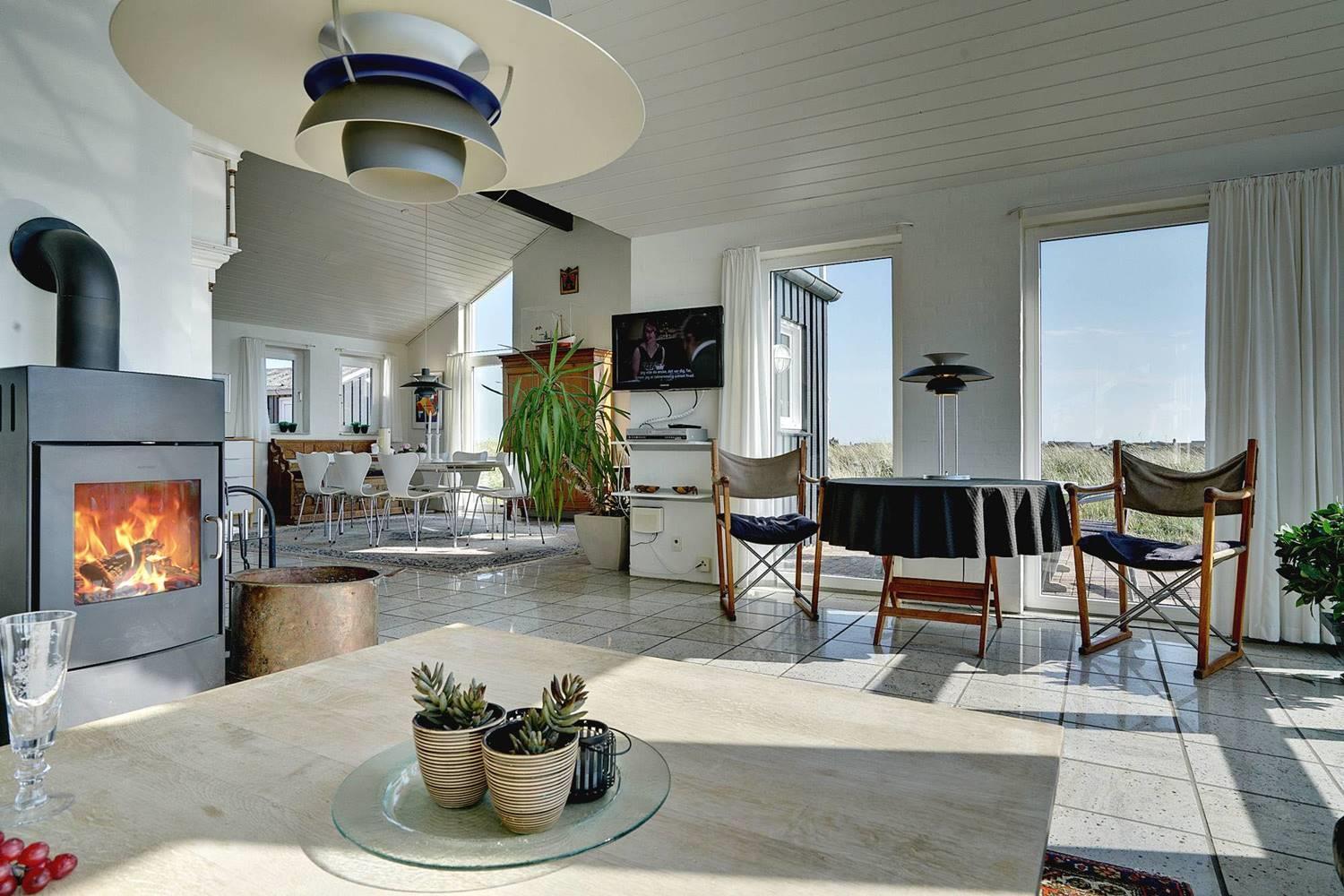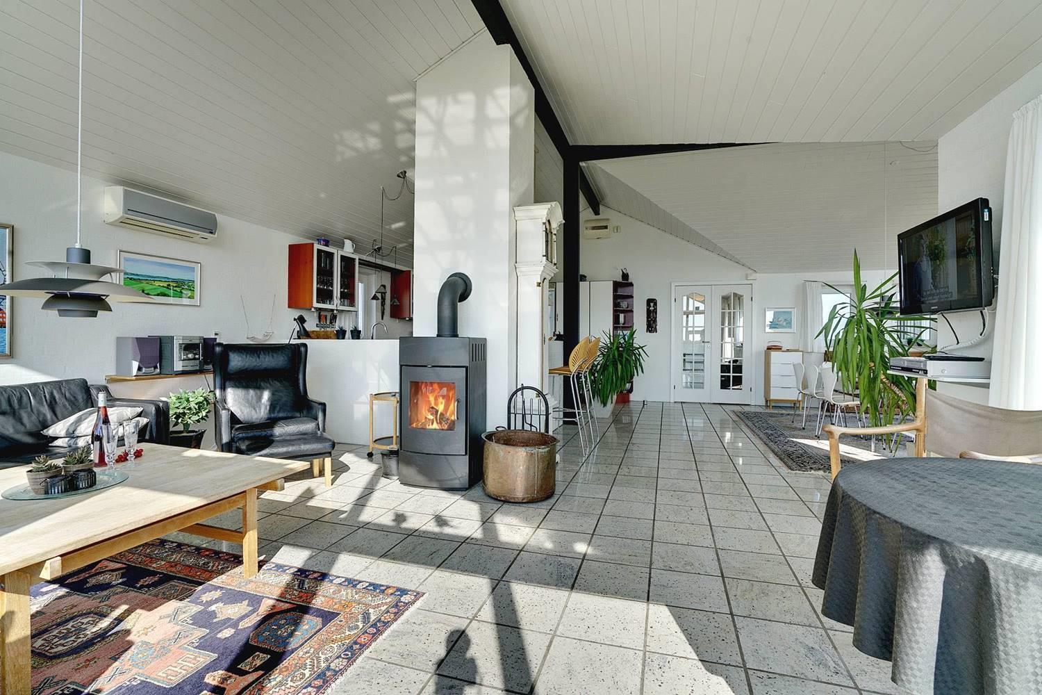 Indenfor i sommerhuset er der en helt særlig atmosfære, som nok i særdeleshed skyldes det specielle lys, der er højt i terrænet. Her er hverken støjforurening eller naboer tæt på, der kan forstyrre, så det føles virkelig som at være ét med naturen, når man sidder i stuen. Sommerhuset er skønt at besøge hele året rundt, da her er hyggelig brændeovn og sauna - og udsigten bliver bestemt ikke bliver mindre fantastisk, når regnen pisker mod det kæmpestore vinduesparti!