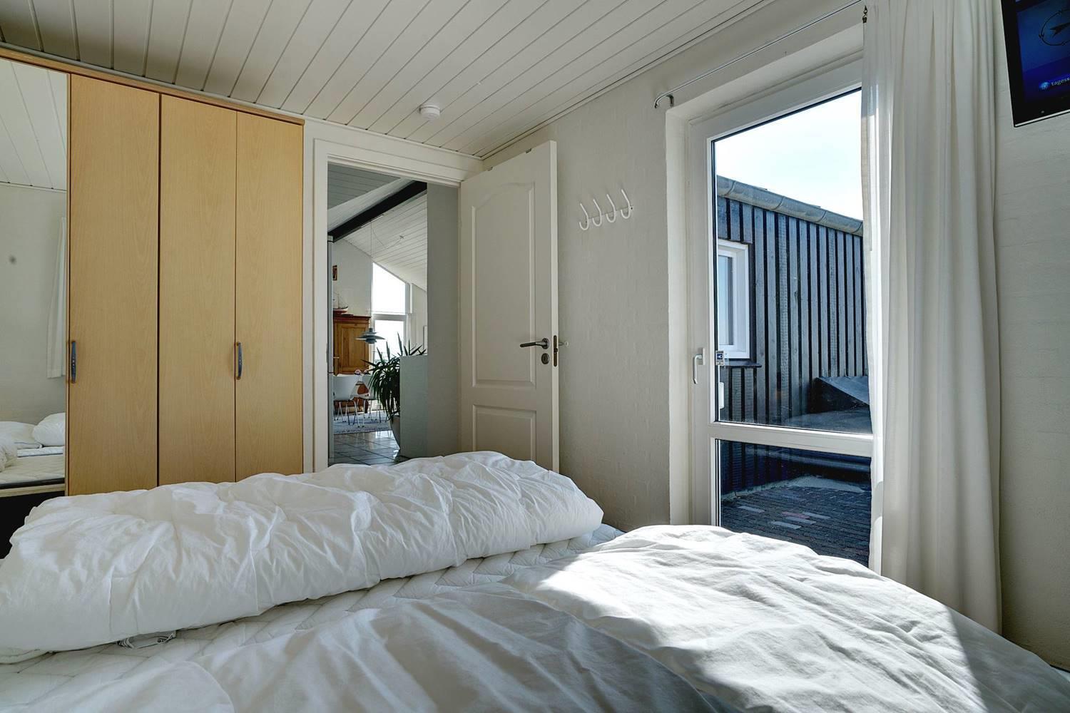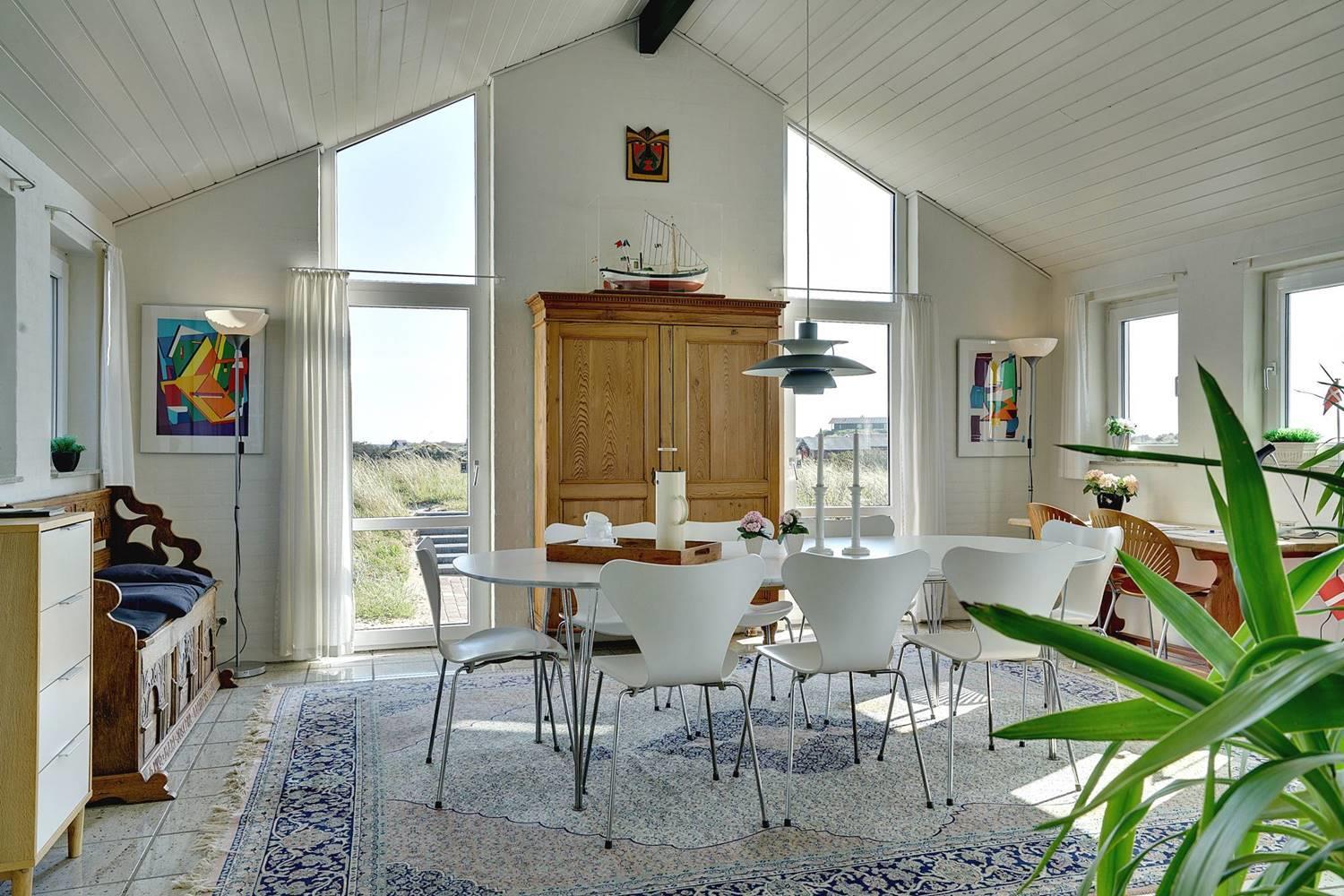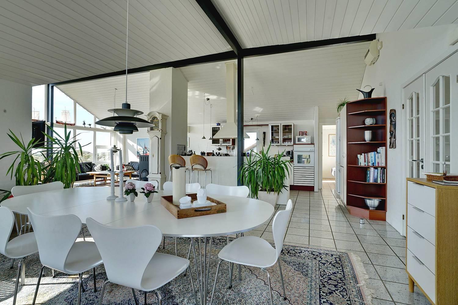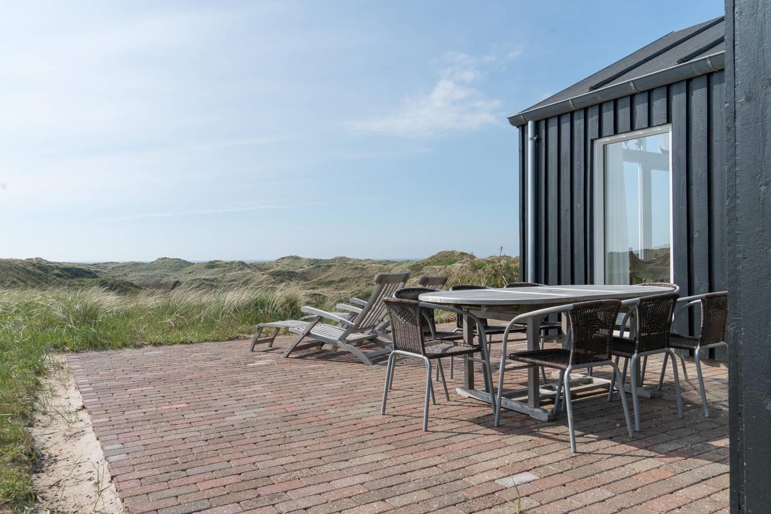 På toppen af en højtliggende grund lige midt i Henne Strands eventyrlige klitlandskab ligger denne fantastiske perle af et feriehus. Fra stort set alle rum er der den smukkeste havudsigt over Vesterhavet og de fredede grønklædte klitter, og hvis I følger den lille strandsti, der starter, hvor grunden slutter, kan I hoppe direkte i bølgen blå. Der er hele otte faste sovepladser i alt, så I kan endda invitere venner eller familie med. Huset er handicapvenligt med rampe til brugere af kørestol.
